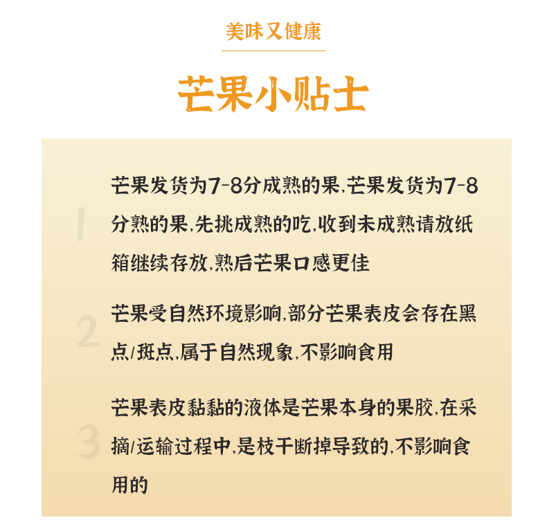 芒果发货为7-8分成熟的果,先挑成熟的吃,收到未成熟请放纸箱继续存放催熟,熟后芒果口感更佳