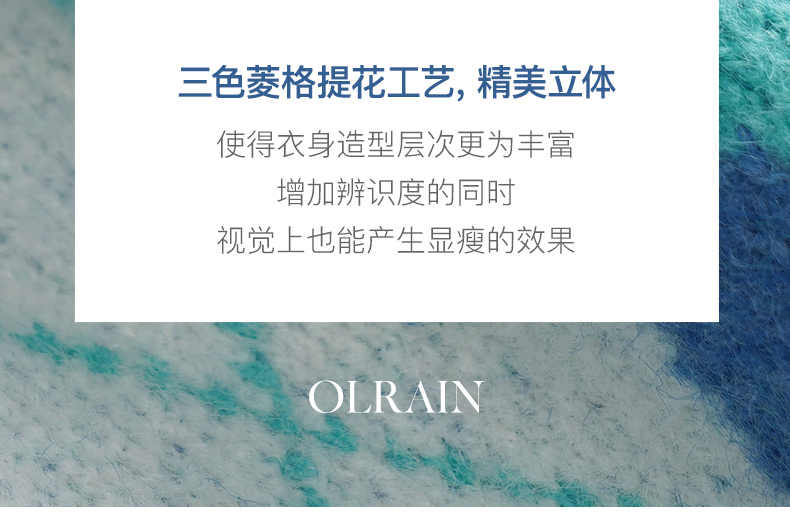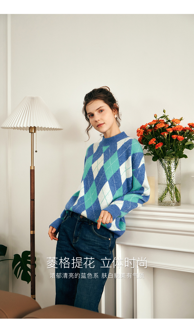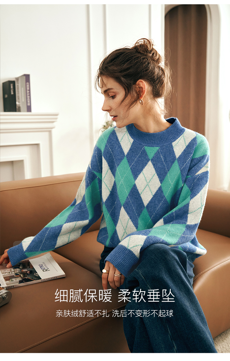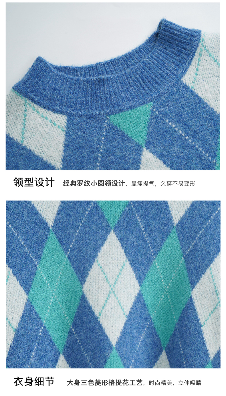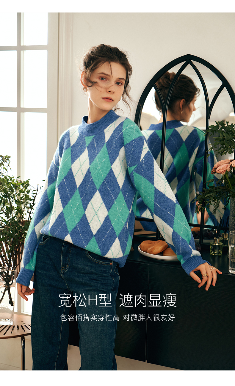 OLrain欧芮儿蓝色软糯毛衣女秋冬2023新款宽松菱格提花毛织套头衫
