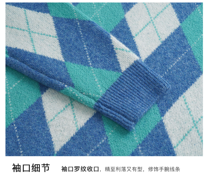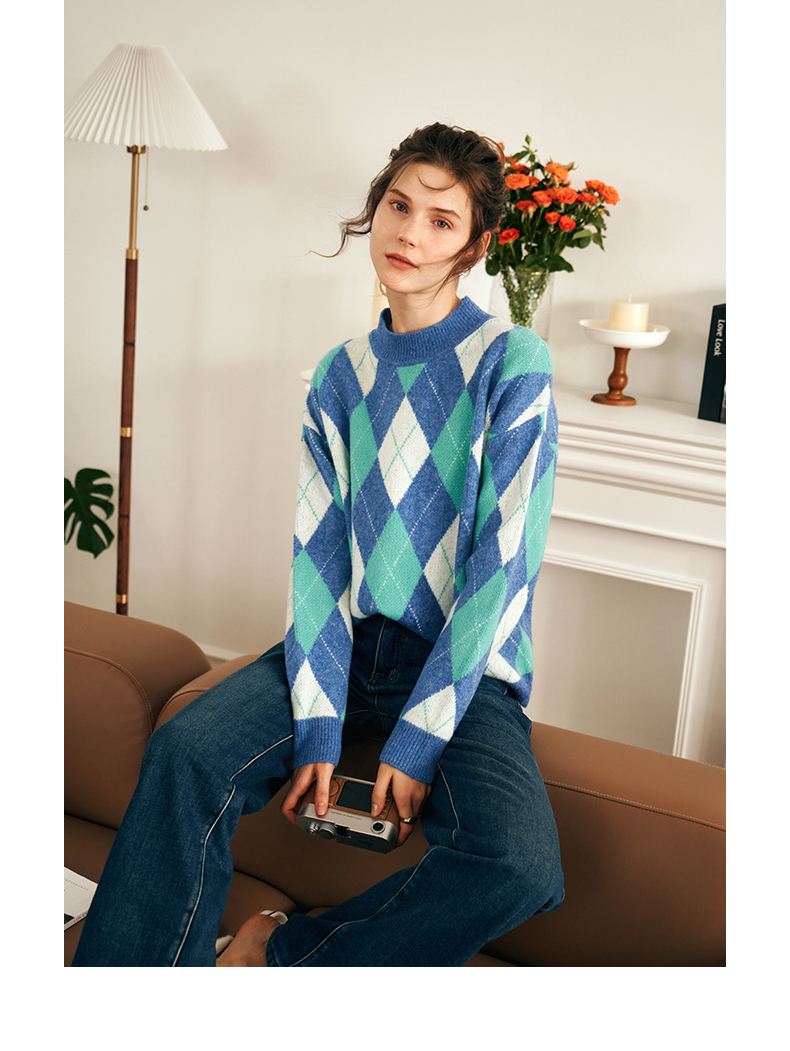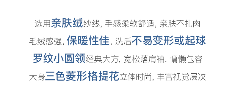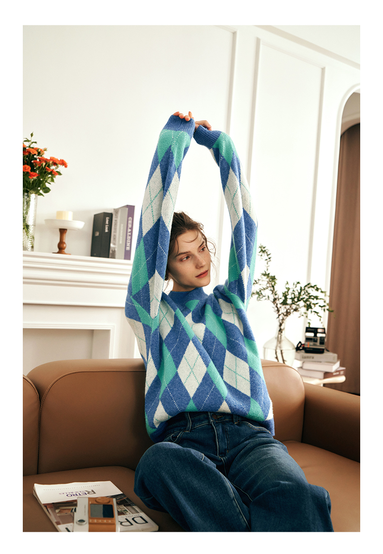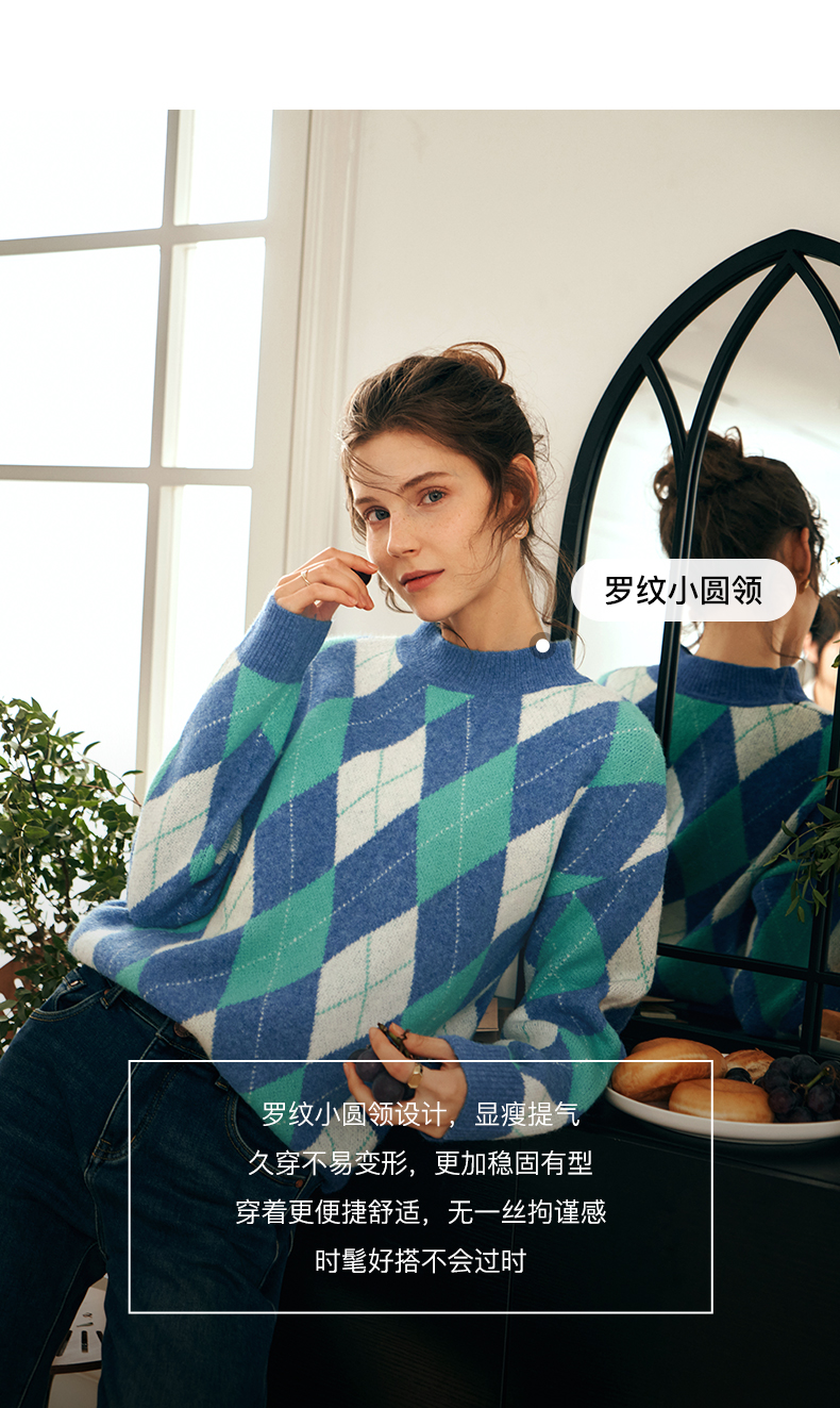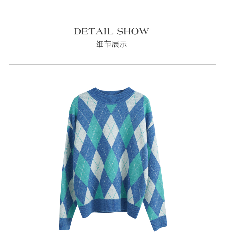 OLrain欧芮儿蓝色软糯毛衣女秋冬2023新款宽松菱格提花毛织套头衫