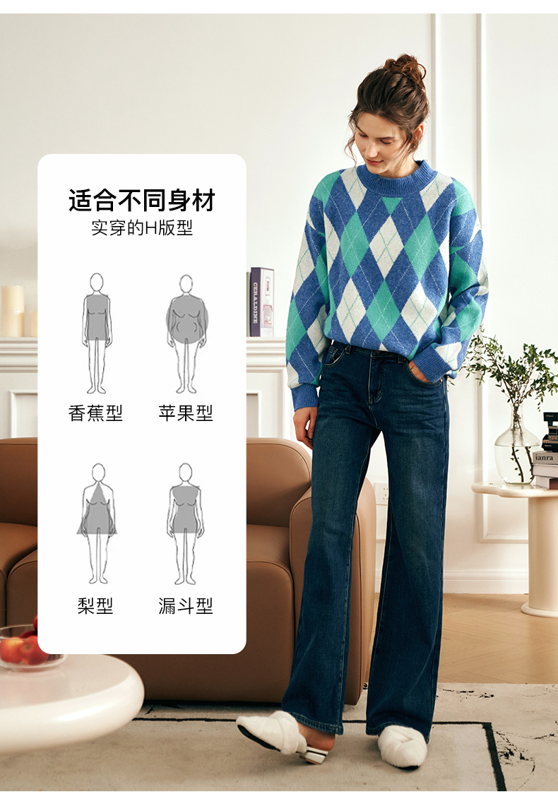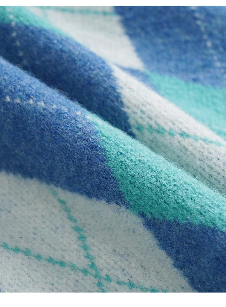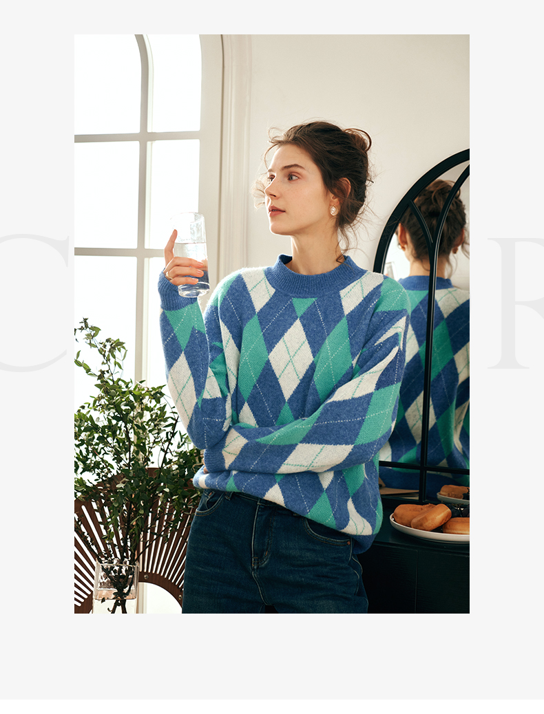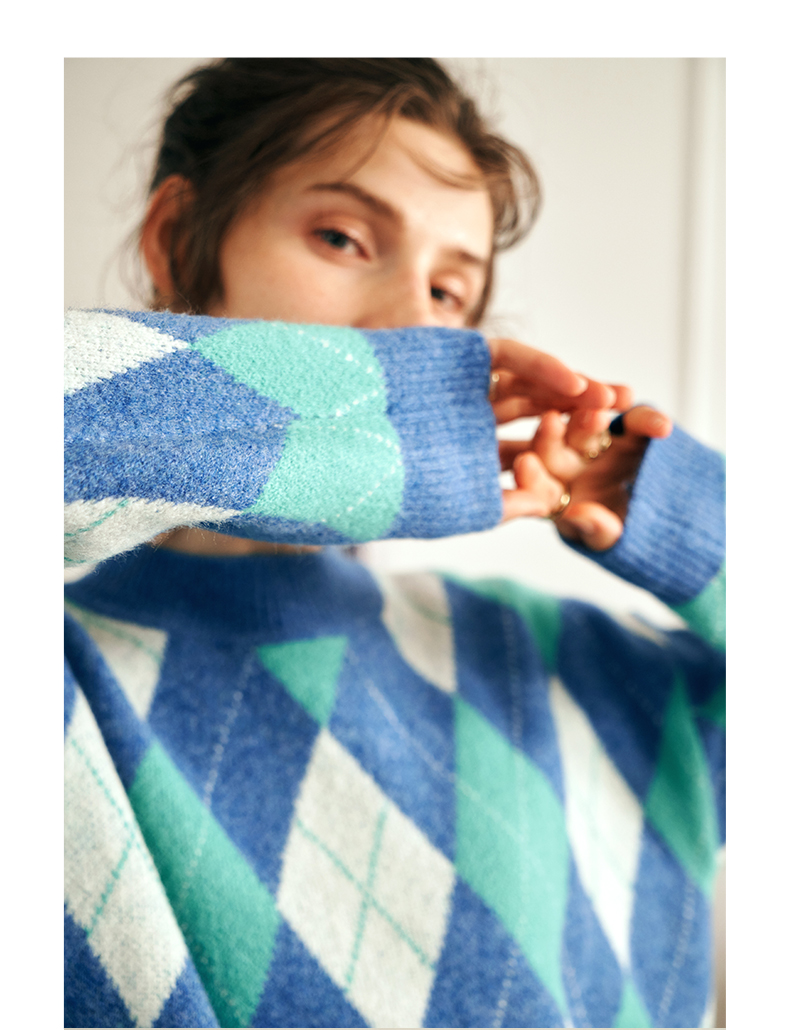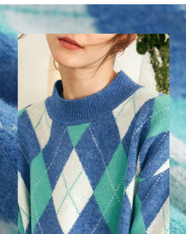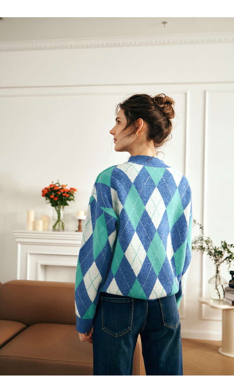 OLrain欧芮儿蓝色软糯毛衣女秋冬2023新款宽松菱格提花毛织套头衫