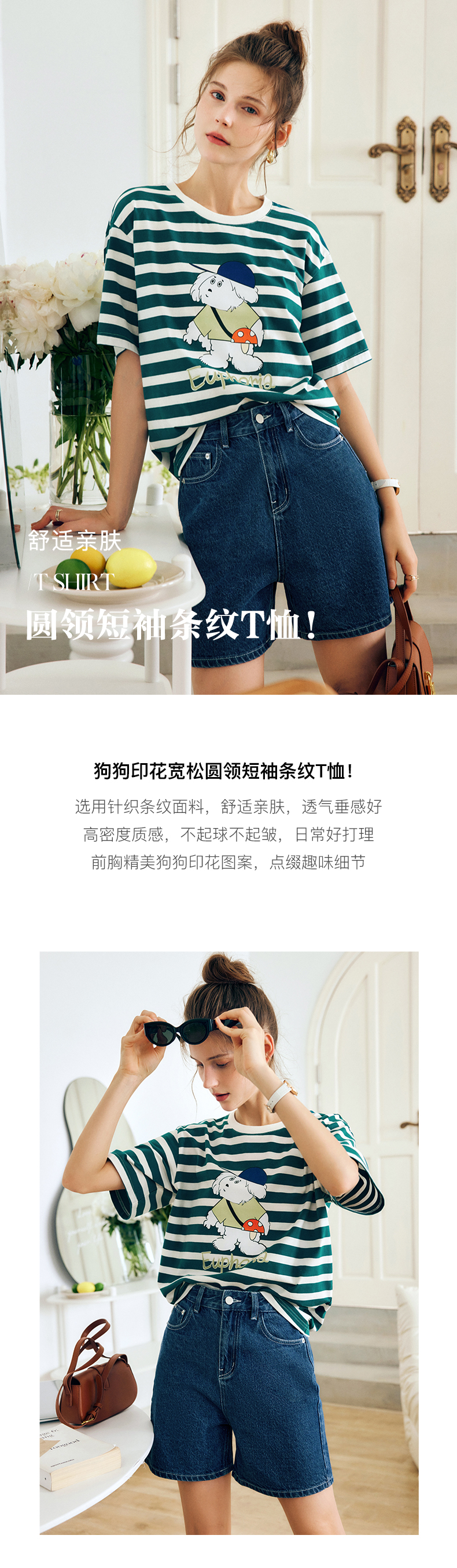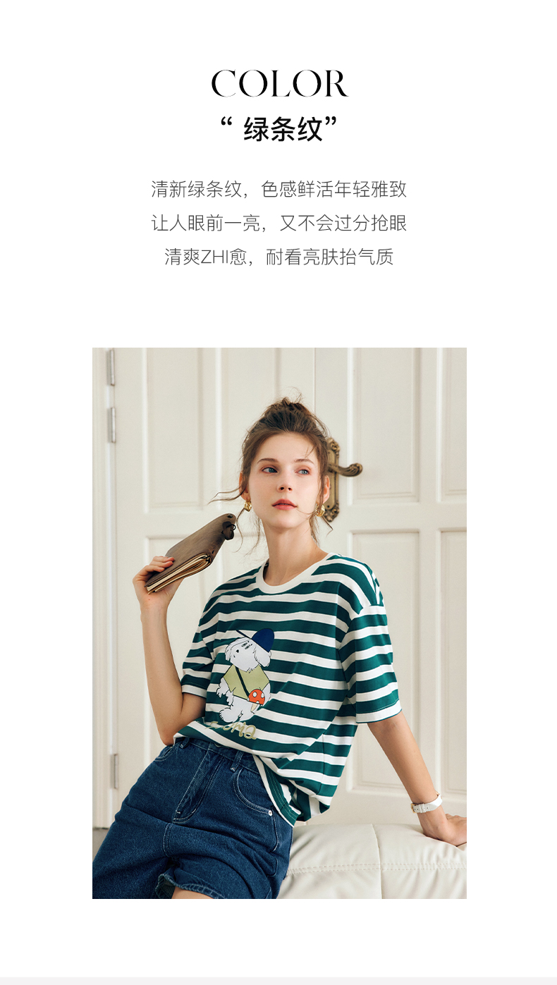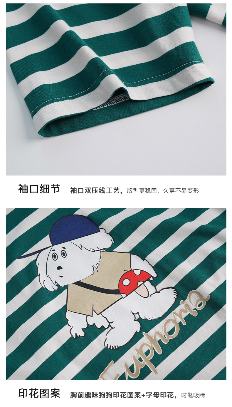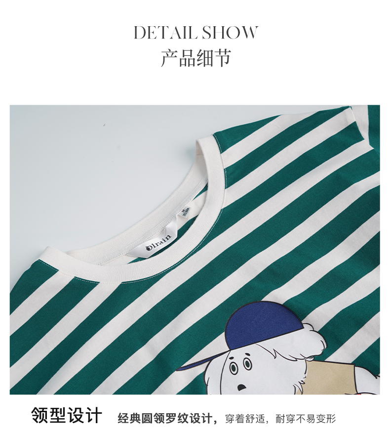 OLrain法式条纹短袖T恤女夏季2022新款宽松显瘦狗狗印花圆领上衣