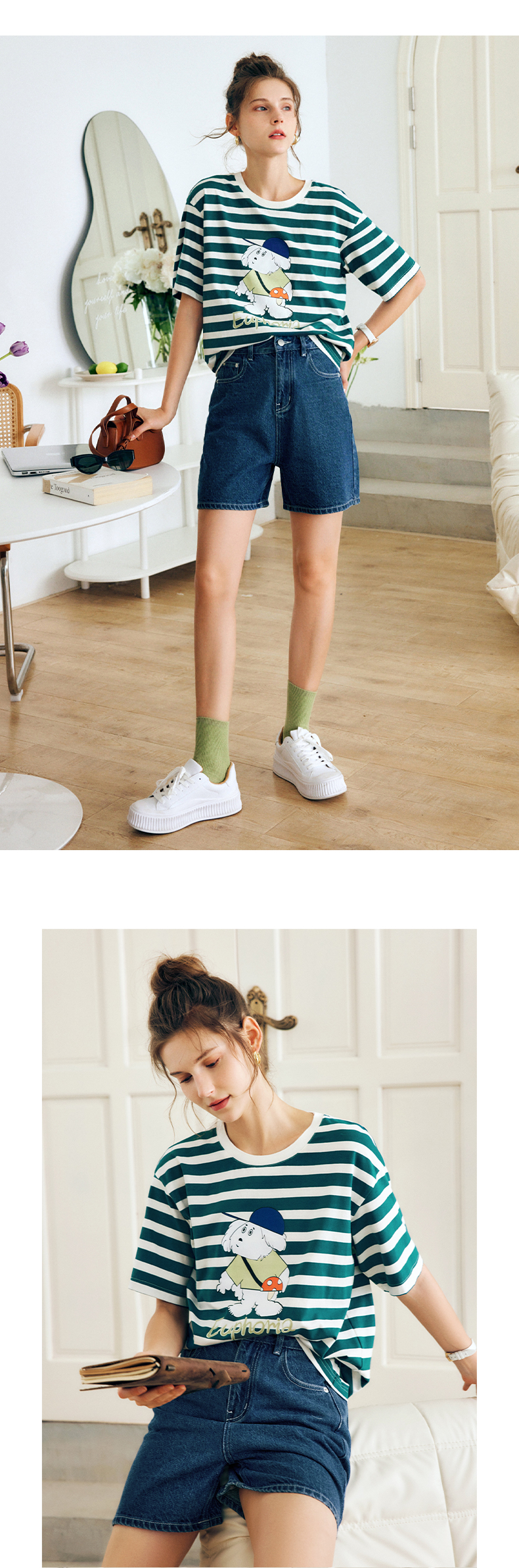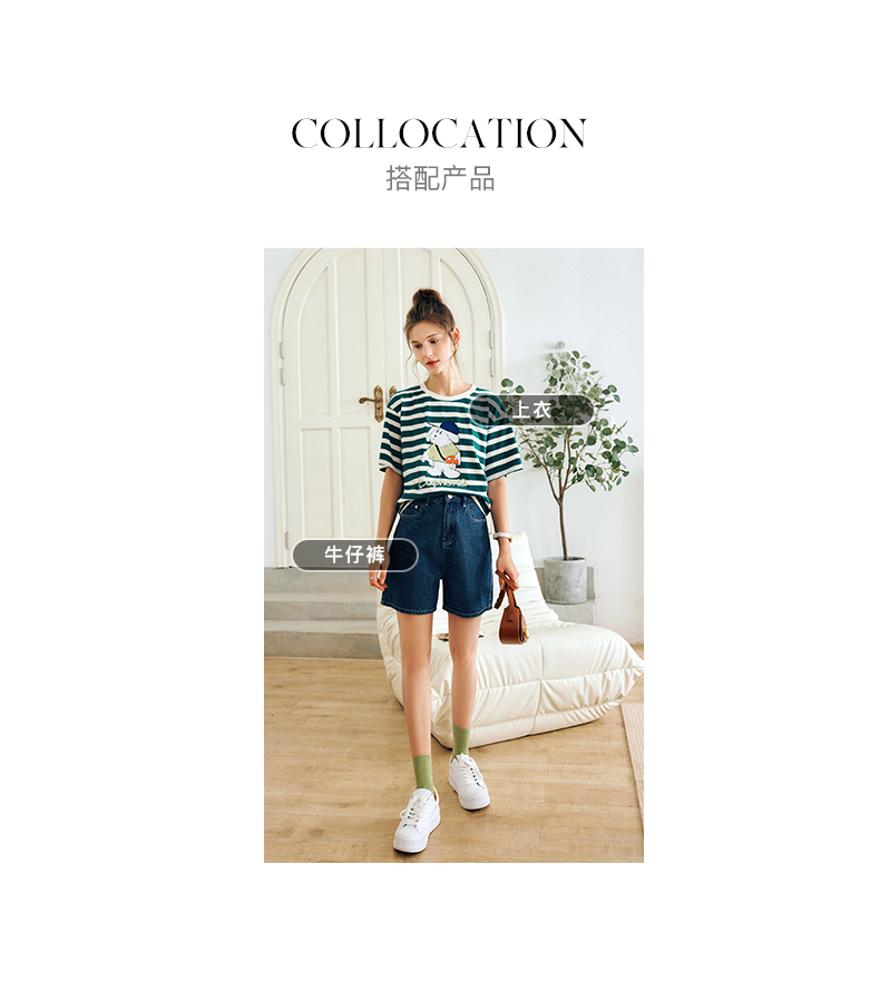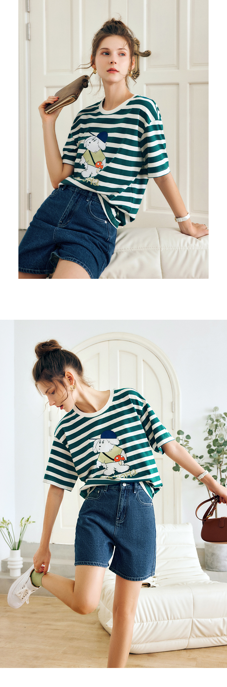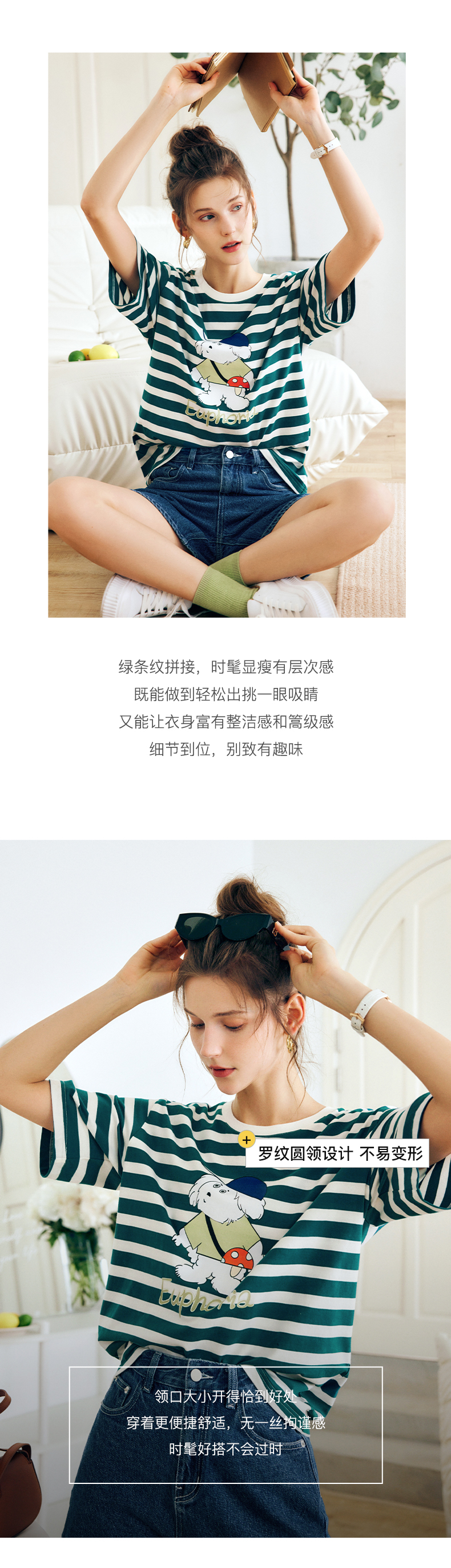 OLrain法式条纹短袖T恤女夏季2022新款宽松显瘦狗狗印花圆领上衣