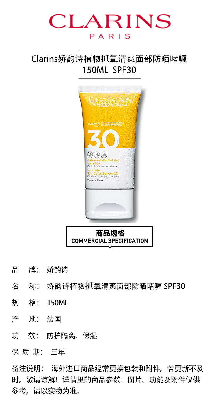 Clarins娇韵诗植物抓氧清爽面部防晒啫喱50ML SPF30