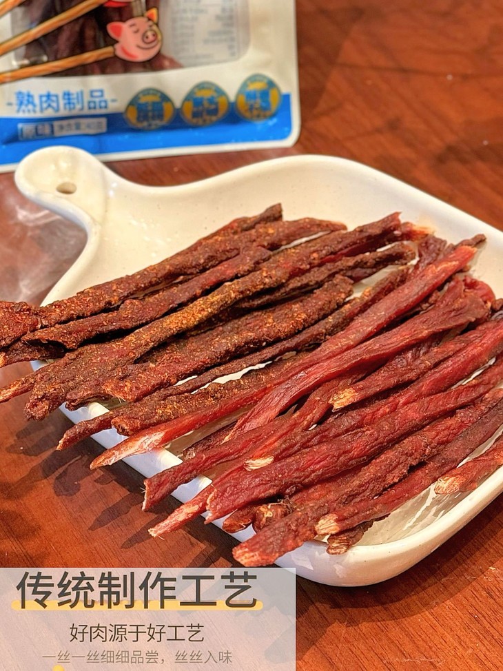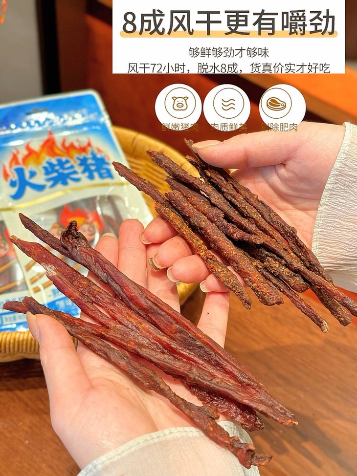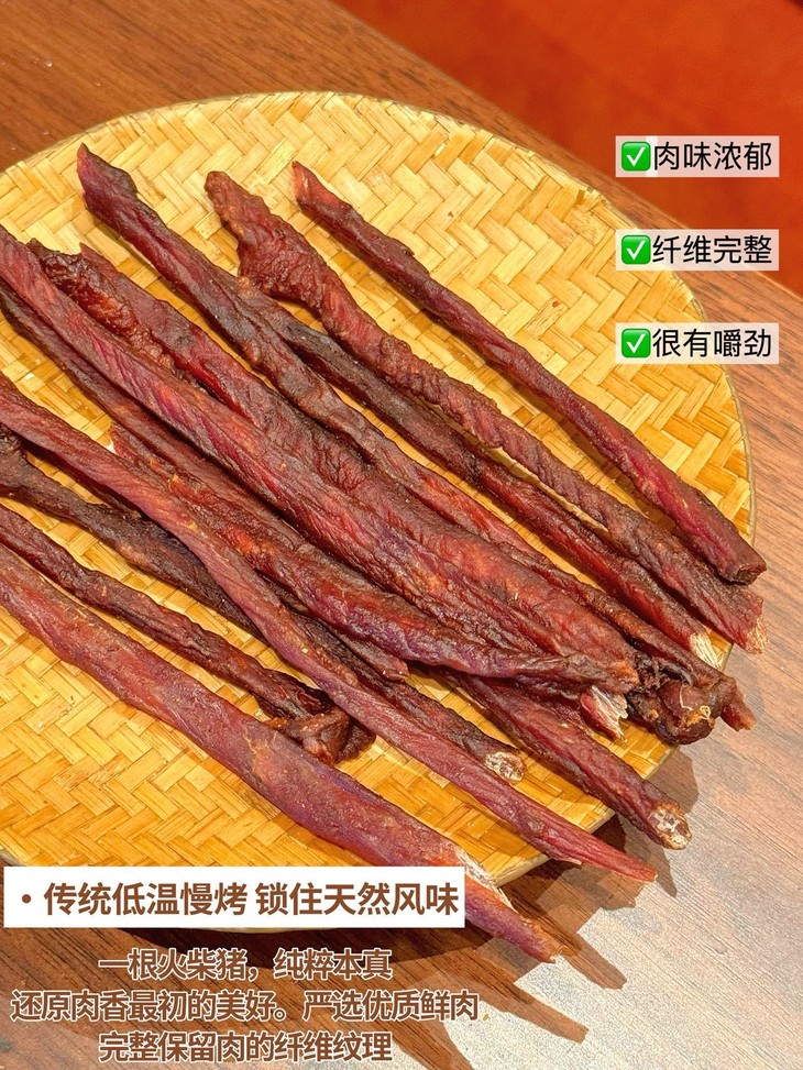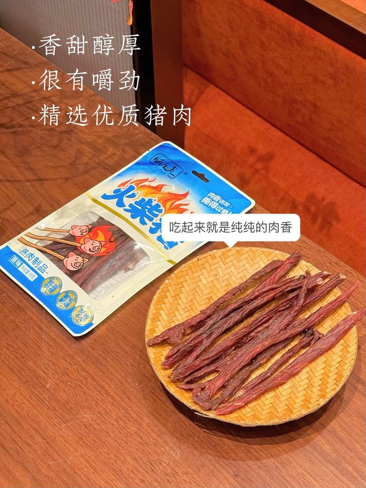 这个火柴猪靠的是猪肉本身的鲜味和简单的调味 更凸显肉的原汁原味🤤 每一口都是扎实的肉感~ 不齁咸不油腻,越嚼越香~ 老人小孩👴👵👶吃着都安心 减脂期想吃点肉味零食,选它准没错✅