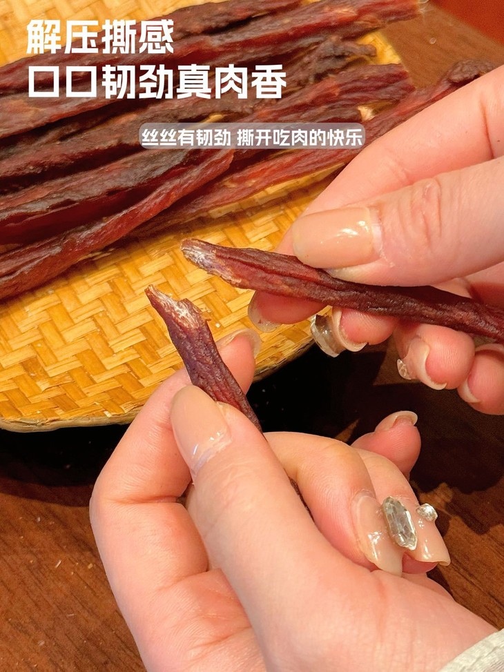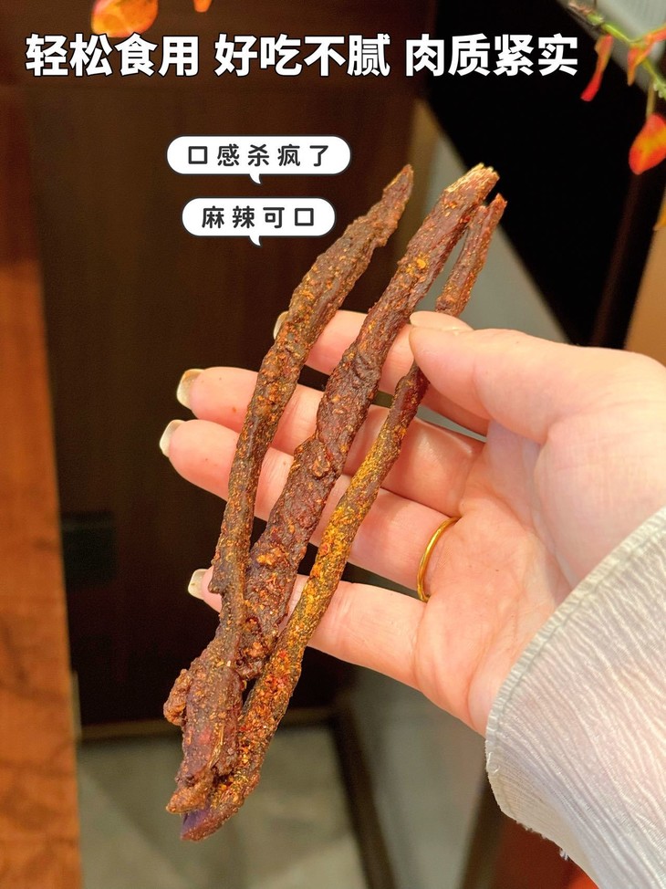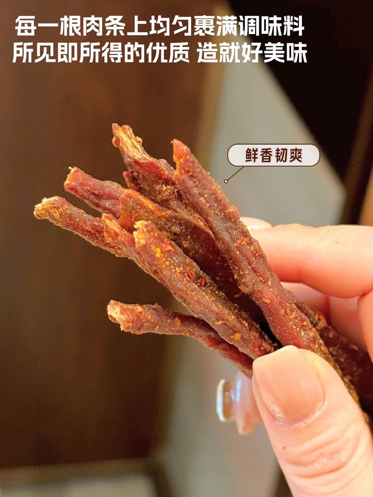入口第一口是肉条的紧实弹牙😆 完全没有加一点点淀粉❗️ 肉纤维在嘴里“咯吱咯吱”散开 猪肉本身的鲜香味就直窜天灵盖 每一根都能嚼出清晰的肉纹理👀 越嚼越香,香到连手指头都要嗦干净😋 这么靠谱的肉味零食真的太少见了🥳