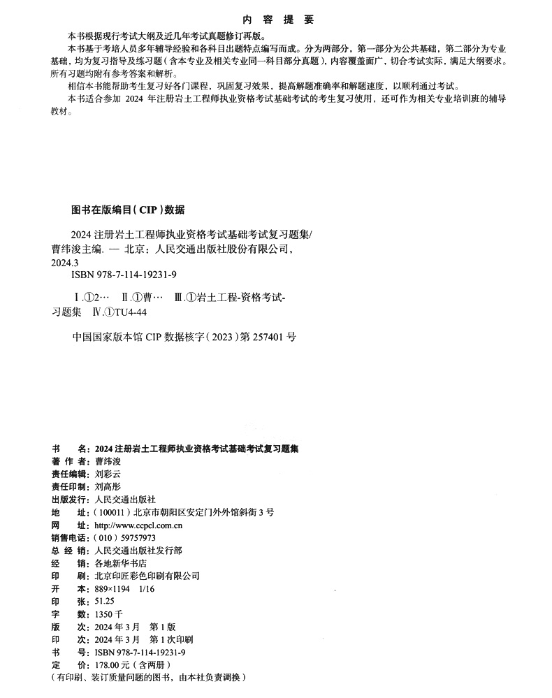 书名:2024注册岩土工程师执业资格考试基础考试复习题集