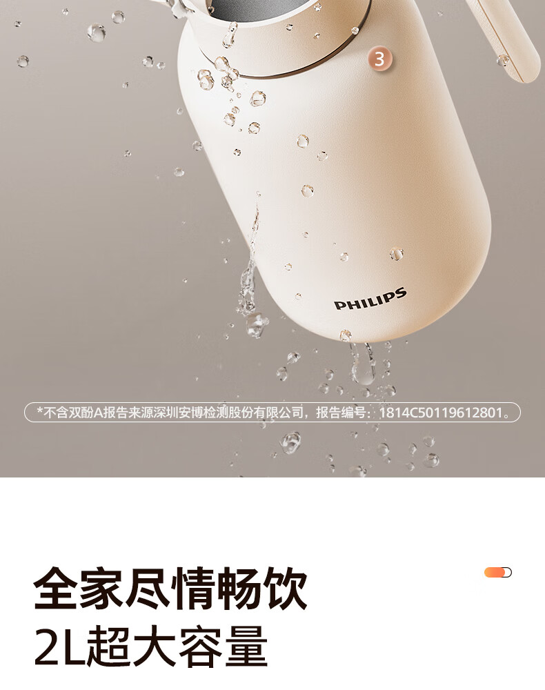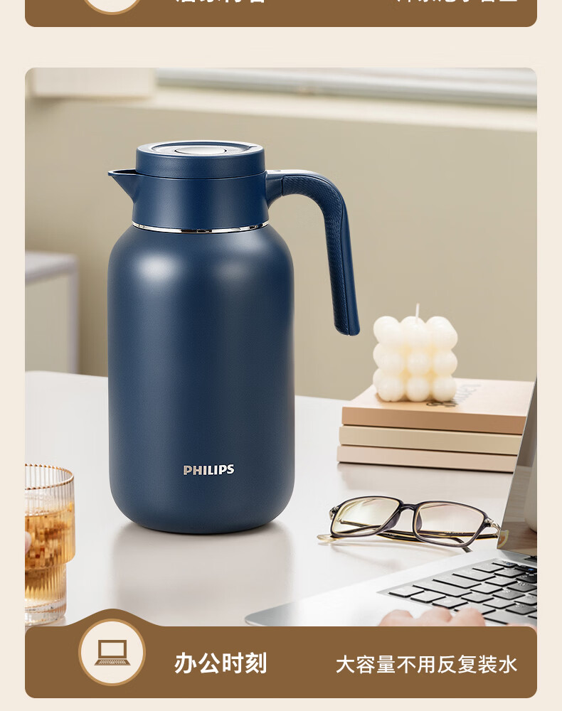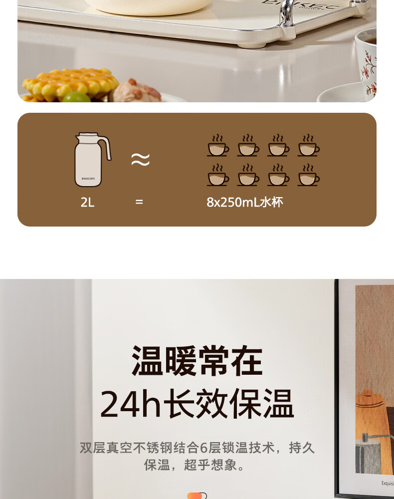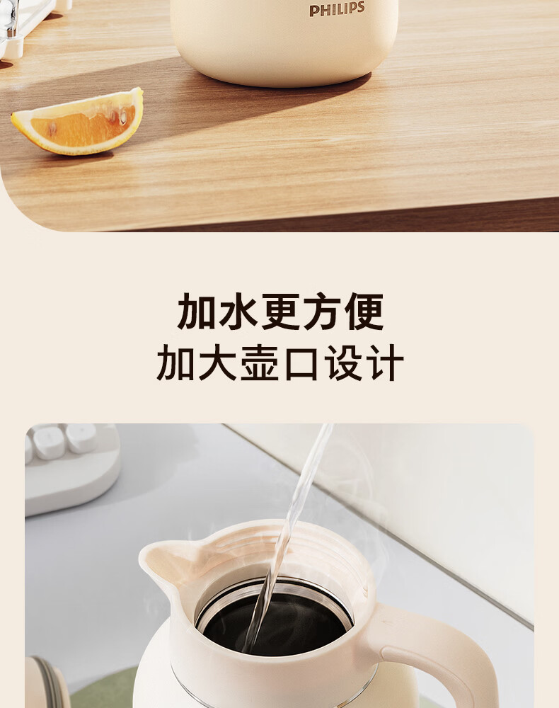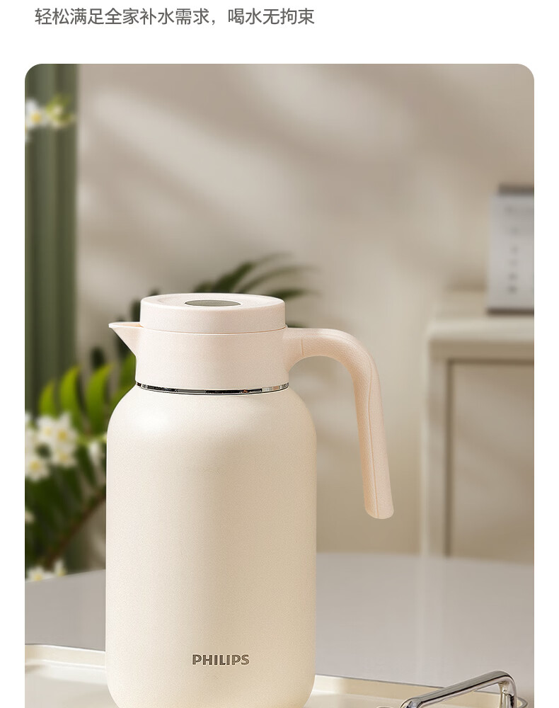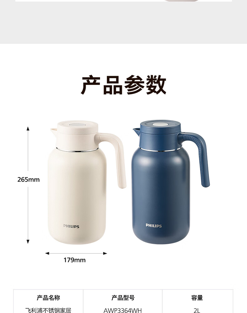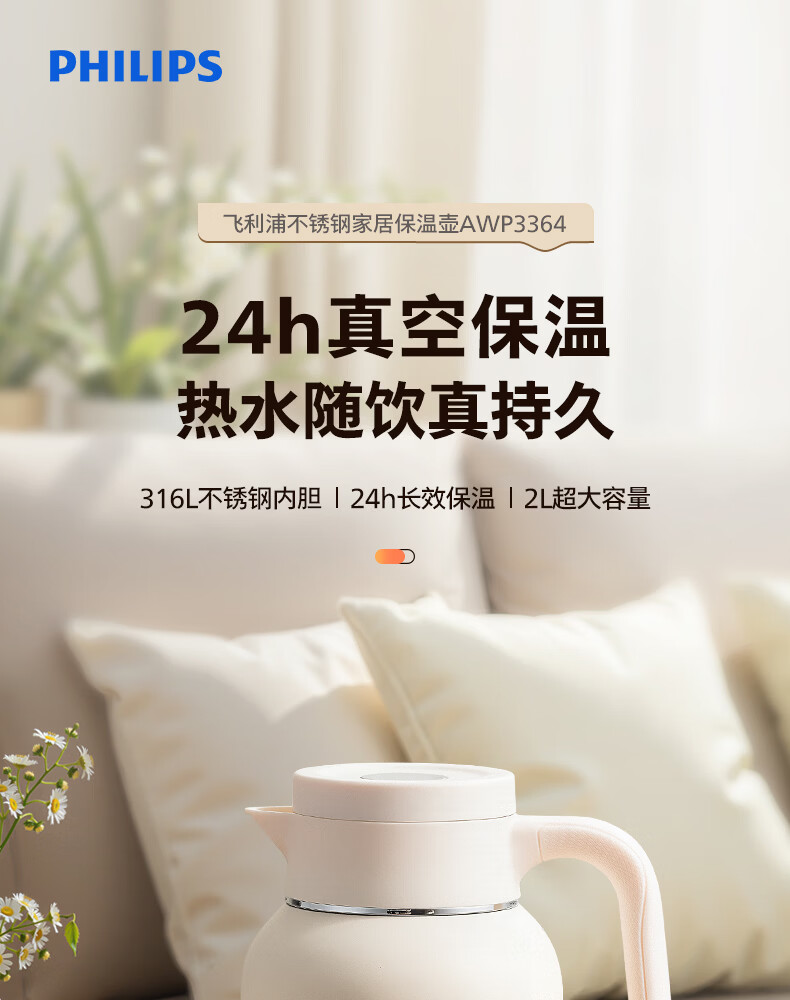 飞利浦PHILIPS保温壶家用 大容量热水壶 316不锈钢内胆保温瓶 按压式开水瓶2L容量 AWP3364