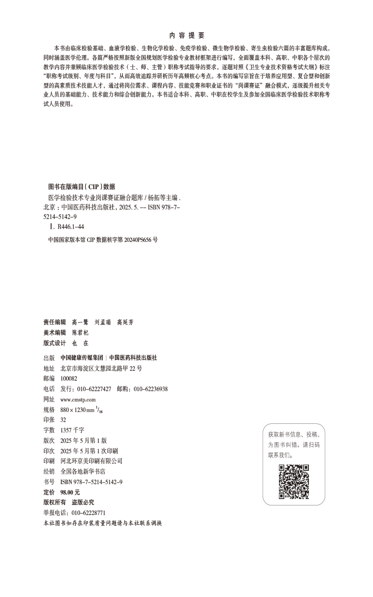 书名:医学检验技术专业岗课赛证融合题库