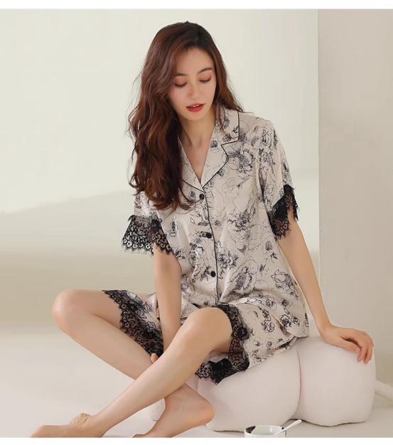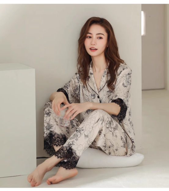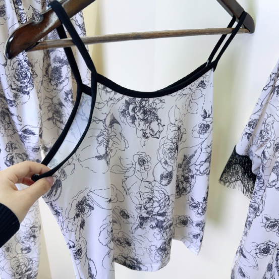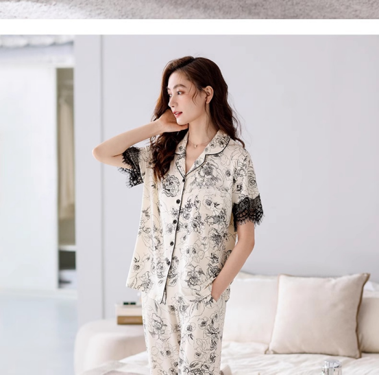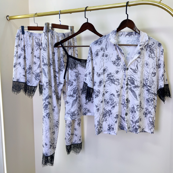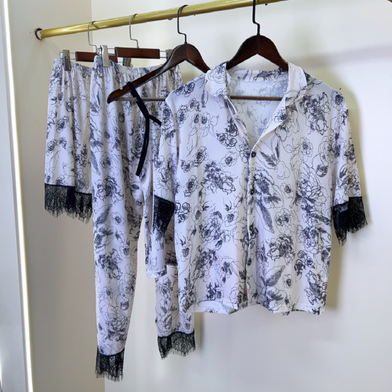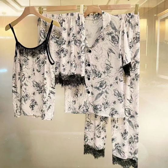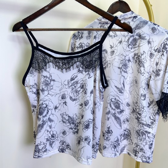 🌸 蔷薇花蕾丝四件套,设计超用心 🧊 冰爽面料亲肤透气,舒适不闷汗 👖 分体裤装零束缚,遮肉显瘦显腿长 🎨 清新印花减龄,性价比超高入手值