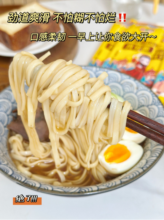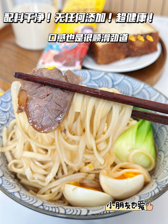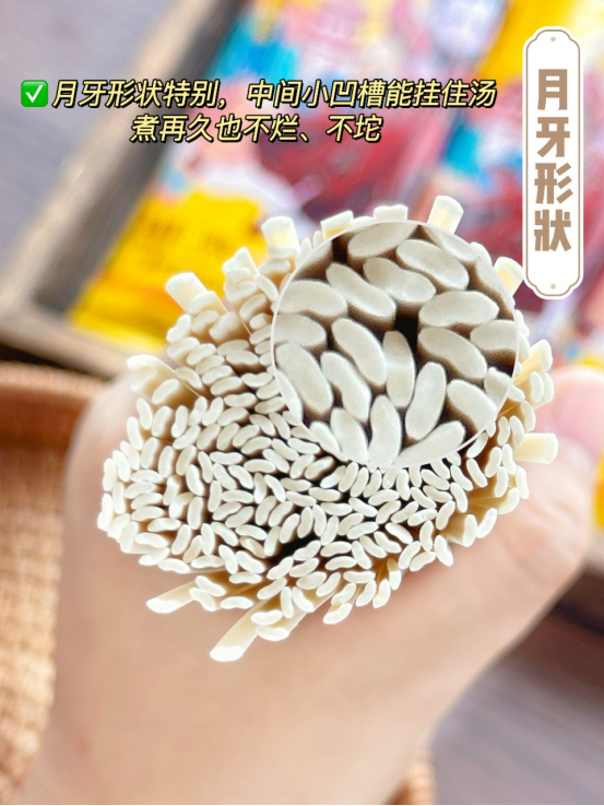 月牙形设计 中间带凹槽的月牙造型,看着就特别,吃起来更是绝 凹槽能挂住汤汁每口面都裹着鲜美的汤,味道瞬间有了层次感 而且3mm宽度+厚实厚度,刚好能入味❗ 自带嚼劲,咬下去Q弹爽滑,越嚼越香 像我这种爱吃面又怕没口感的人,直接被拿捏❗ 煮久了也不烂不坨,根根分明,连不爱吃面的老公都连说“这面有点东西”❗❗