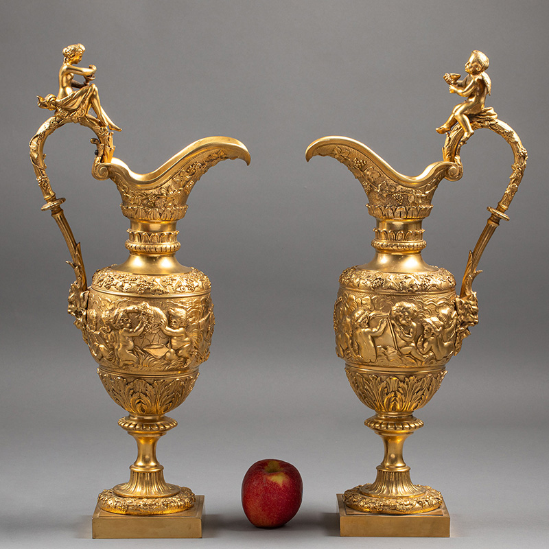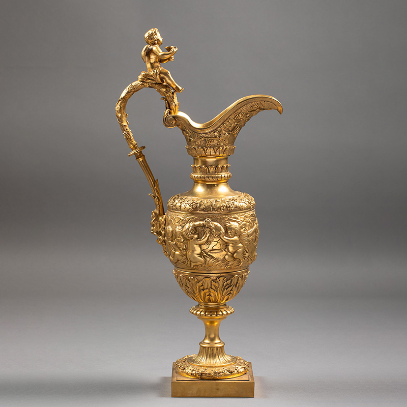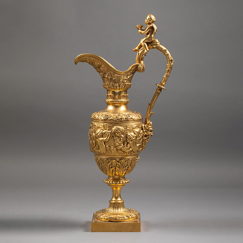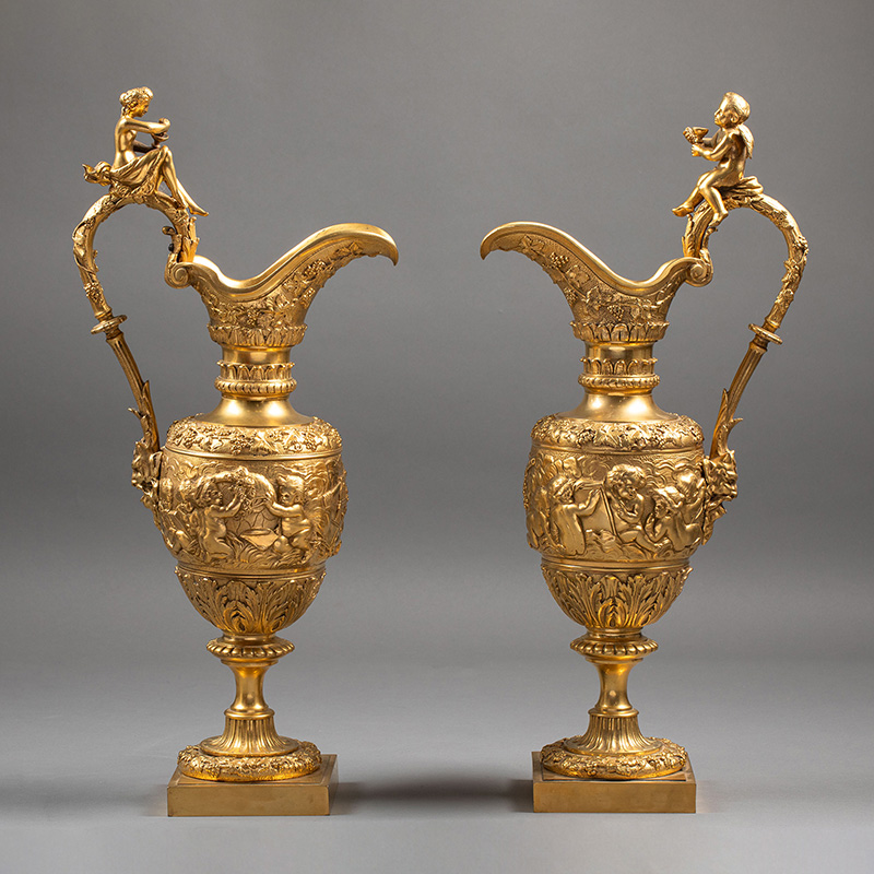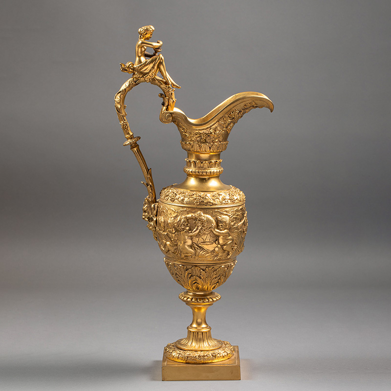 1850-1870年代法国出品新文艺复兴风格铜鎏金精雕「小酒神」主题水壶摆件一对