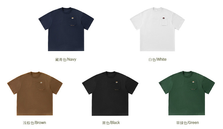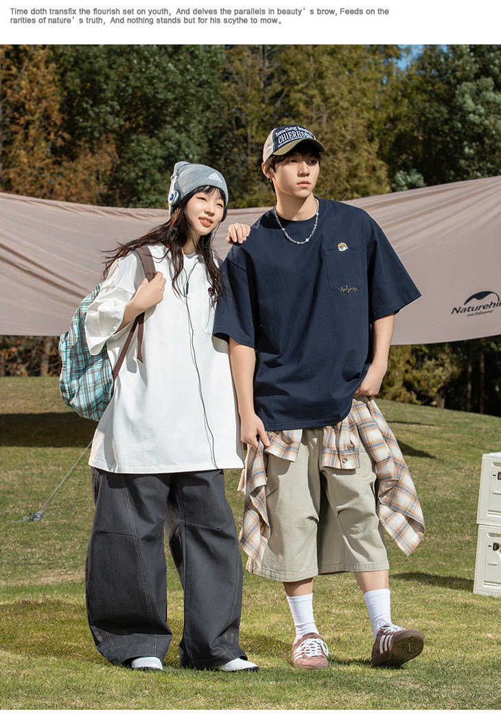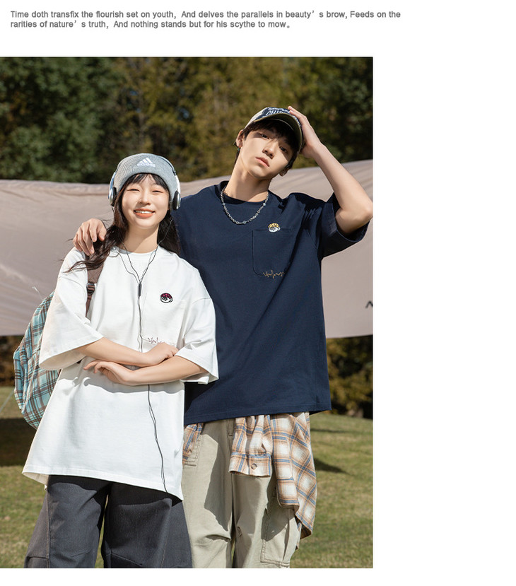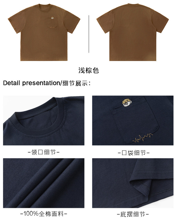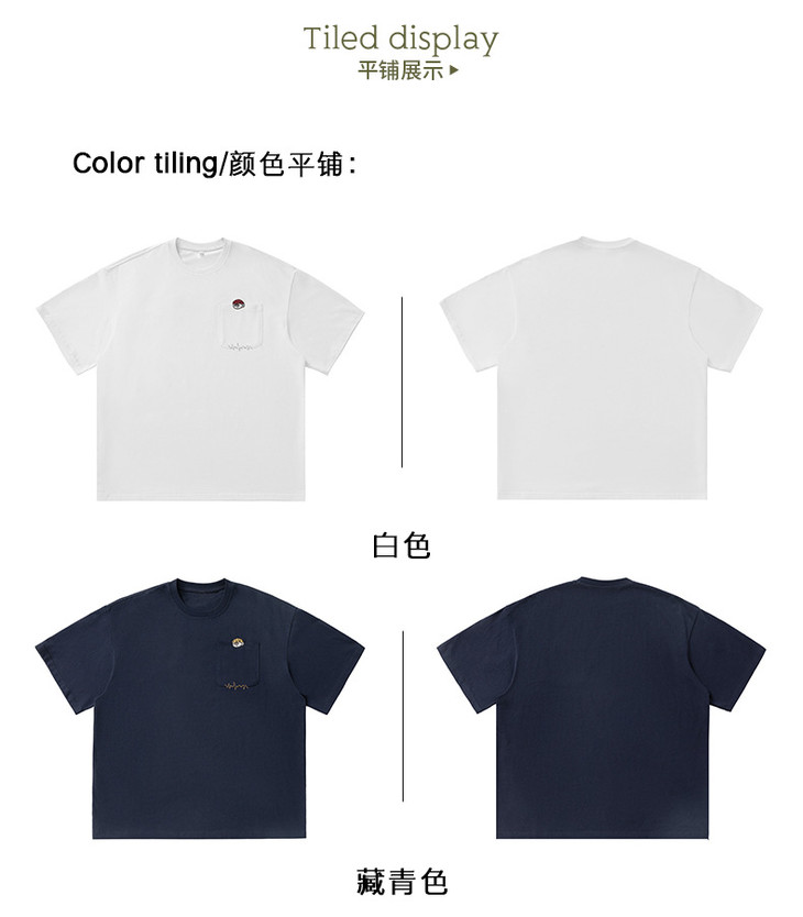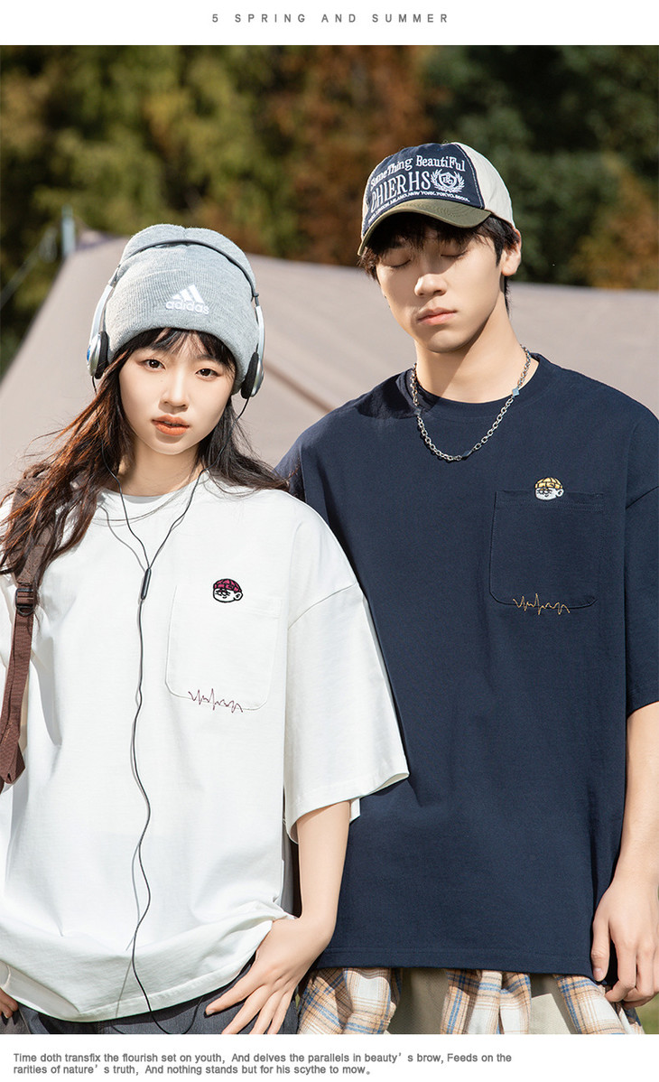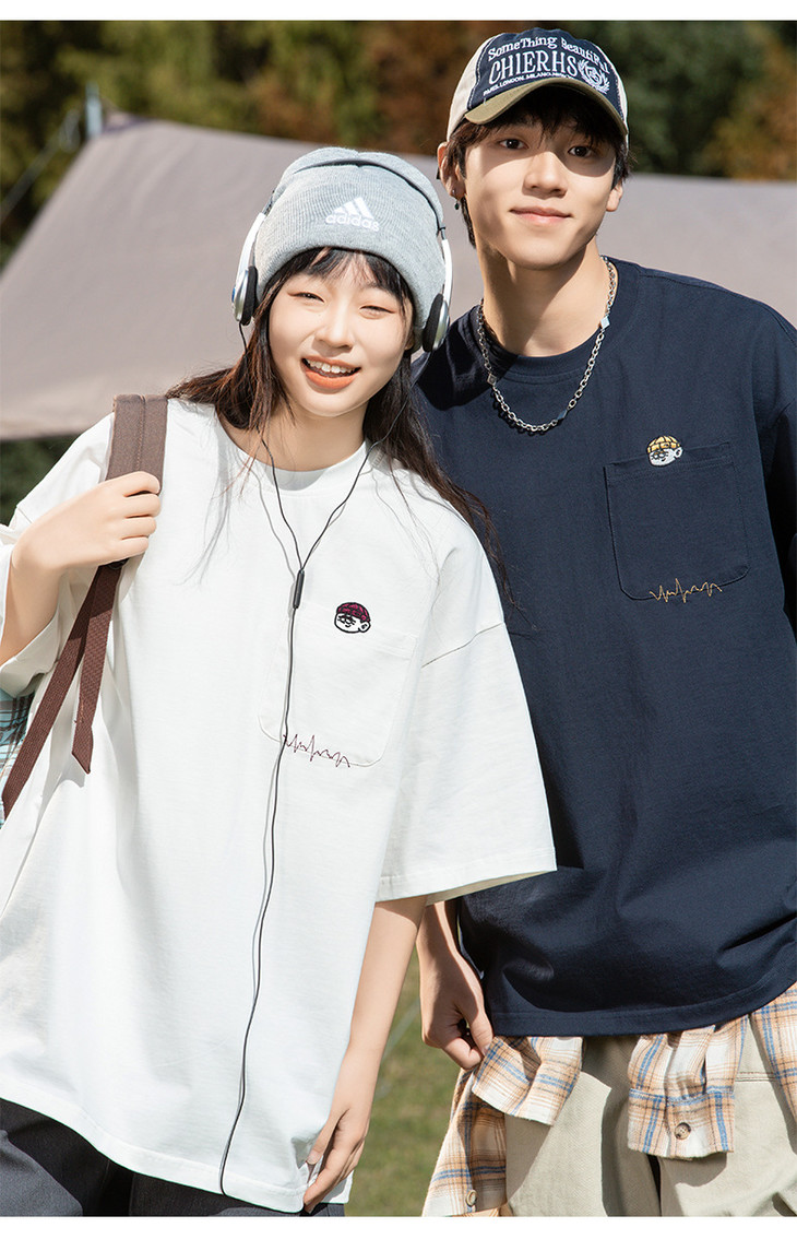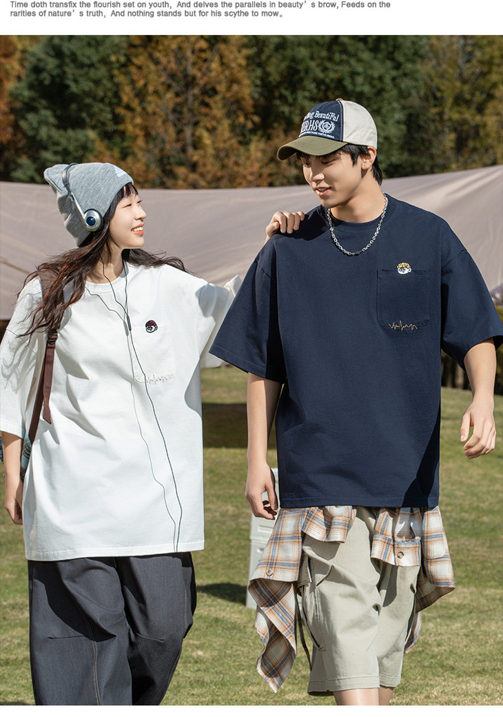 【情侣复古纯棉短袖T恤】男女夏新款口袋刺绣设计宽松圆领体恤衫