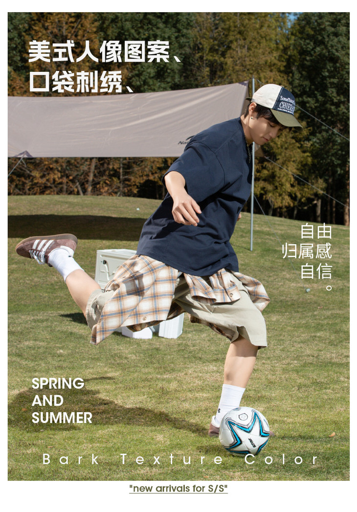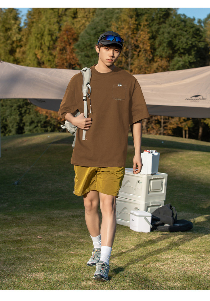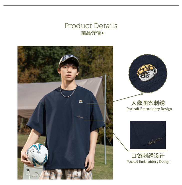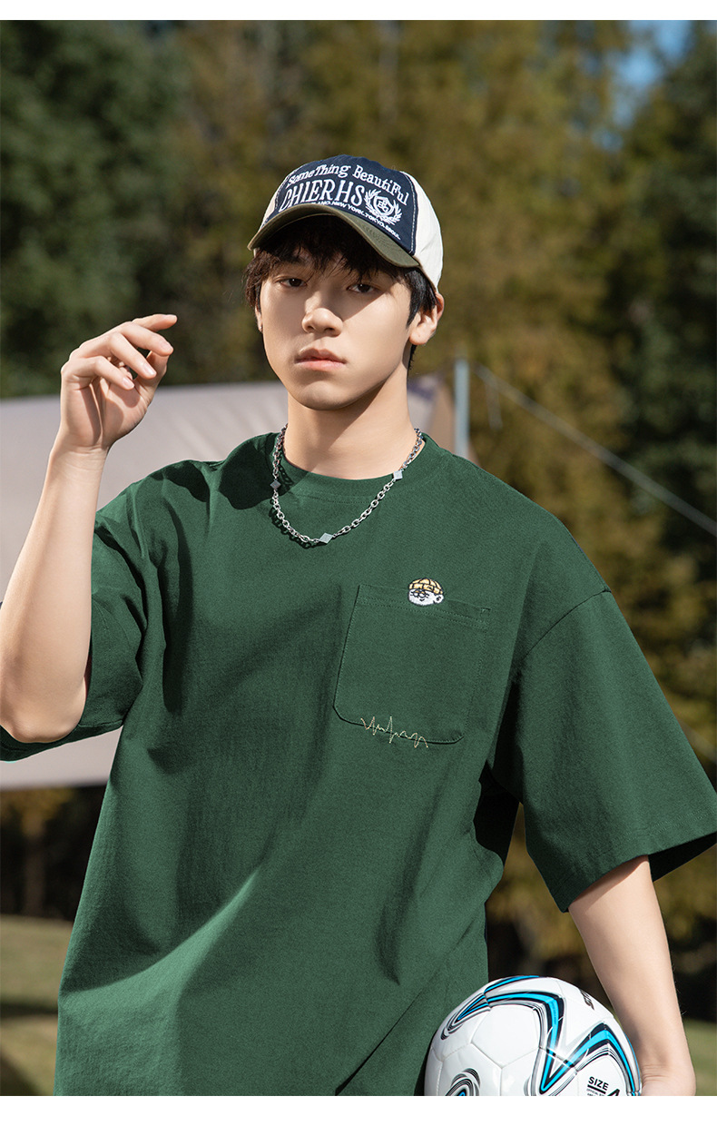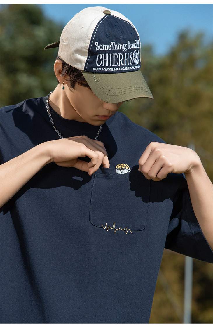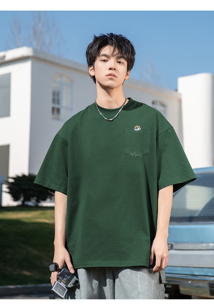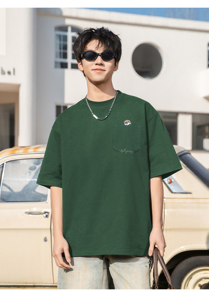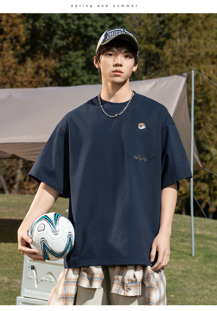 【情侣复古纯棉短袖T恤】男女夏新款口袋刺绣设计宽松圆领体恤衫