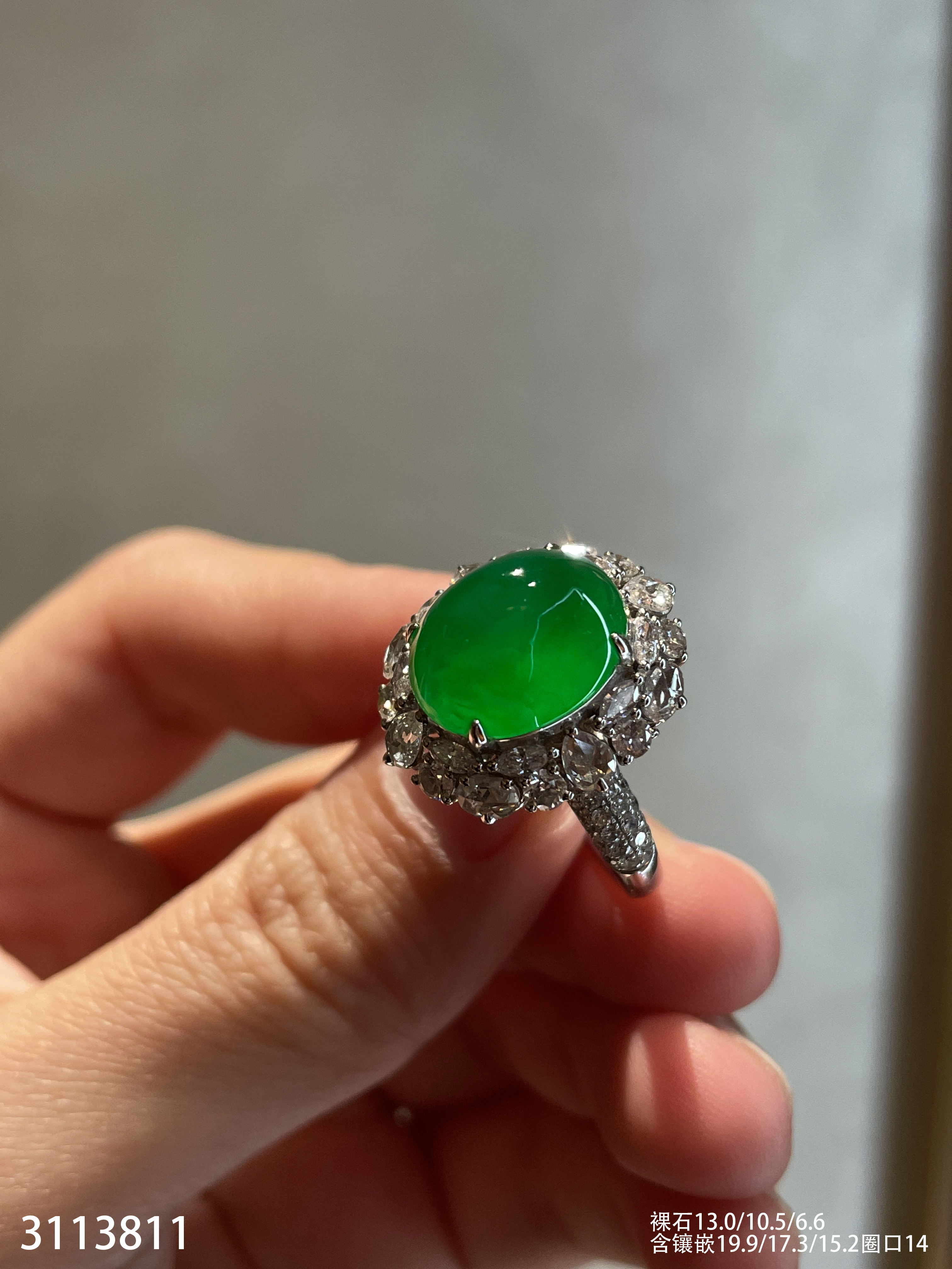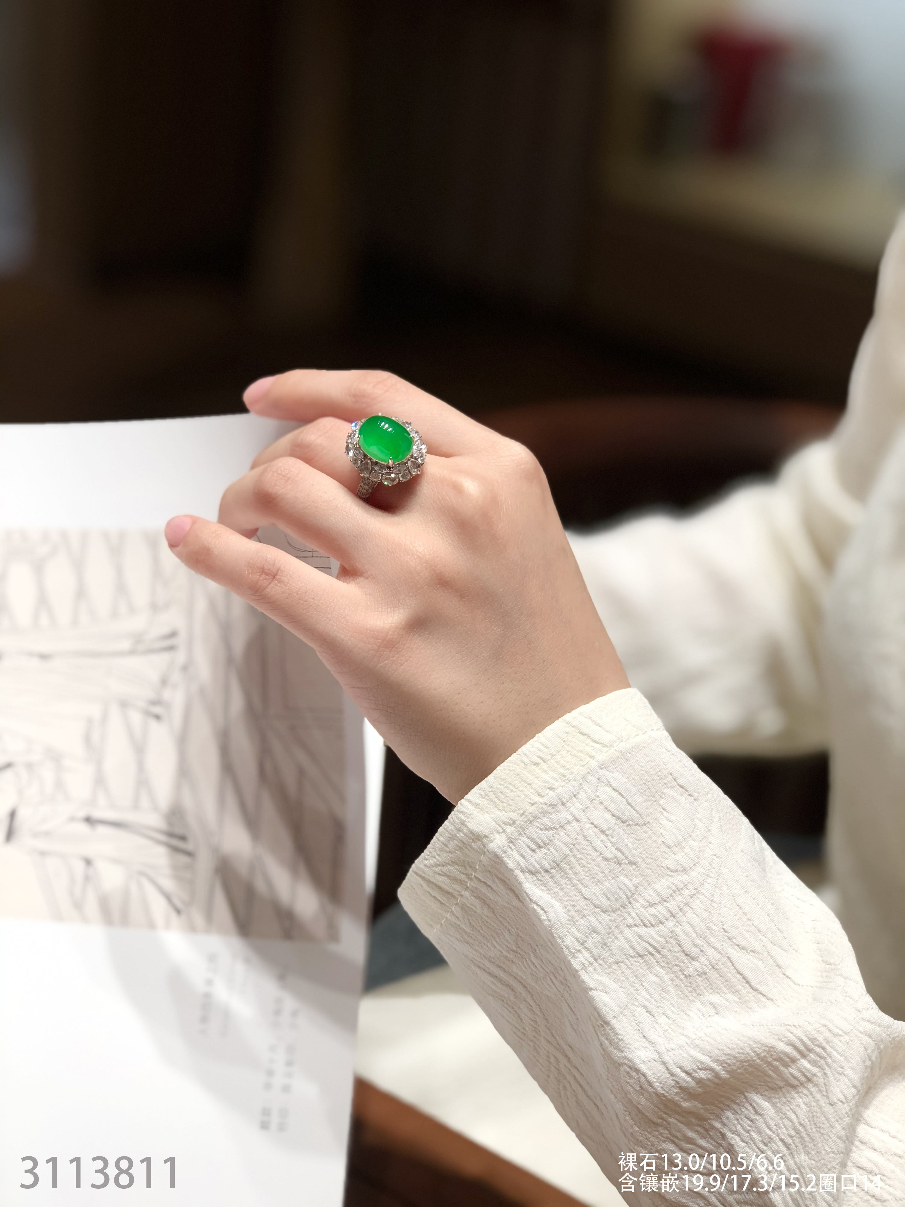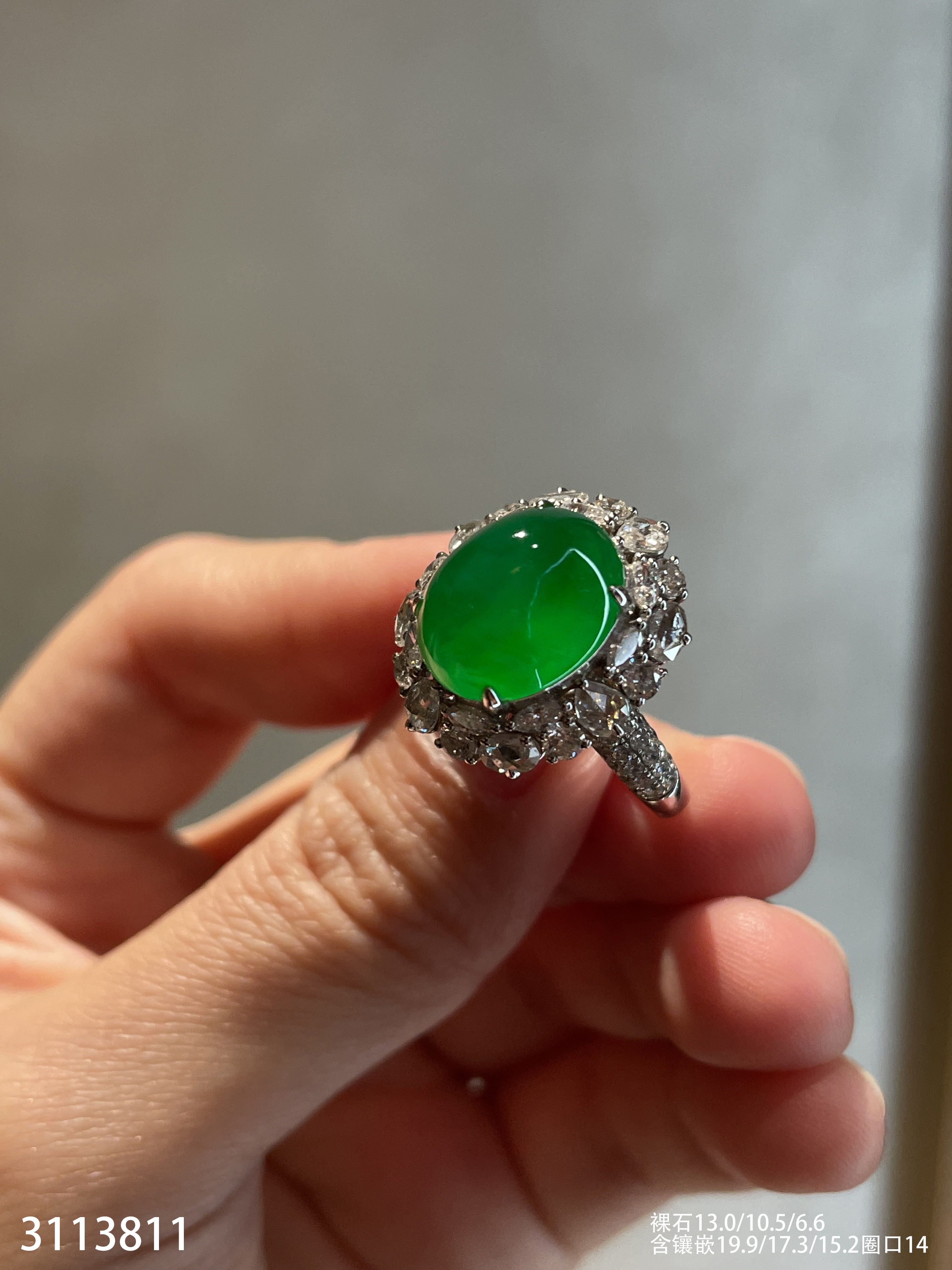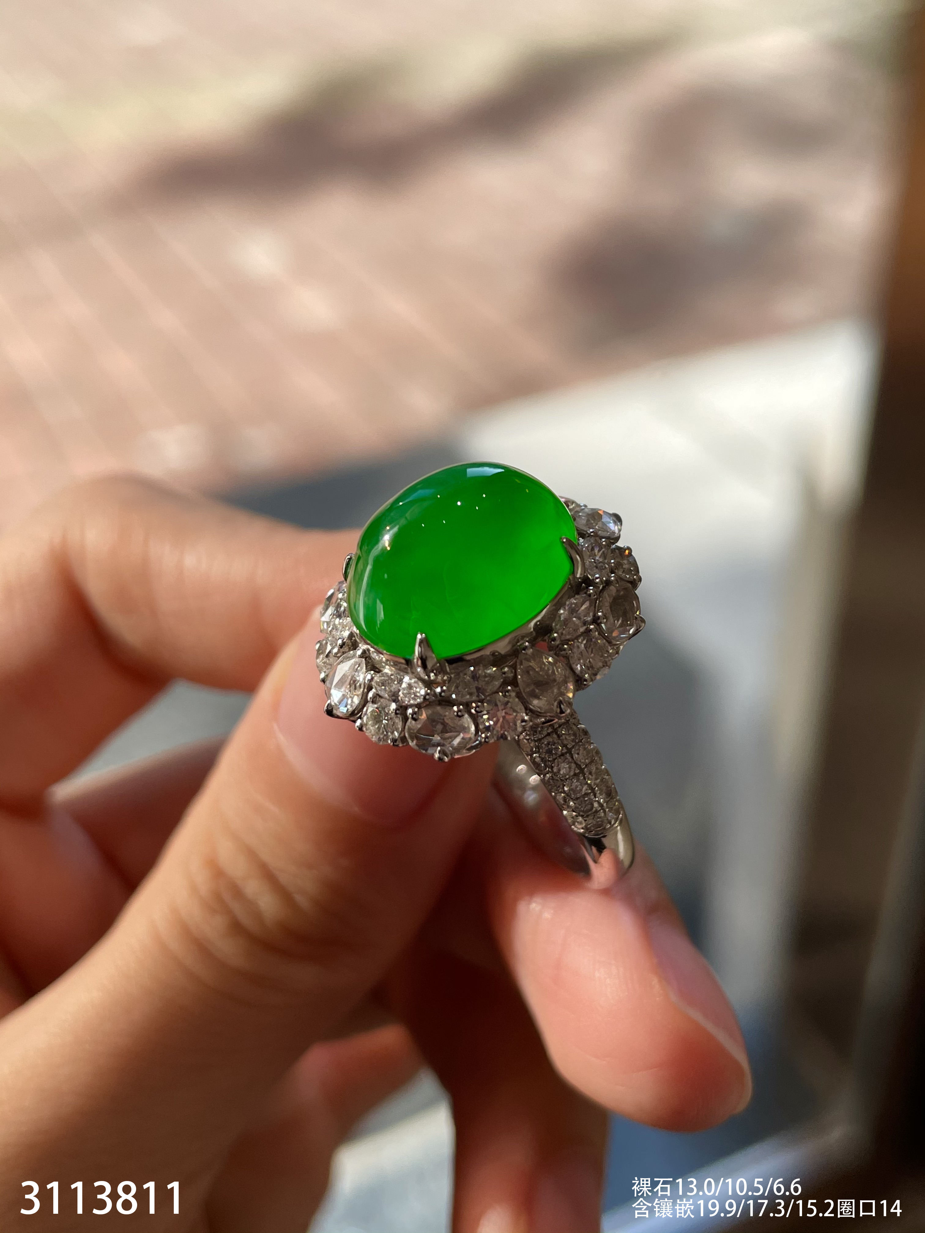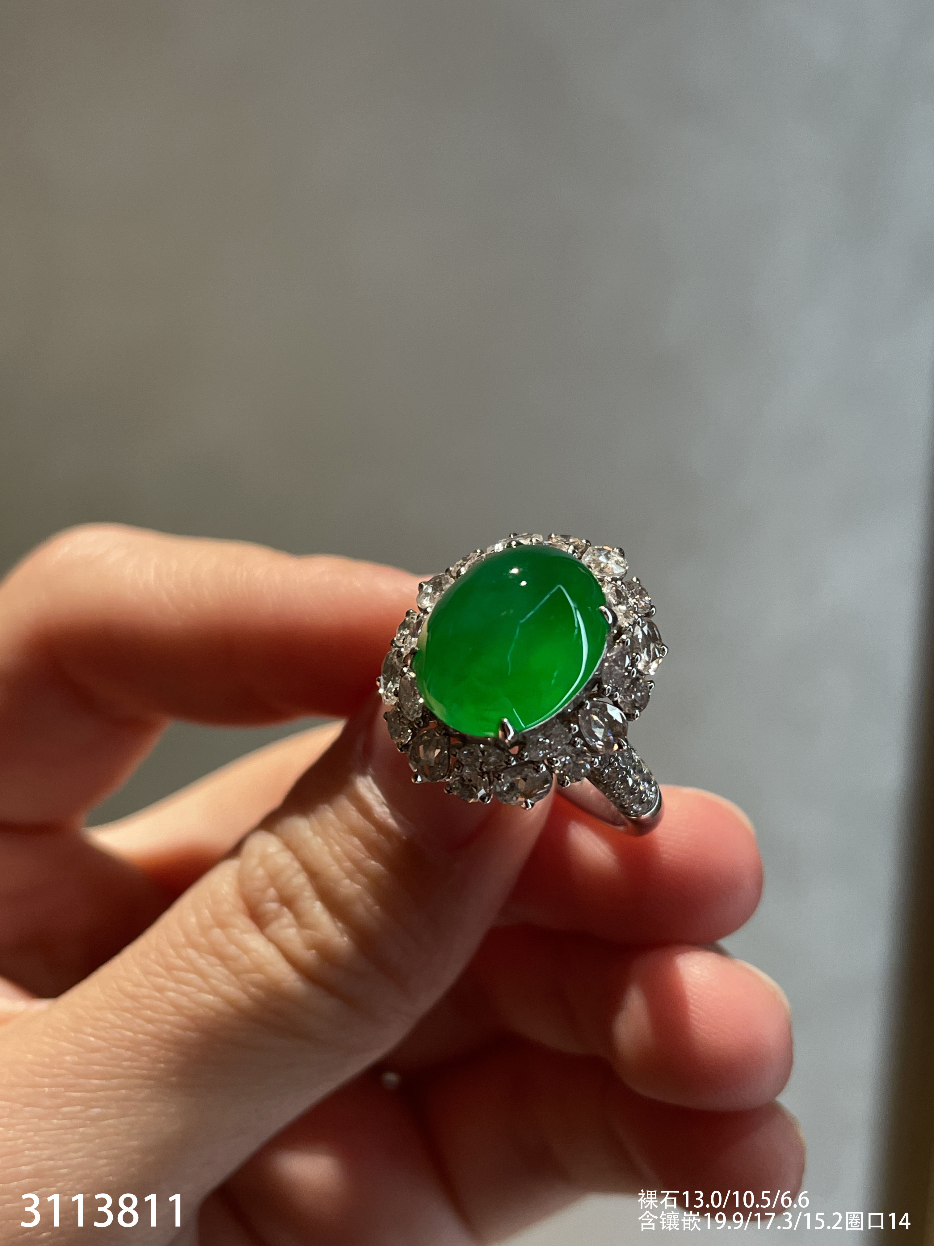 高冰艳绿蛋面戒指【3113811】具体价格微信咨询