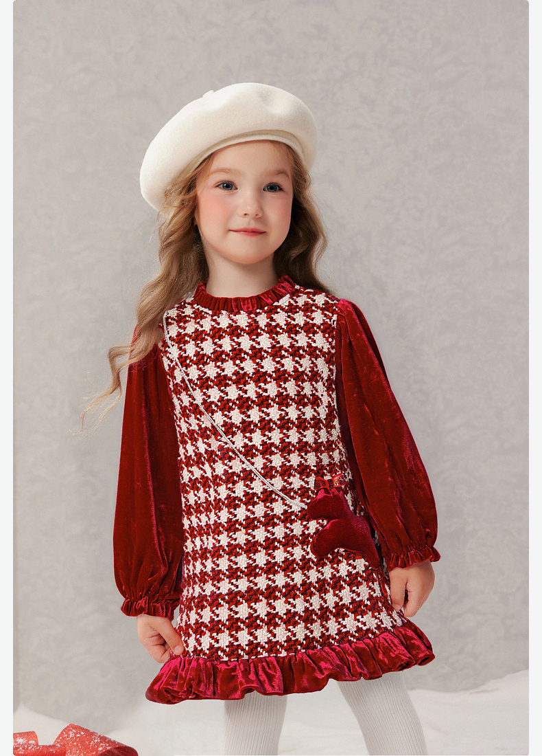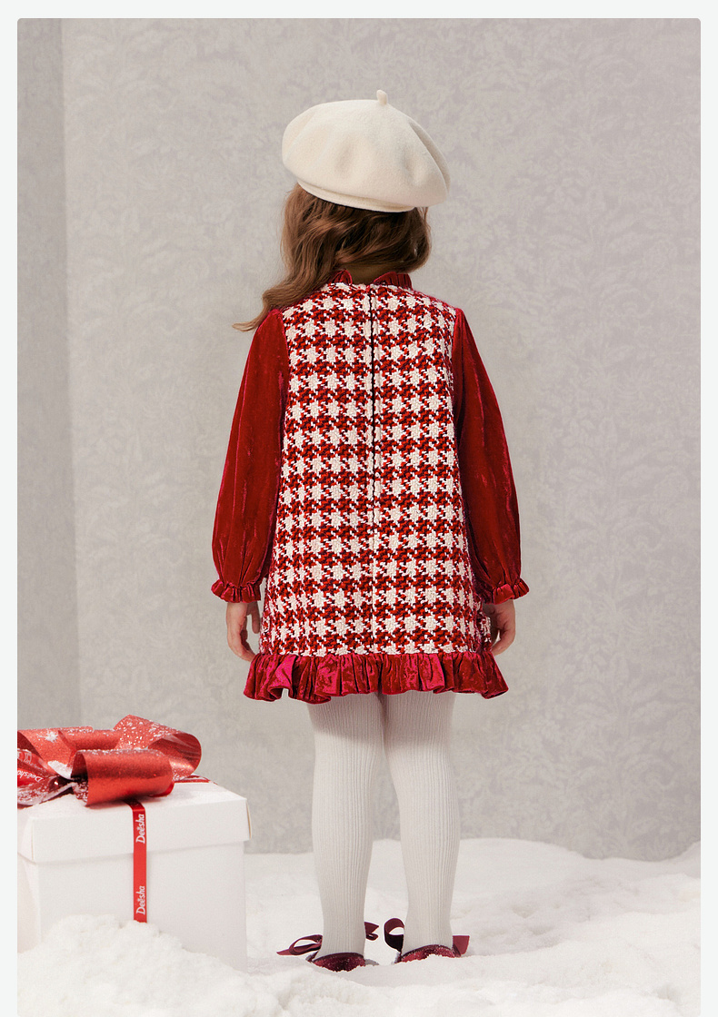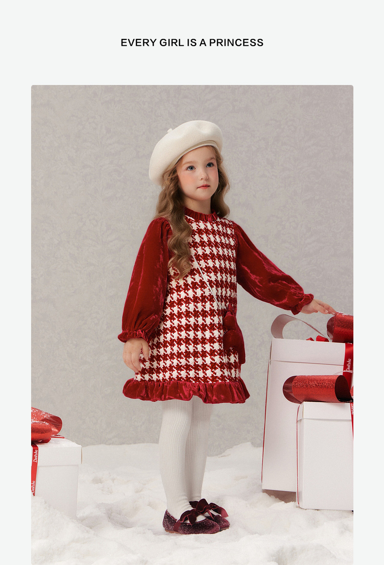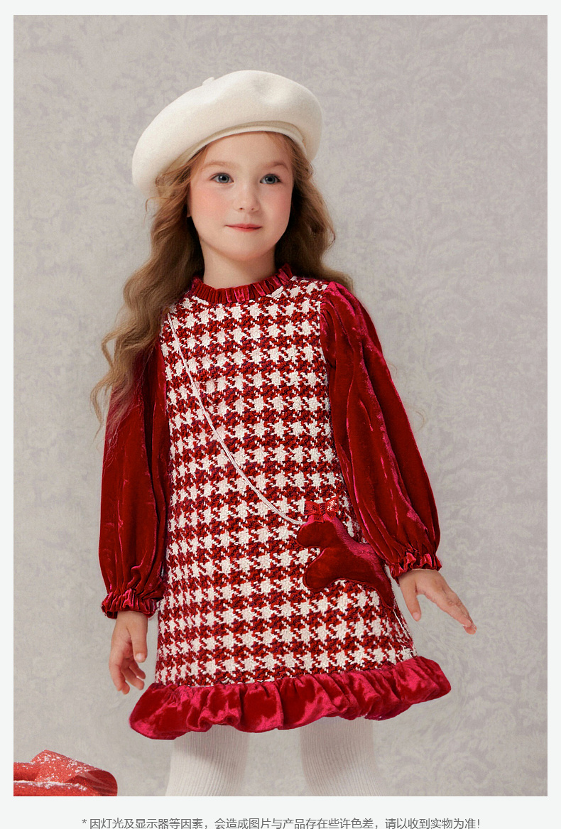 笛莎Deesha 童装女童连衣裙2025冬新款新年干鸟格香风连衣裙