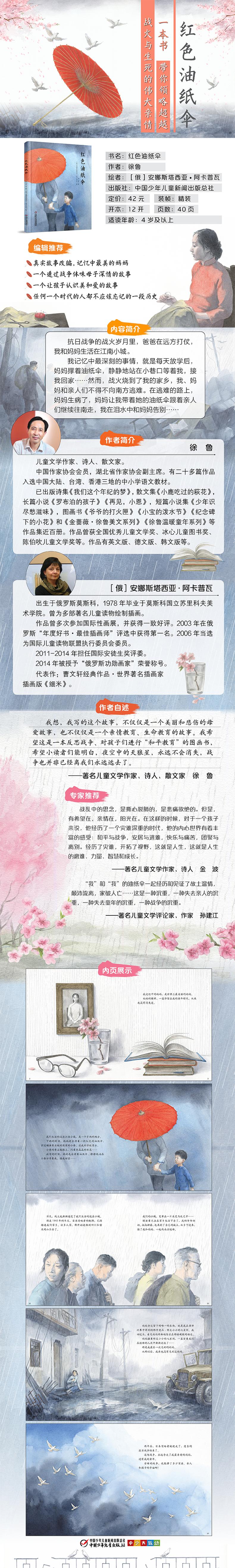 徐鲁著的《红色油纸伞(精)》讲述了在抗日战争的战火岁月里,爸爸在远方打仗,我和妈妈生活在这座南方的小城。我记忆中最深刻的事情,就是每天放学后,妈妈撑着油纸伞,静静地站在巷口等我……然而,战火烧到了我的家乡,我、妈妈和亲人们不得不向南方逃难。在逃难的路上,妈妈生病了,妈妈让我带着她的油纸伞跟着亲人们继续往南走,我在泪水中和妈妈告别……真实故事改编,记忆中好看的妈妈一个透过战争体味母子深情的故事一个让孩子认识美和爱的故事任何一个时代的人都不应该忘记的一段历史。