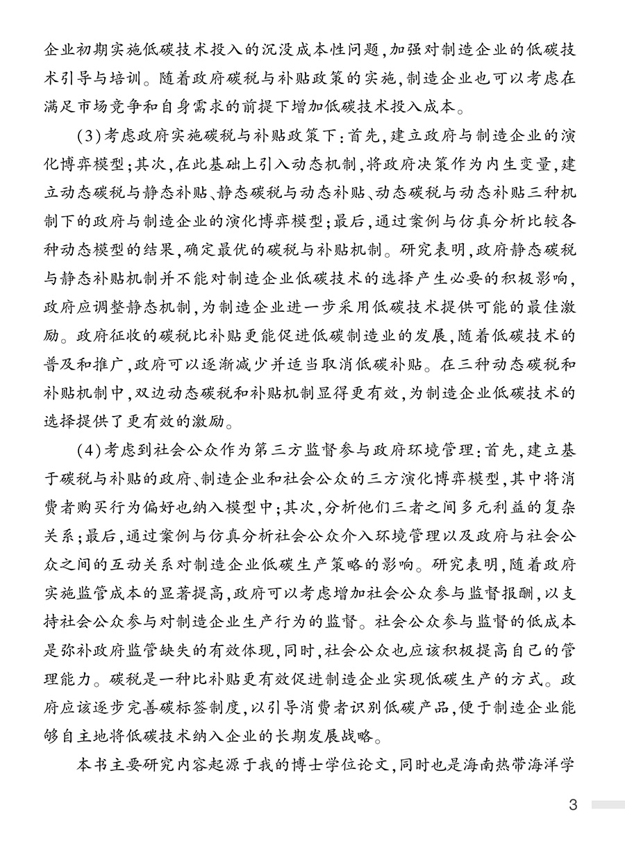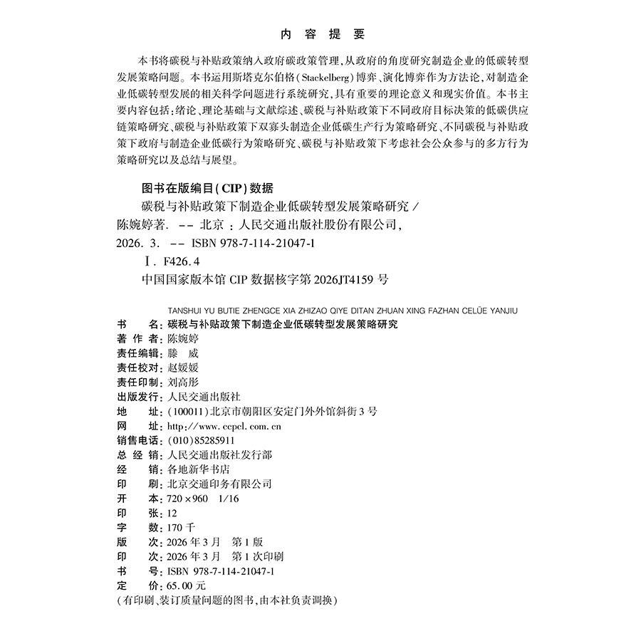 书名:碳税与补贴政策下制造企业低碳转型发展策略研究