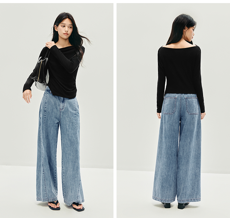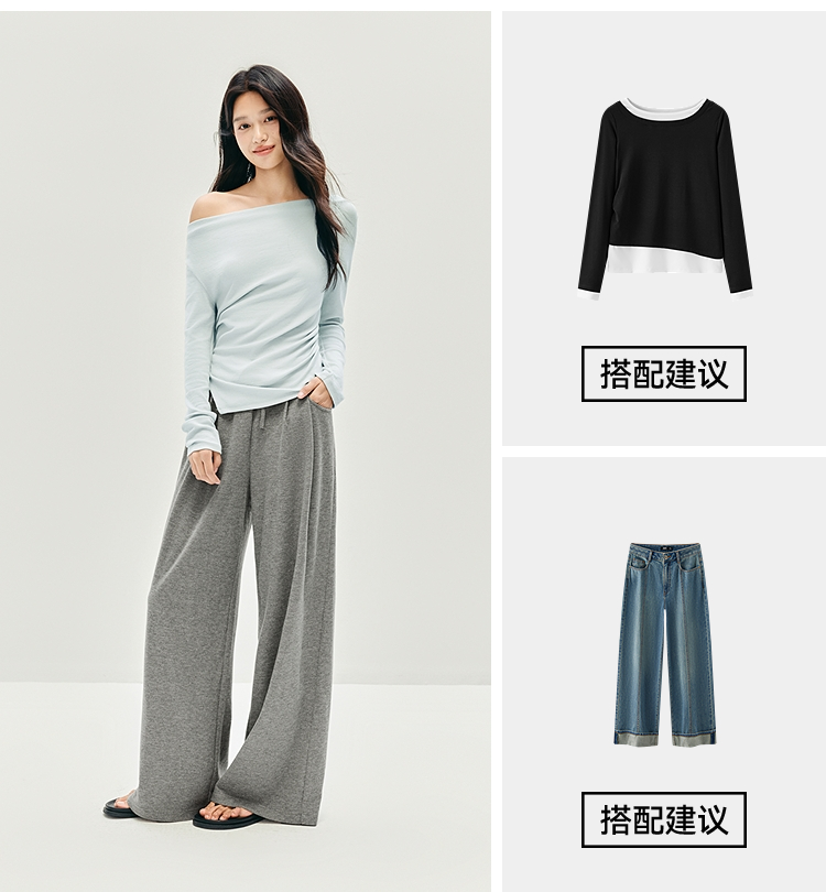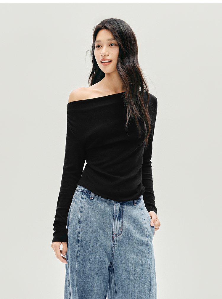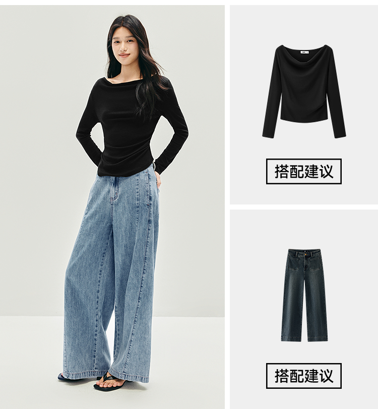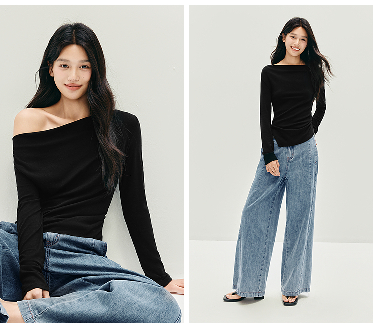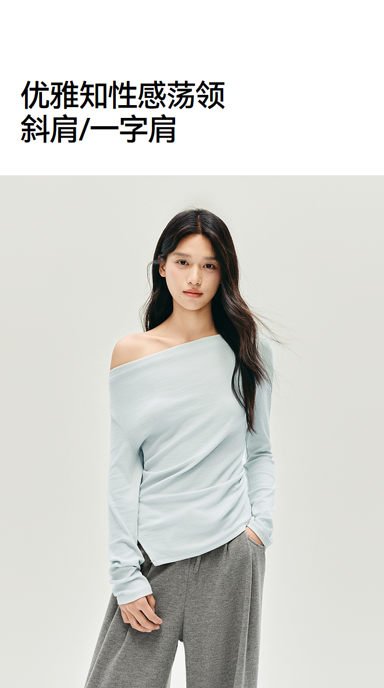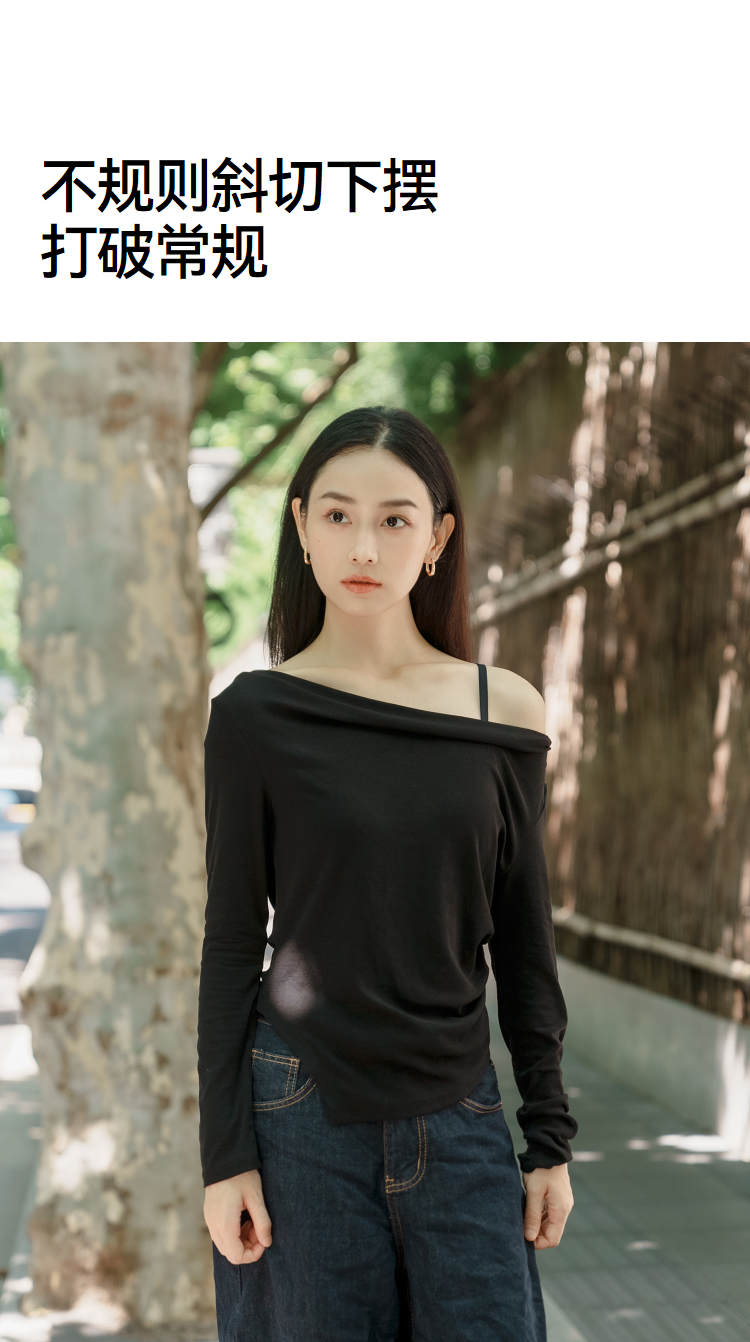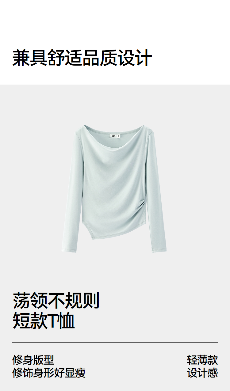 森马长袖T恤女短款不规则设计感修身显瘦2025新款秋荡领薄款上衣