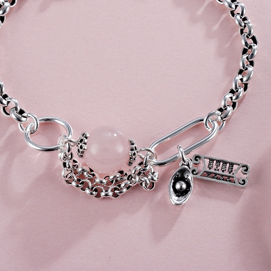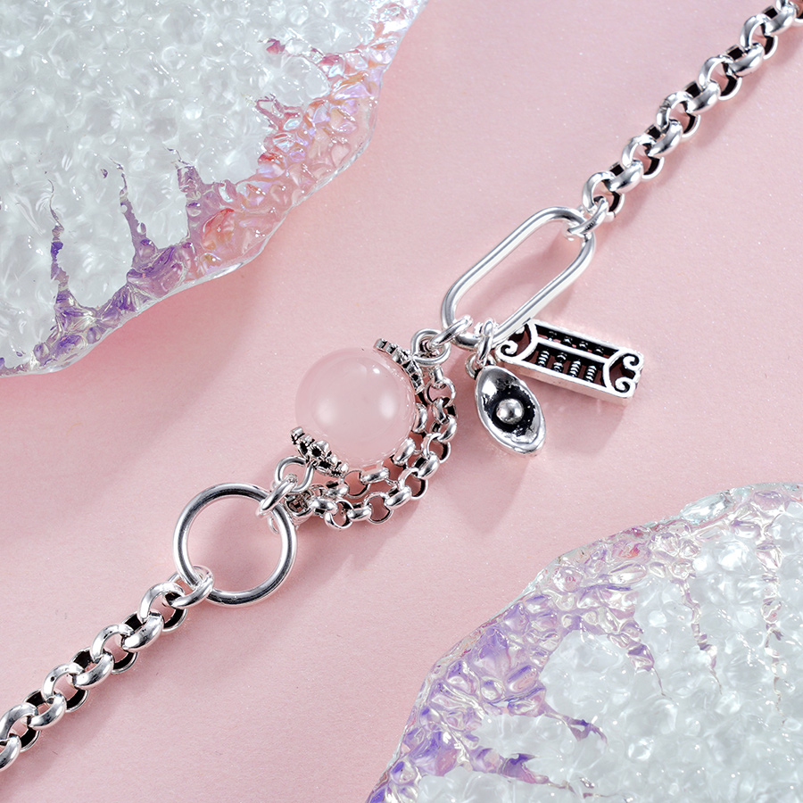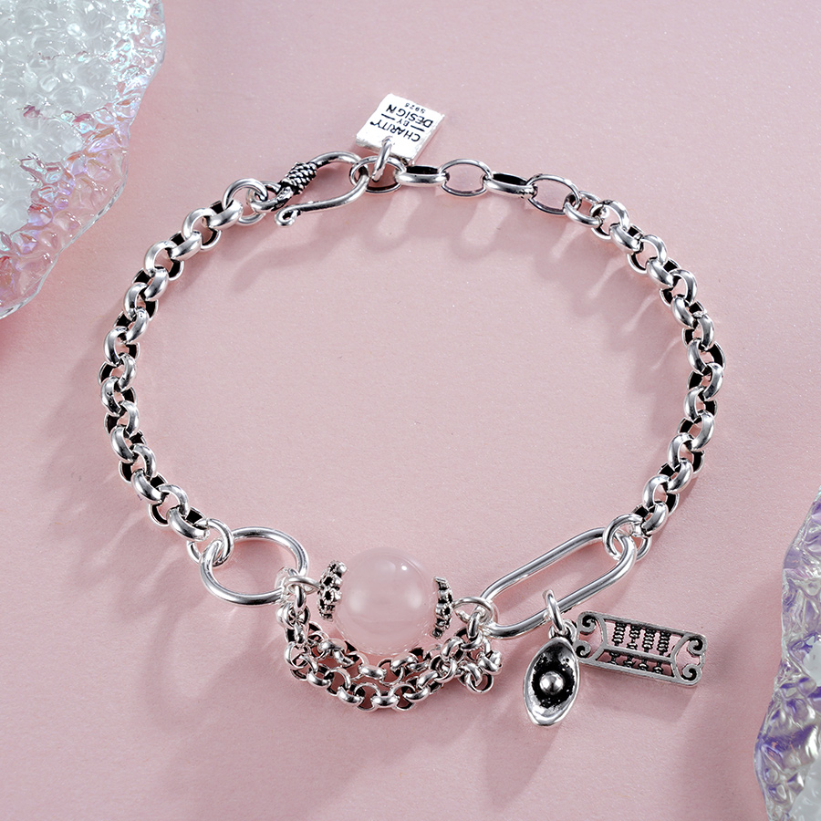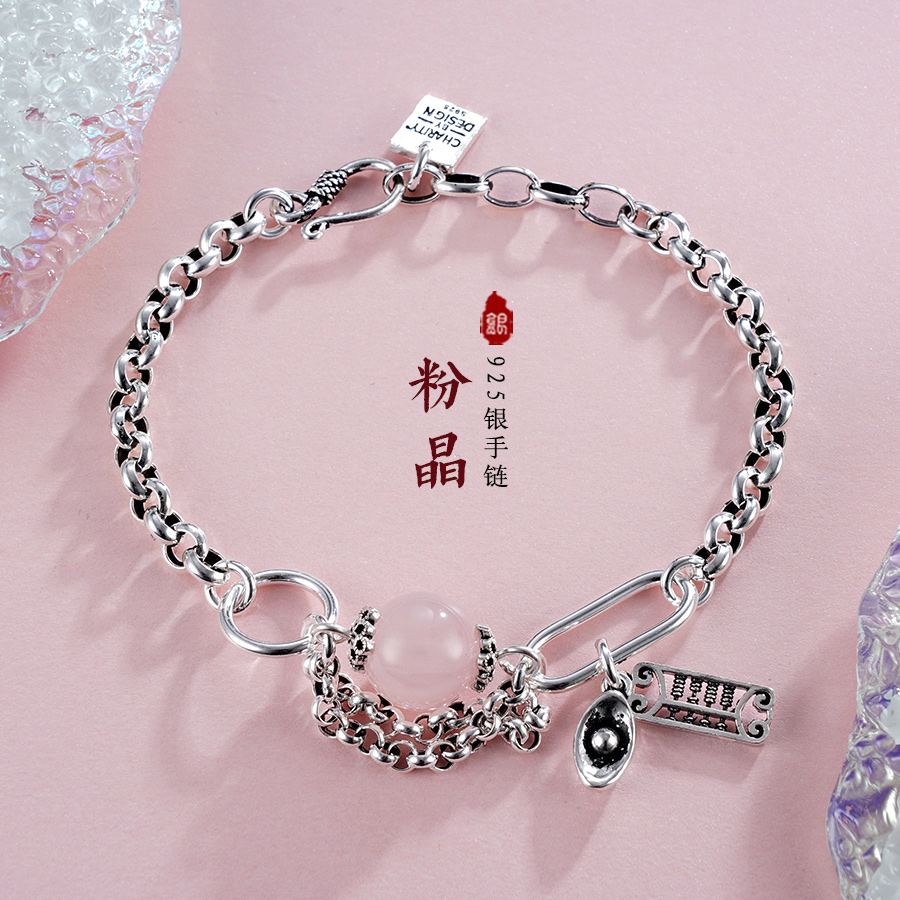 【寓意】:纯银粉水晶手串,色泽淡雅,娇艳欲滴。融入算盘、元宝元素,寓意吸引桃花、招财纳祥。