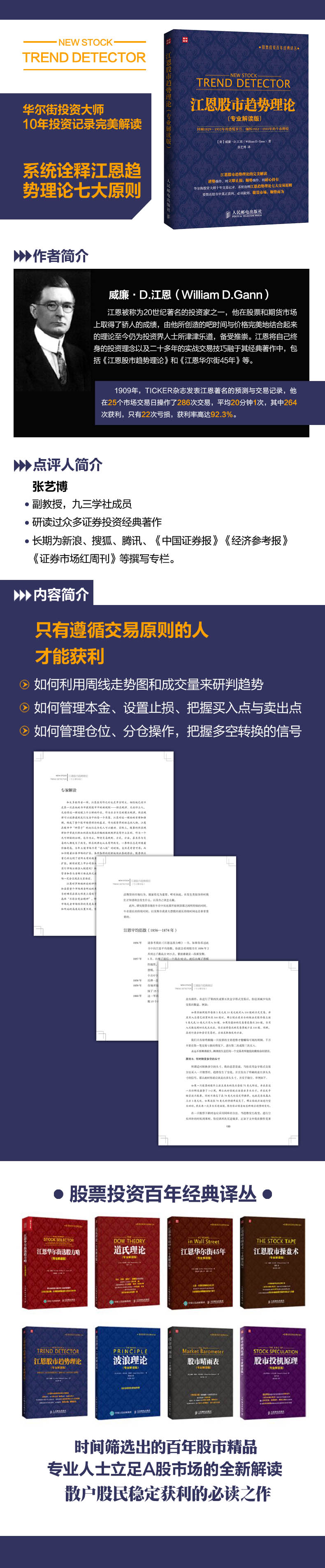 《江恩股市趋势理论(专业解读版)》是华尔街投资大师威廉·D.江恩继《江恩股市操盘术》和《江恩选股方略》之后所写的又一部股市操作指南。作者通过二十多年的实践交易经验证明了他所提出的一系列理论的正确性,并与读者分享了他独到的七个实用交易原则。本书以1925—1935年的股市为背景,通过分析克莱斯勒汽车公司股票10年的交易记录,详细介绍了利用月线、周线走势图和成交量来研判个股趋势的具体操作方法,以及如何设定停损单以保证投资收益的化,为读者在投资时提供了参考。此外,本书特别邀请了《证券市场红周刊》的专栏作家亲自执笔翻译并做注点评,使读者可以穿越百年时空,好地领悟书中的要点,并将其应用于当今A股市场。本书适合初入股市、希望了解股市运行基本规律以及所有对投资感兴趣的读者阅读。
