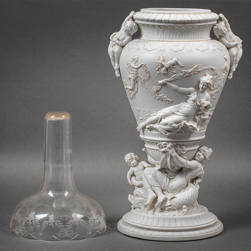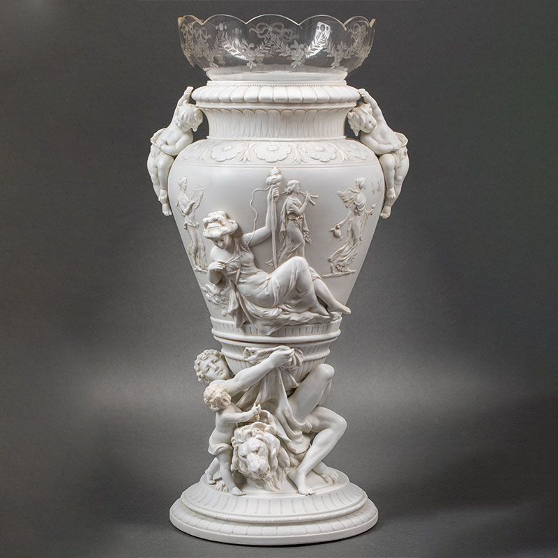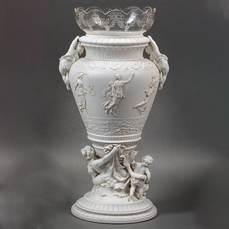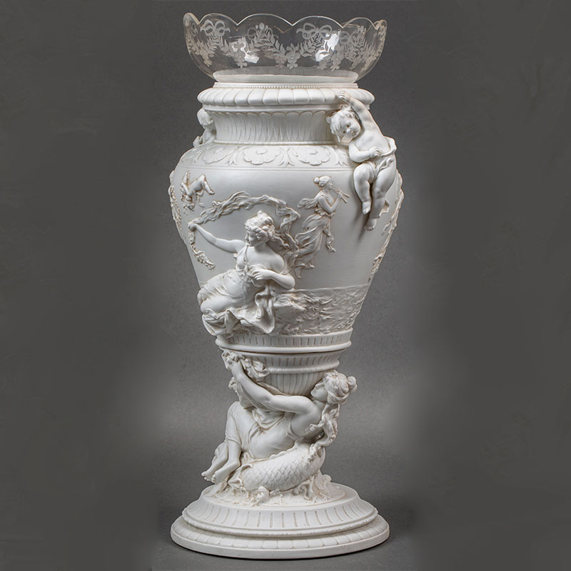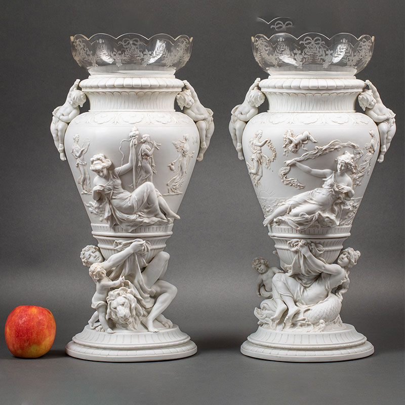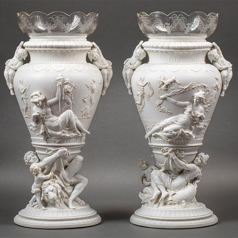 19世纪法国出品古希腊神话主题「命运三女神」素胎瓷嵌水晶花瓶一对