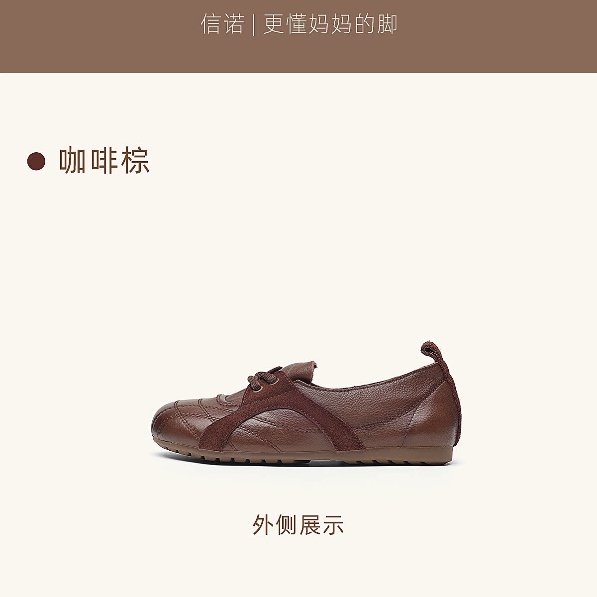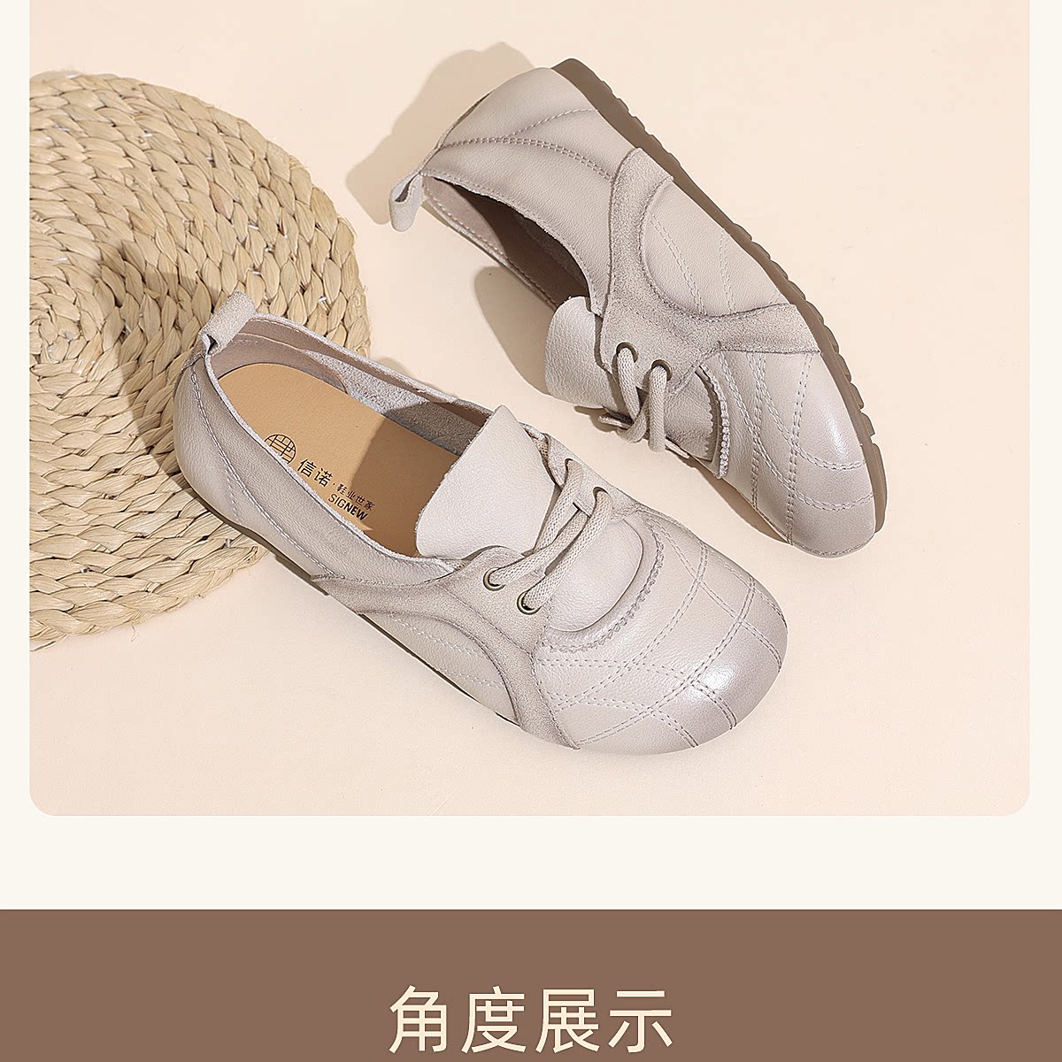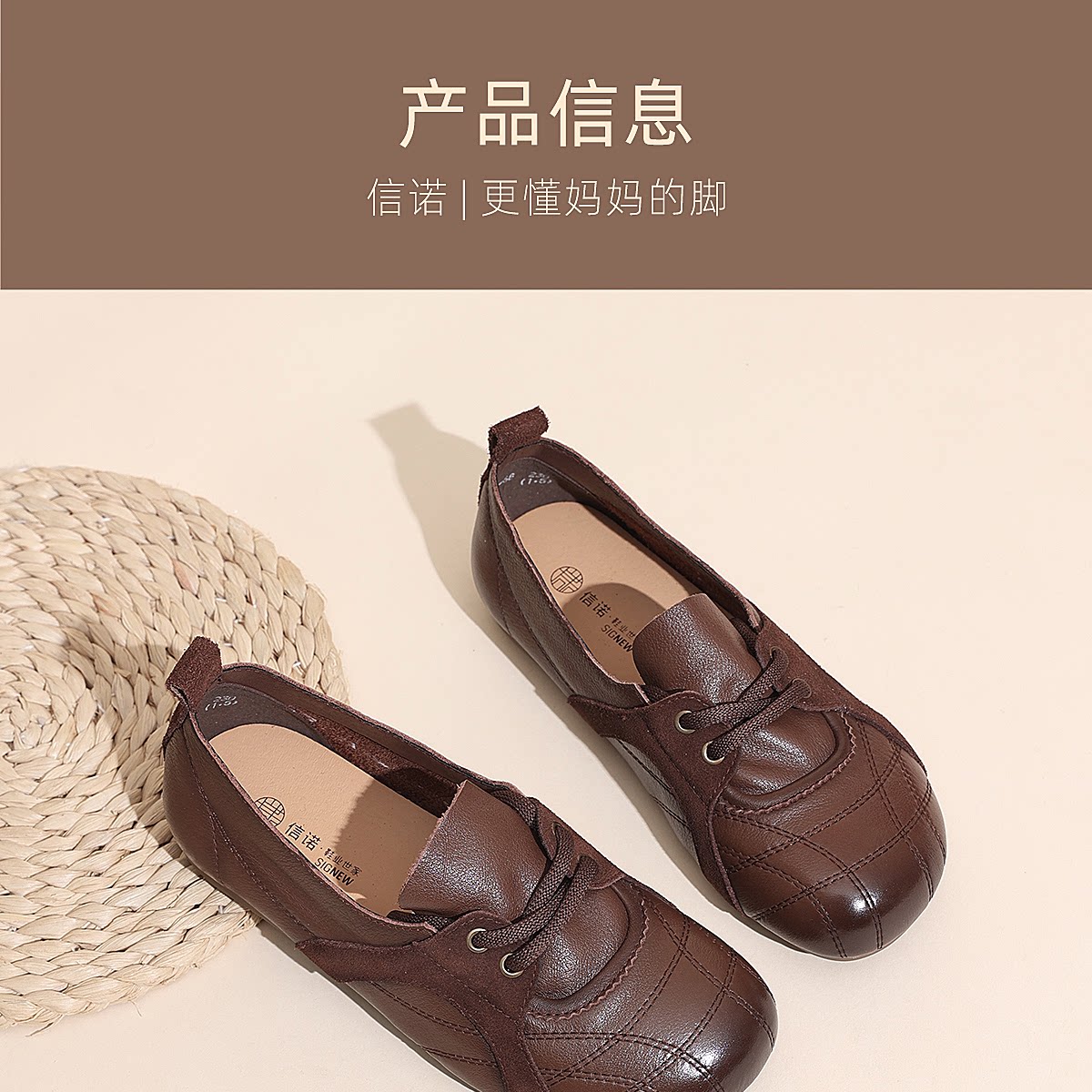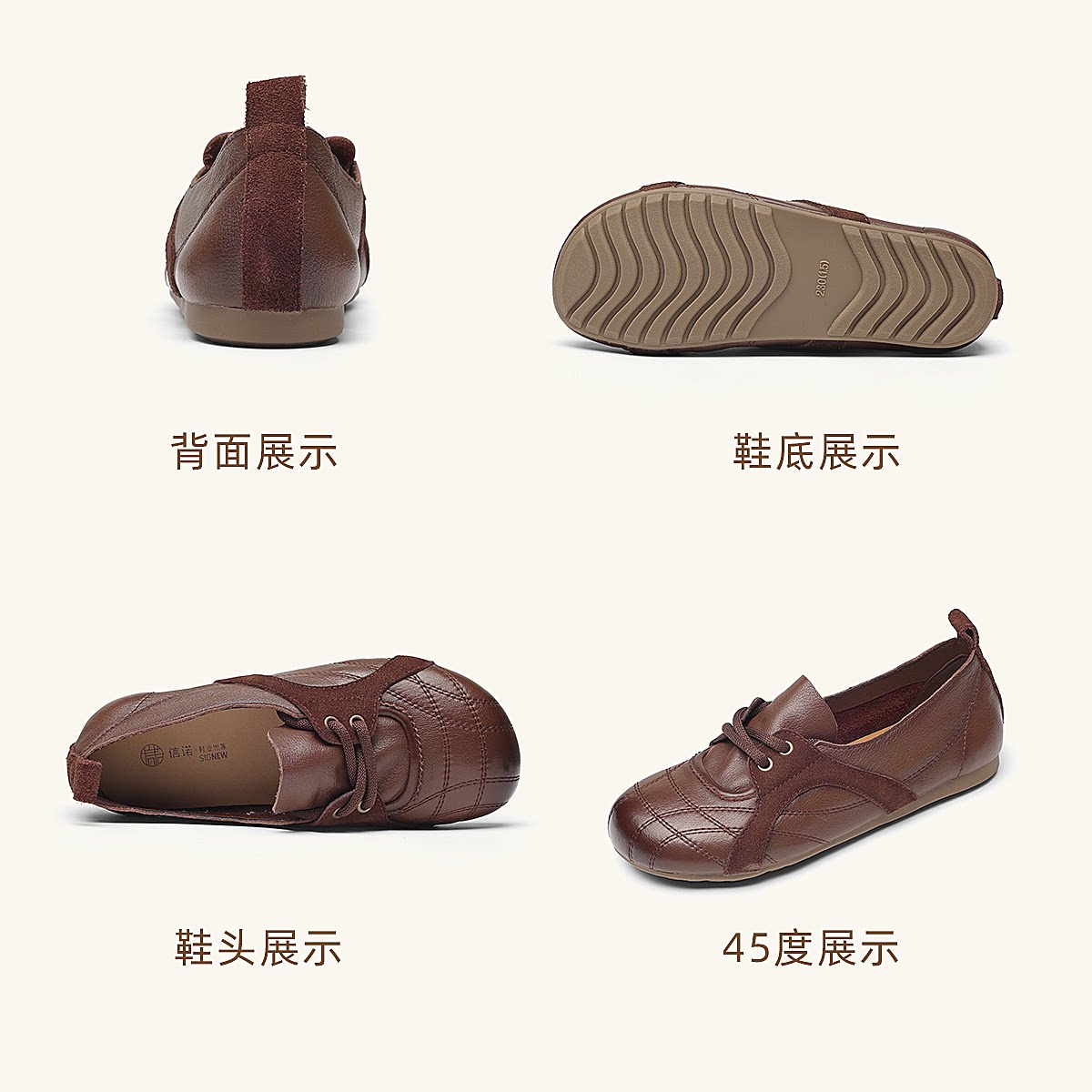 信诺牛皮德训鞋女平底系带休闲鞋圆头软底真皮妈妈鞋X6C020-68
