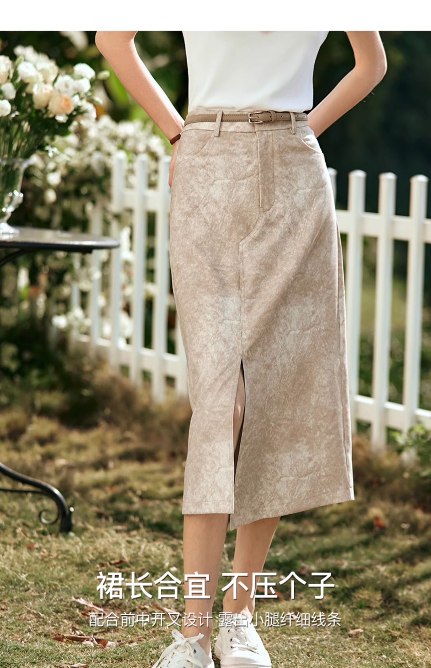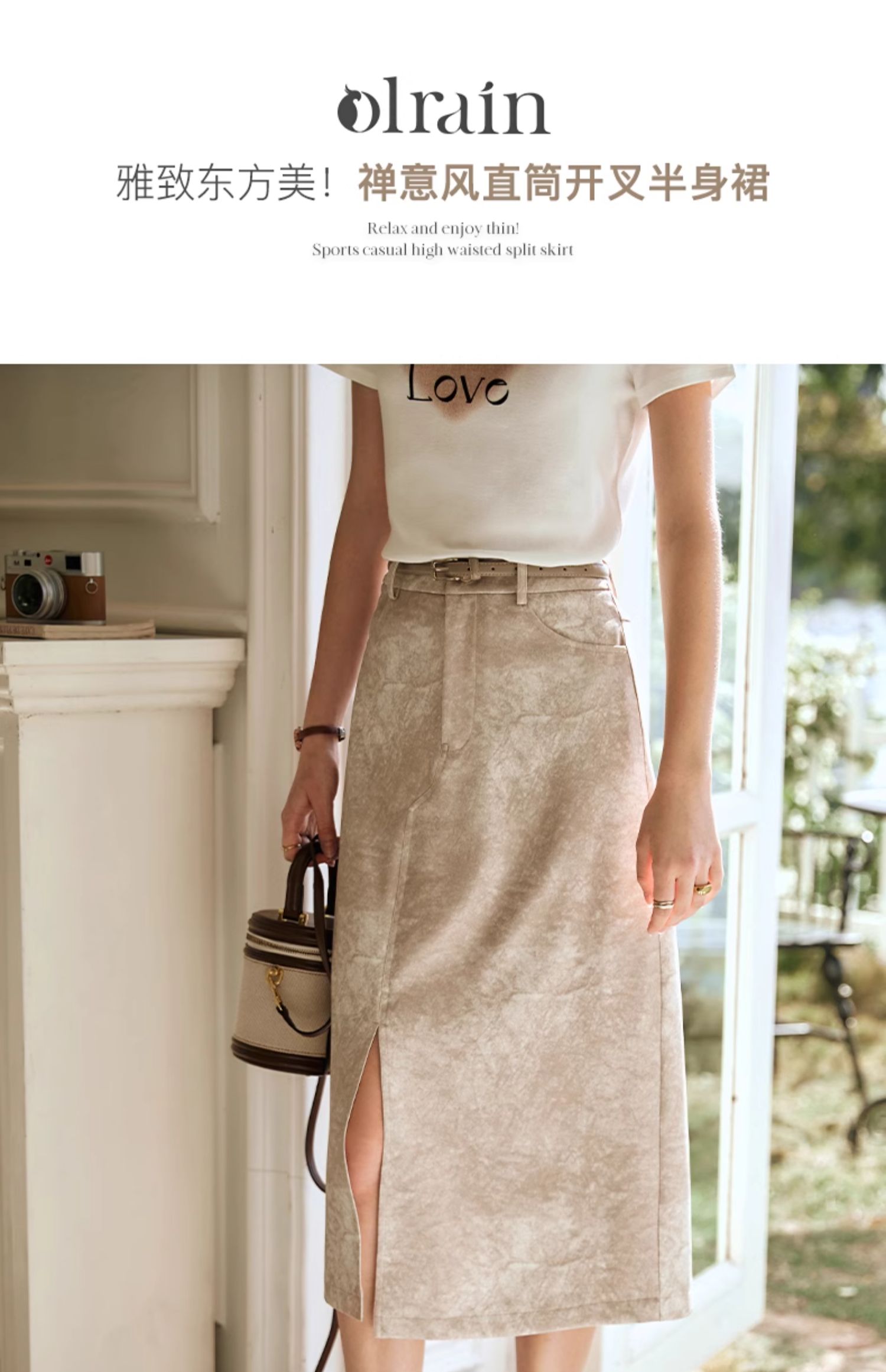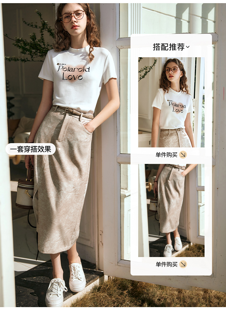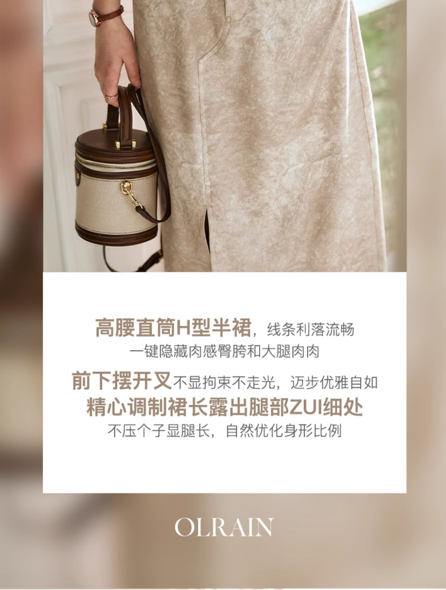 OLrain欧芮儿燕麦色半身裙女春季2024年新款高级水墨印花直筒半裙