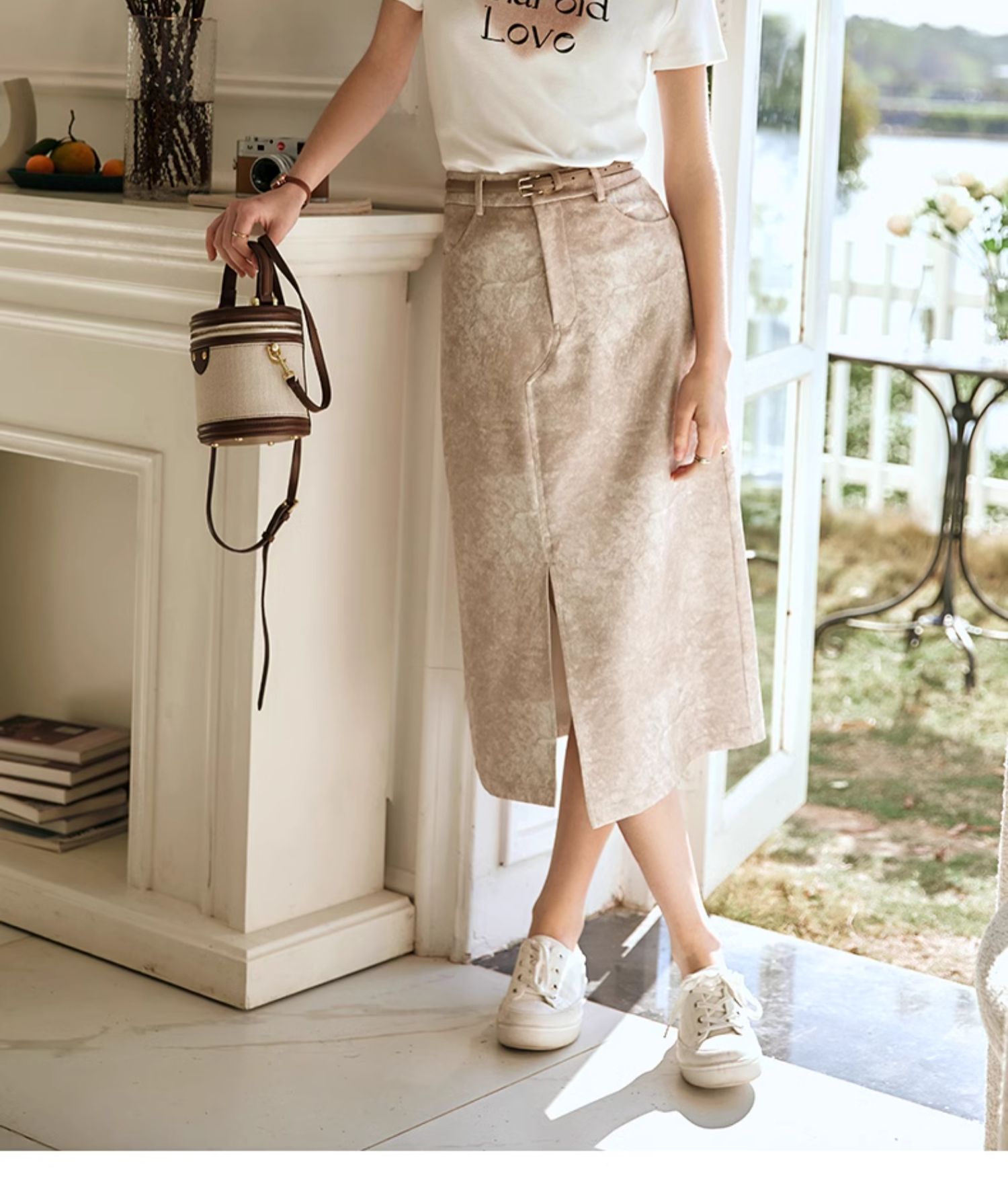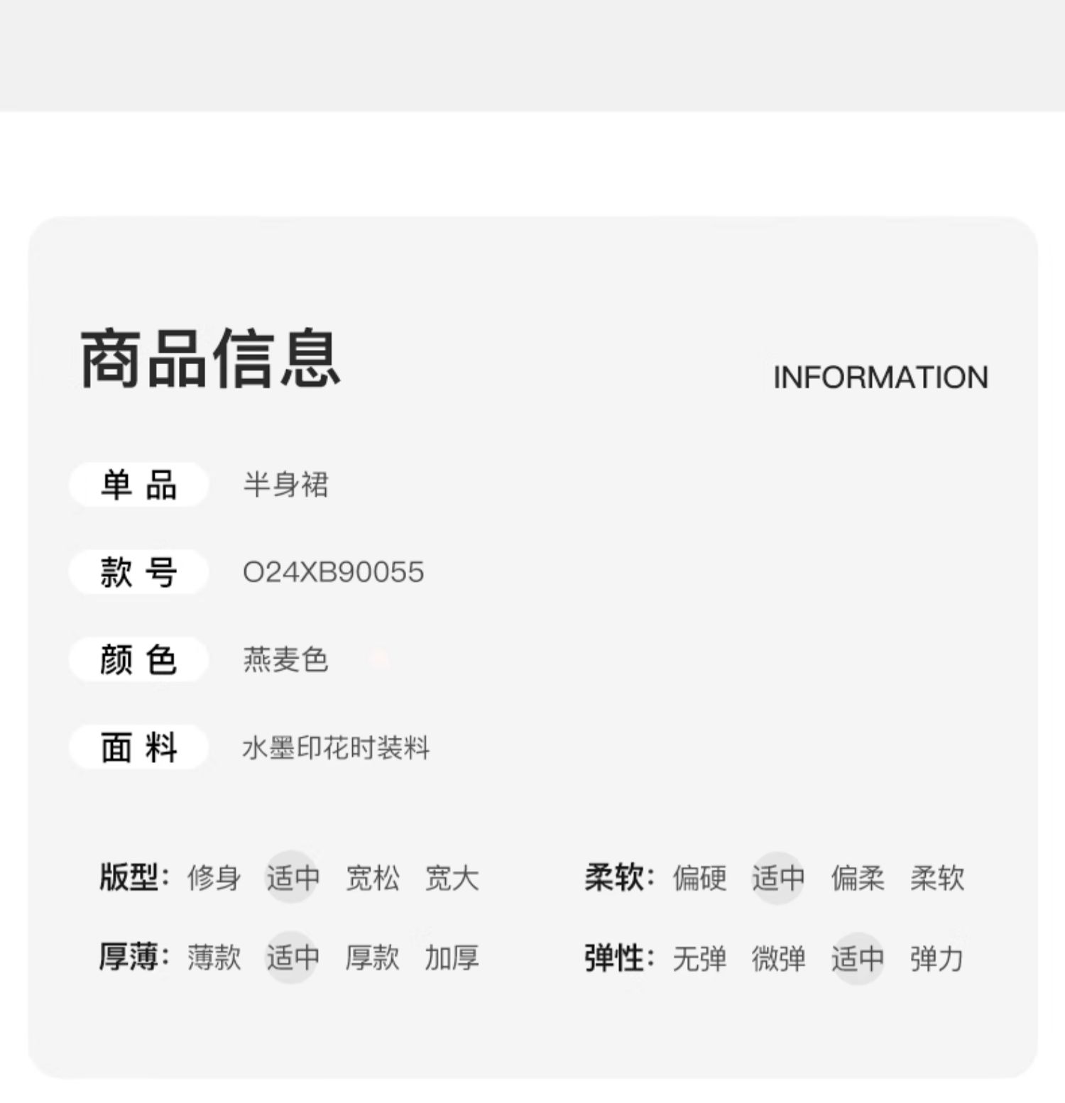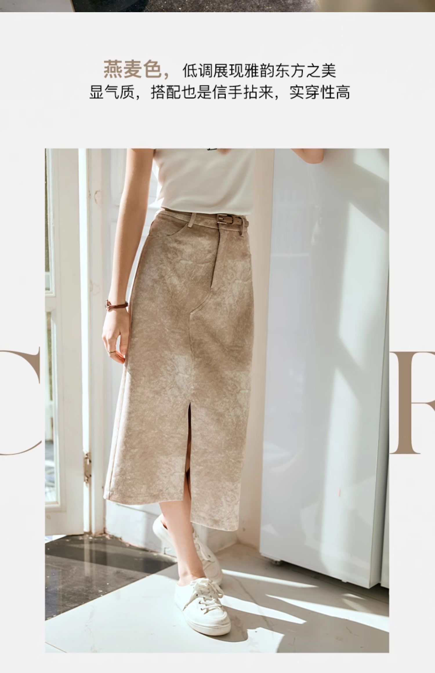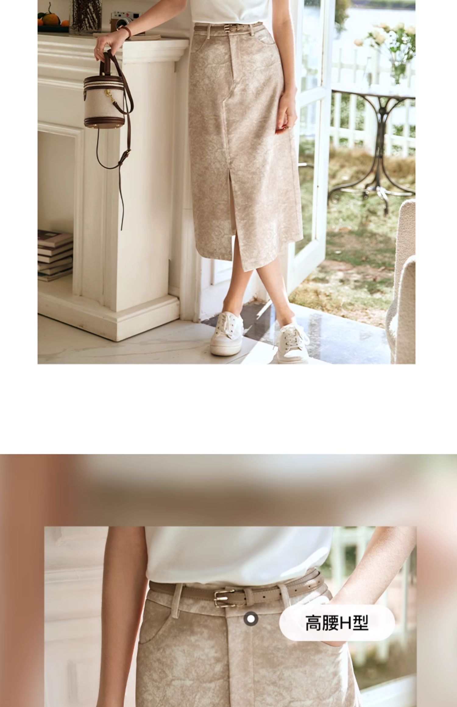 OLrain欧芮儿燕麦色半身裙女春季2024年新款高级水墨印花直筒半裙