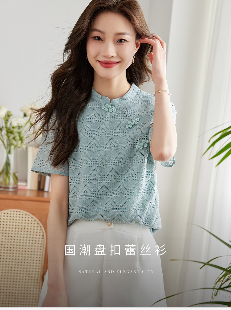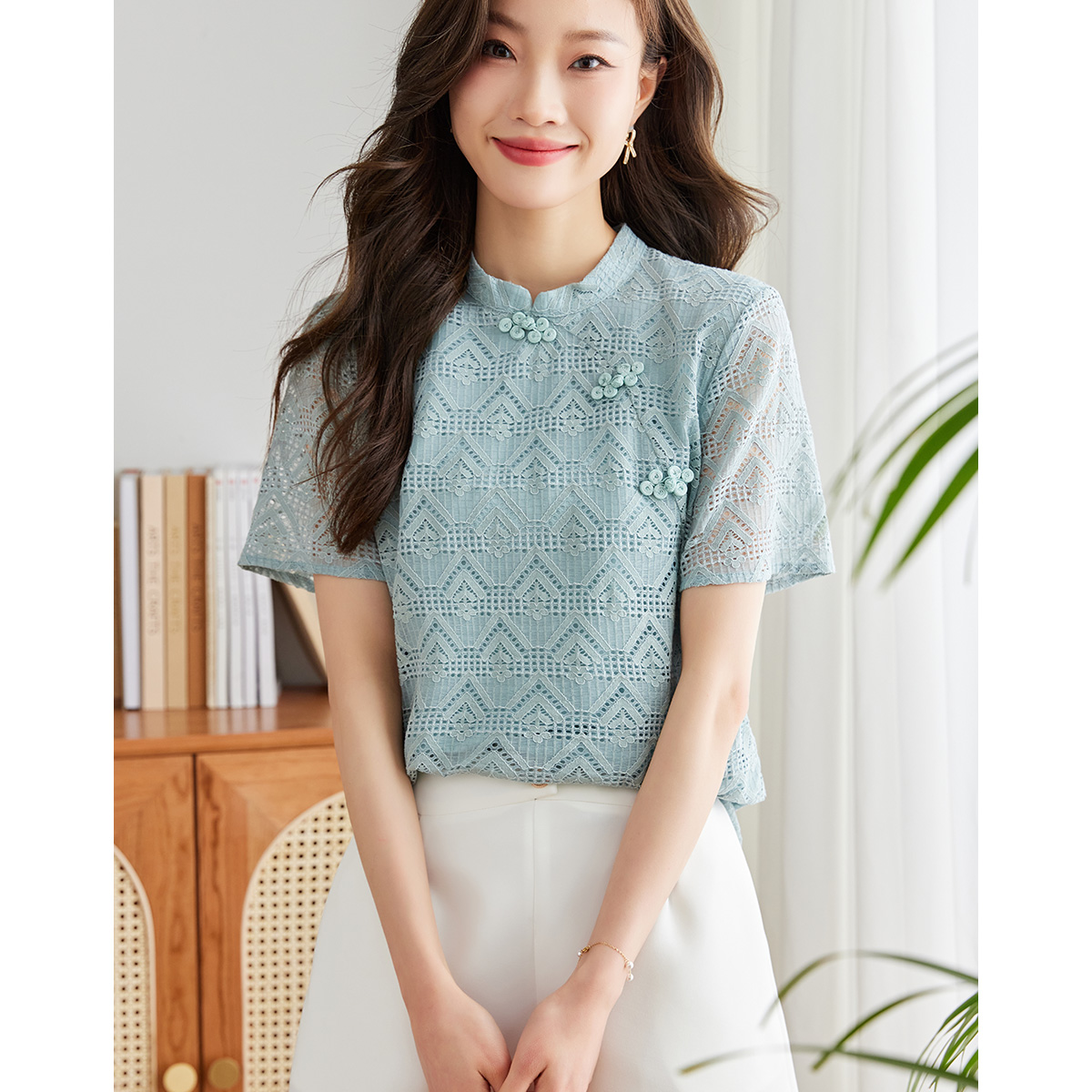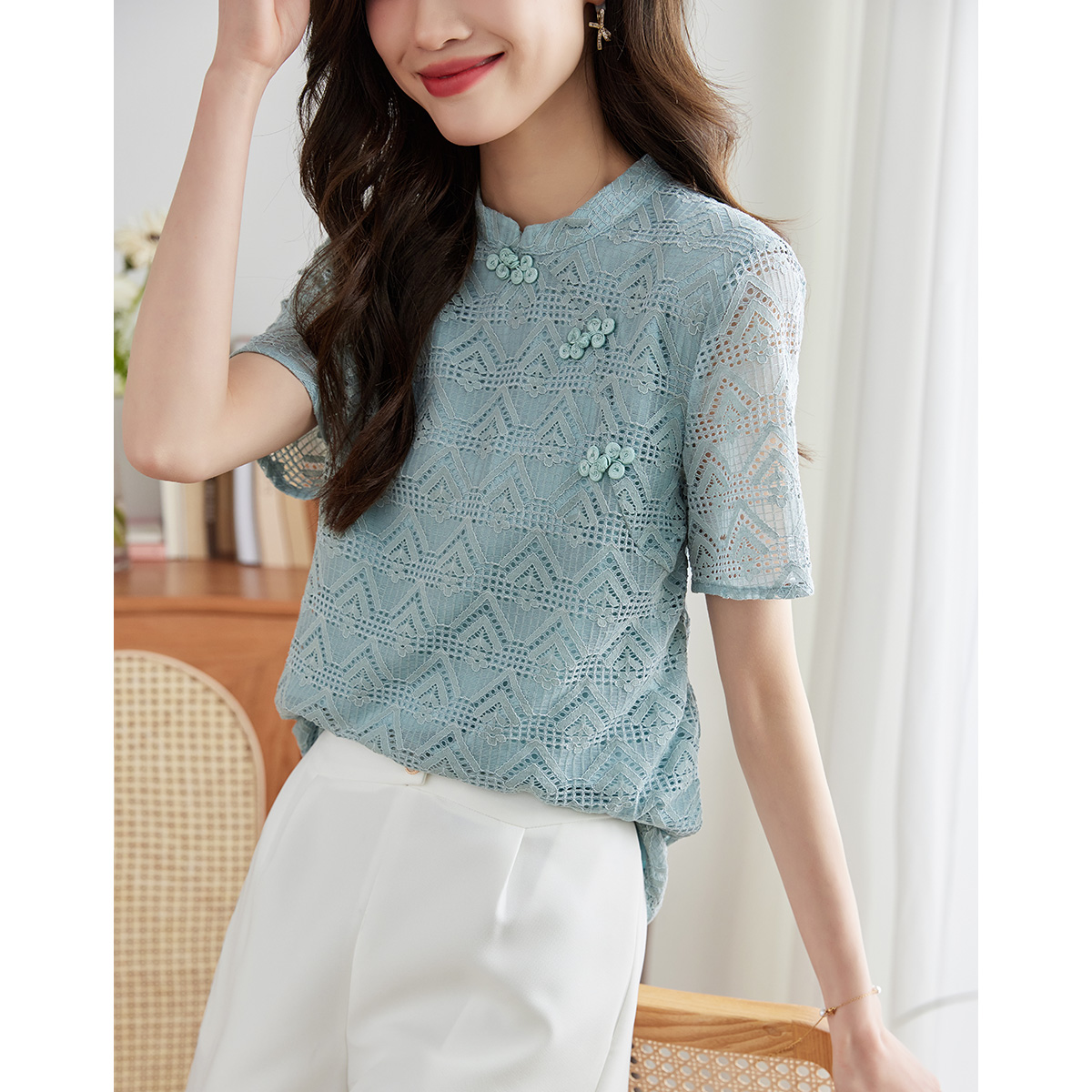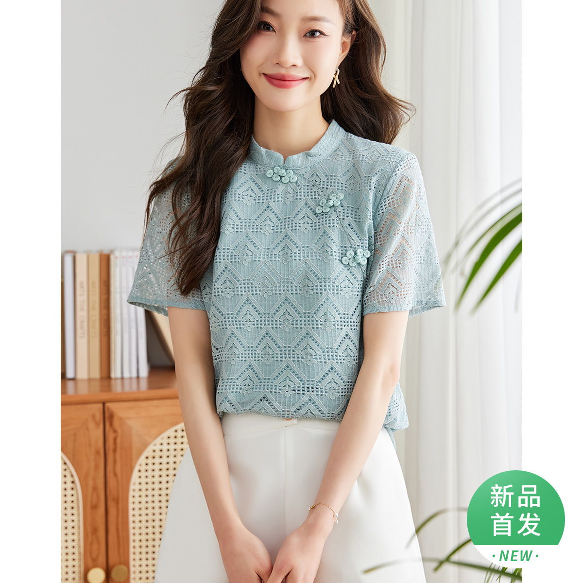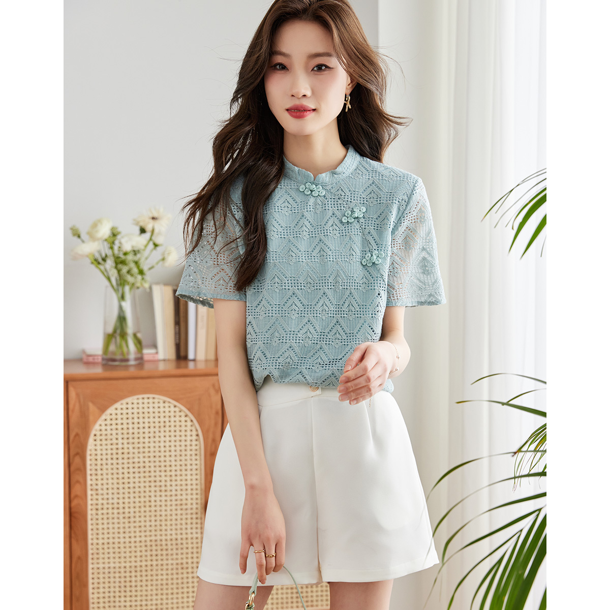 【专属特价】熙世界知性中国风旗袍盘扣蕾丝衫短袖女夏上衣国潮蕾丝衬衫显白仙气衬衣