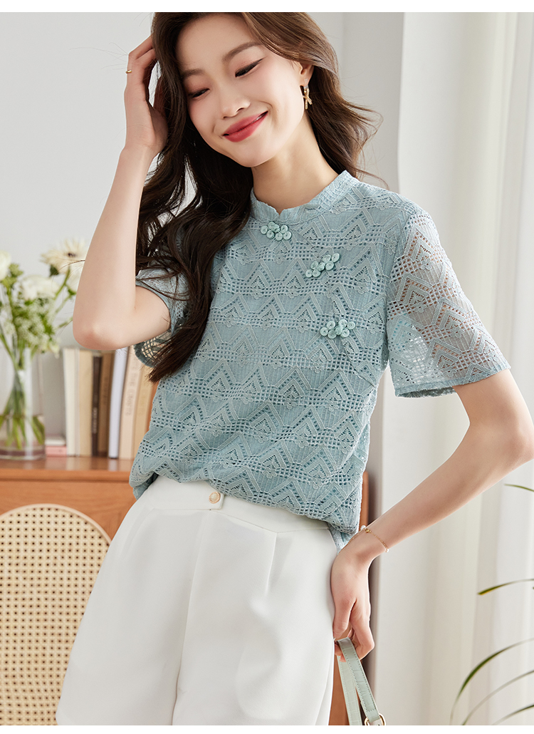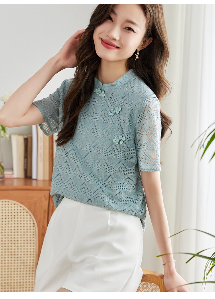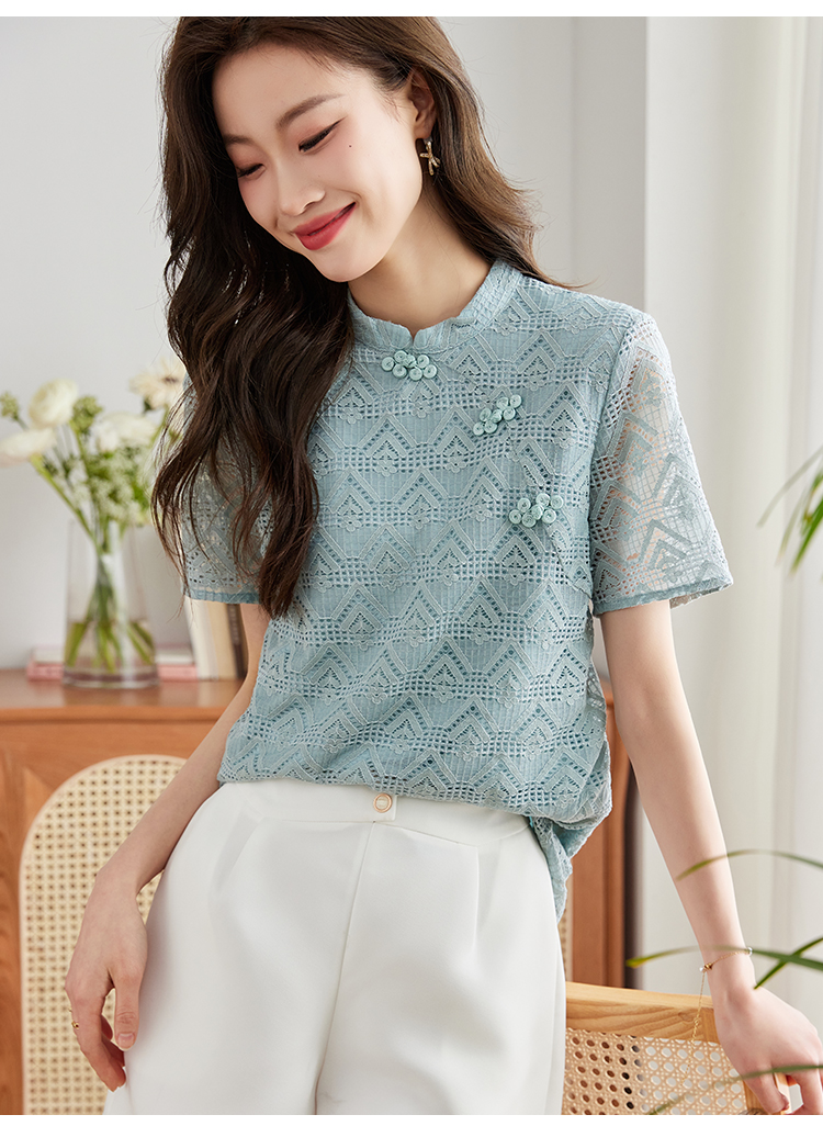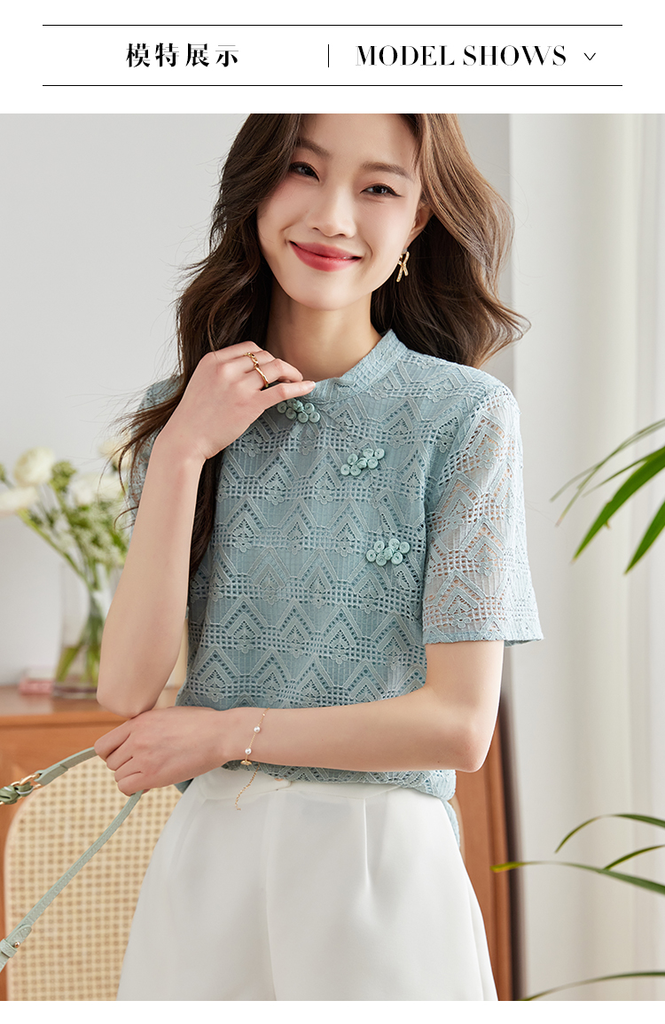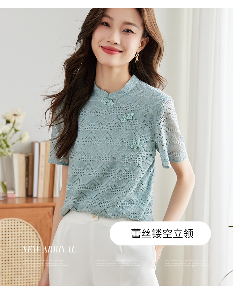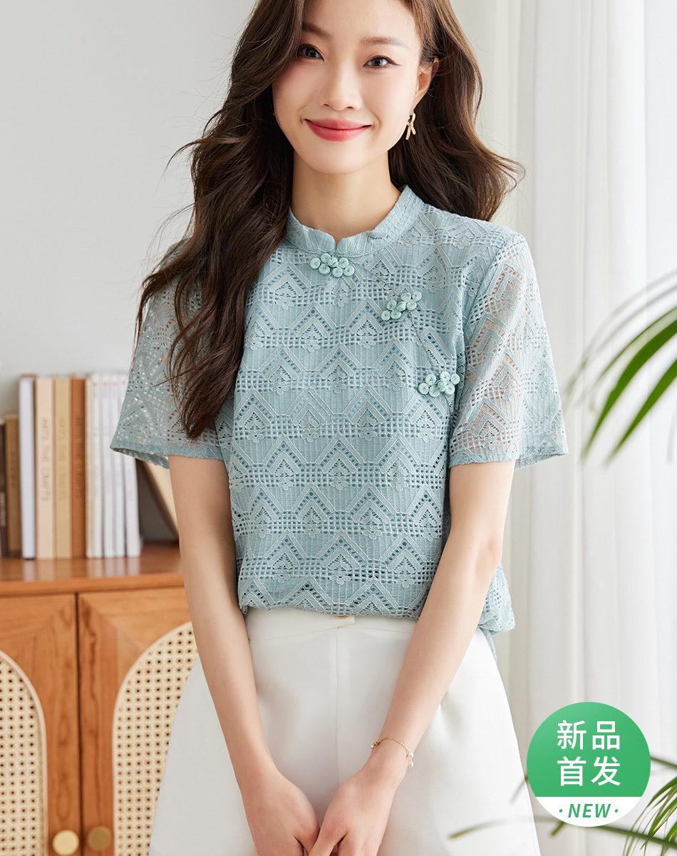 【专属特价】熙世界知性中国风旗袍盘扣蕾丝衫短袖女夏上衣国潮蕾丝衬衫显白仙气衬衣