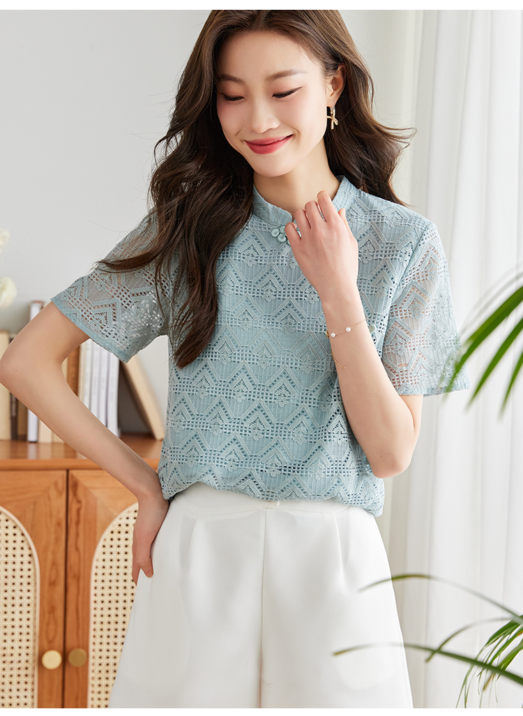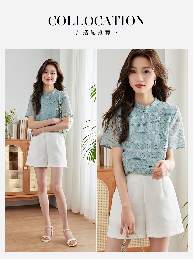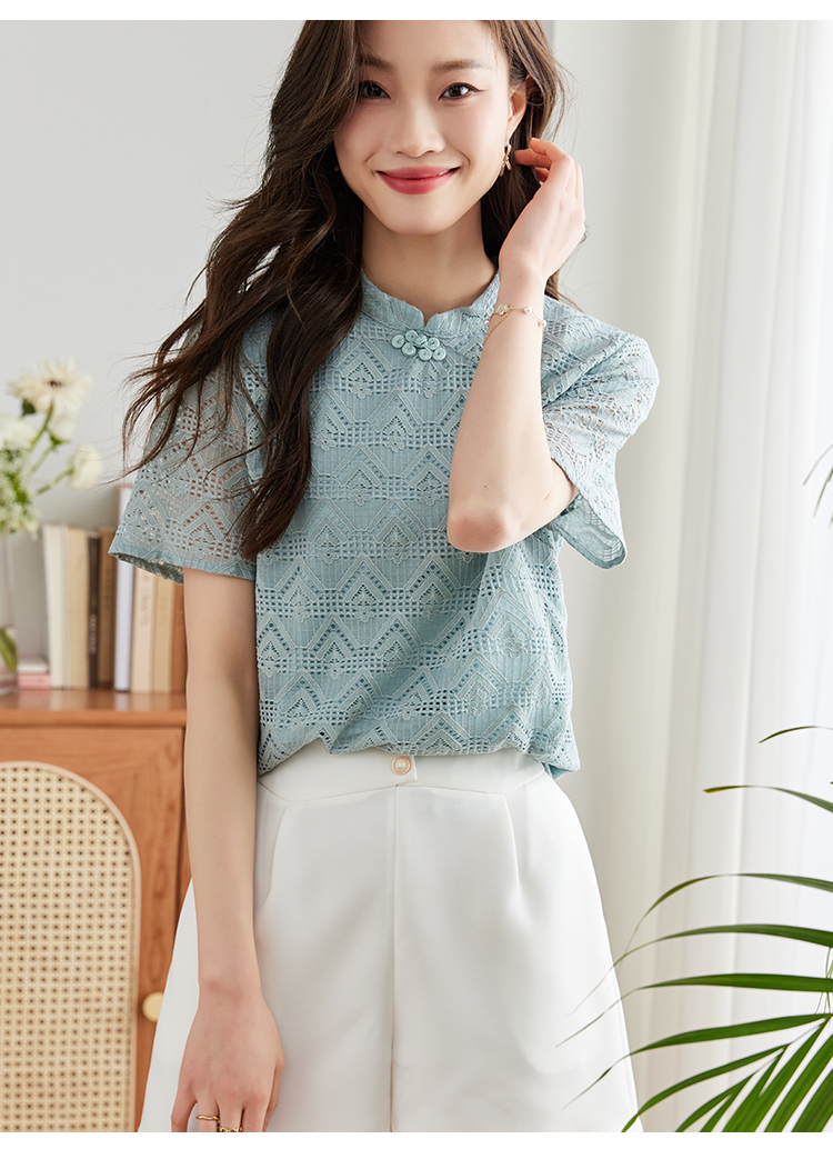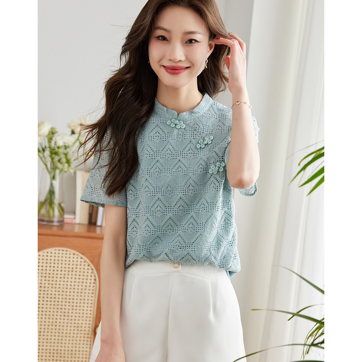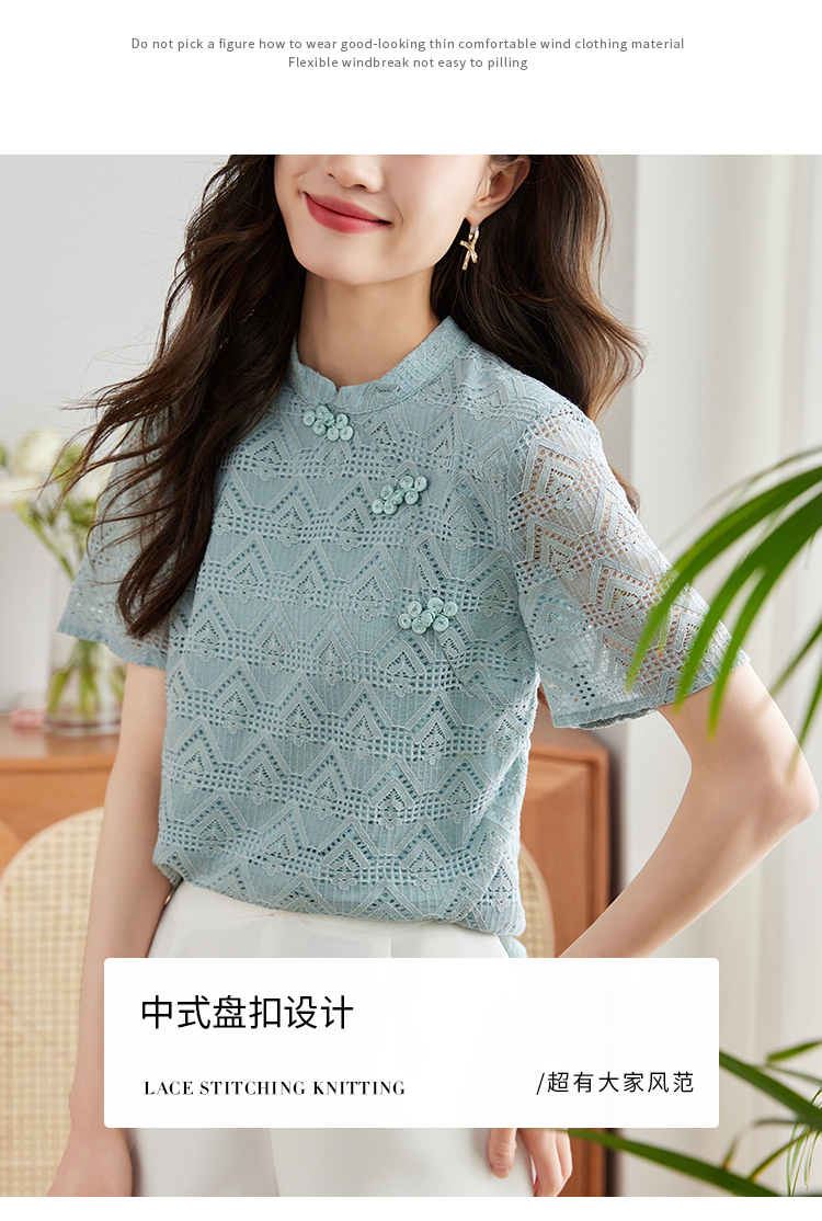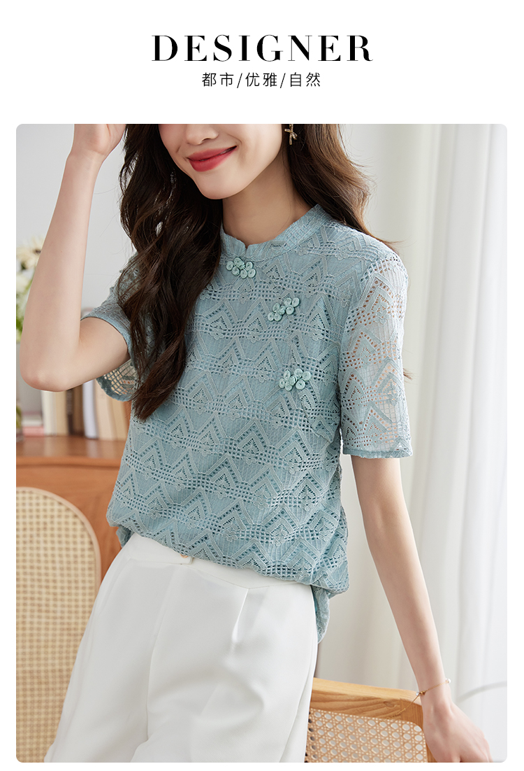 【专属特价】熙世界知性中国风旗袍盘扣蕾丝衫短袖女夏上衣国潮蕾丝衬衫显白仙气衬衣