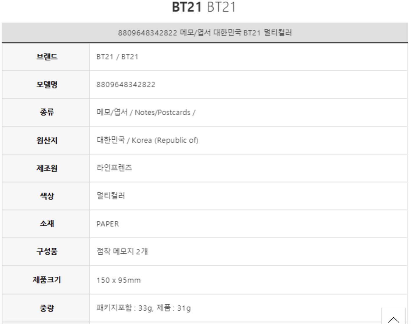 Line Friends BT21 VAN便条纸套装(每包2张)