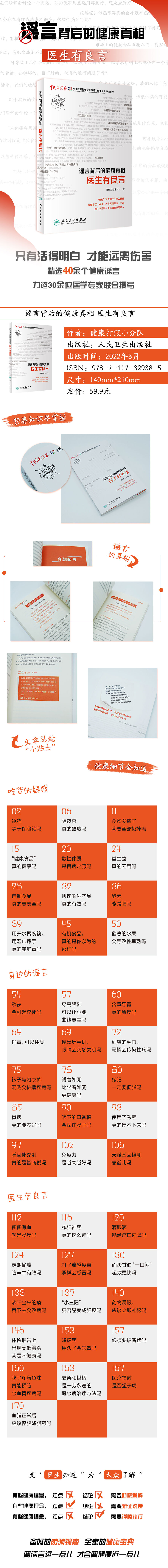 本书邀请协和医院、华西医院、北大医院、积水潭医院、同仁医院等三十余家国内知名三甲医院中青年专家撰写,内容紧扣生活,道理讲得清、大众看得懂、生活用得到。内容包括:吃海参能治疗肿瘤吗;空腹吃柿子会得胃结石吗;酒店的毛巾、马桶、公共更衣室会传染性病吗;用开水烫碗筷、用湿纸巾擦手,这样就能消毒吗;如厕,蹲着比坐着更健康吗;免疫力是越高越好吗;体质、食物分酸碱,酸性体质是百病之源,这是真的吗;排宿便、清肠毒靠谱吗;关节软骨真的能再生吗;定期输液能预防中风吗;眼药真能治疗白内障吗……