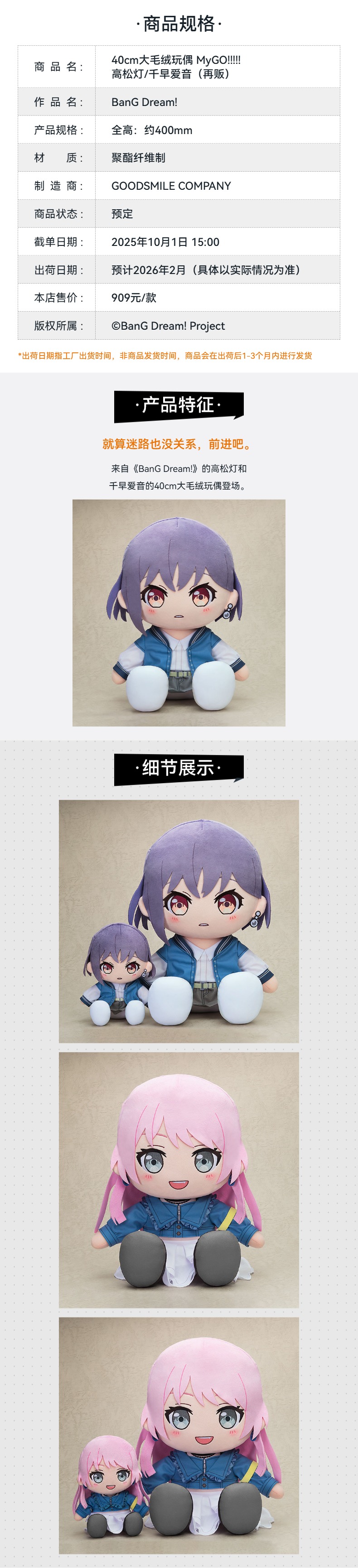 【GSC补款】40cm大毛绒玩偶 MyGO!!!!! 高松灯/千早爱音 (再贩)BanG Dream!