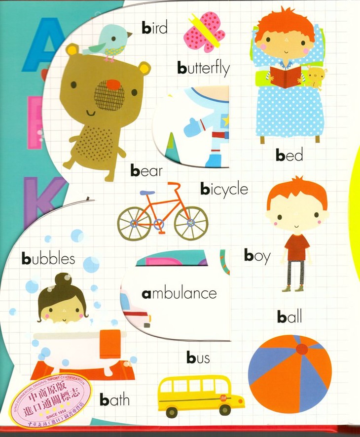 《My Awesome Alphabet》每一页就是一个字母。正面是大大的字母,教孩子认识字母,后一页是相应的单词,孩子可以学习相应的单词。
