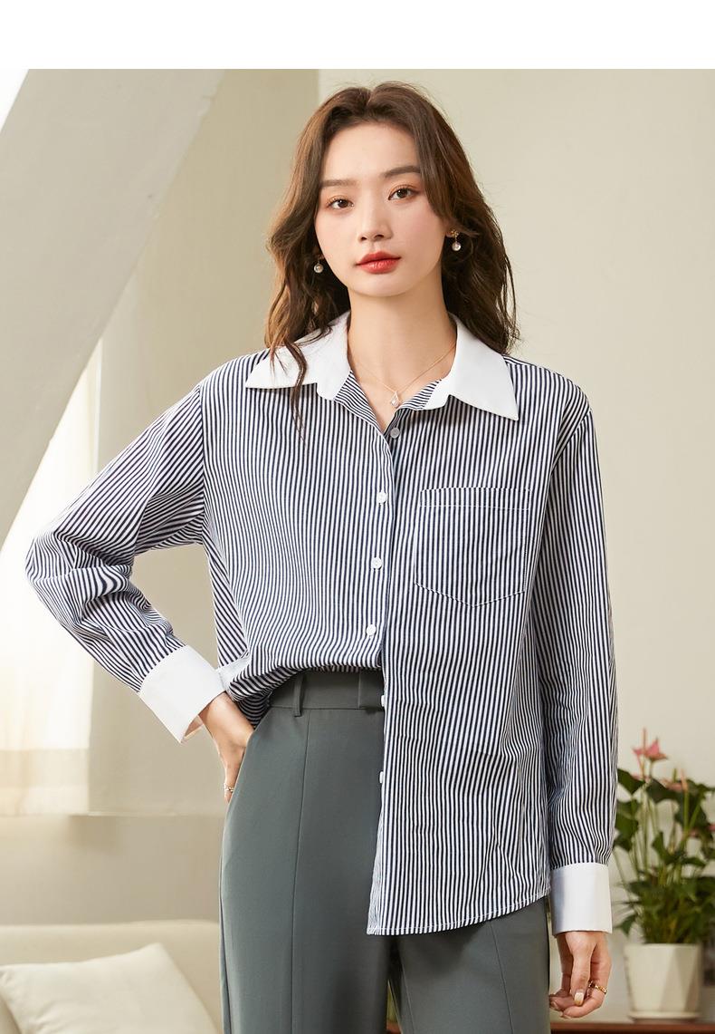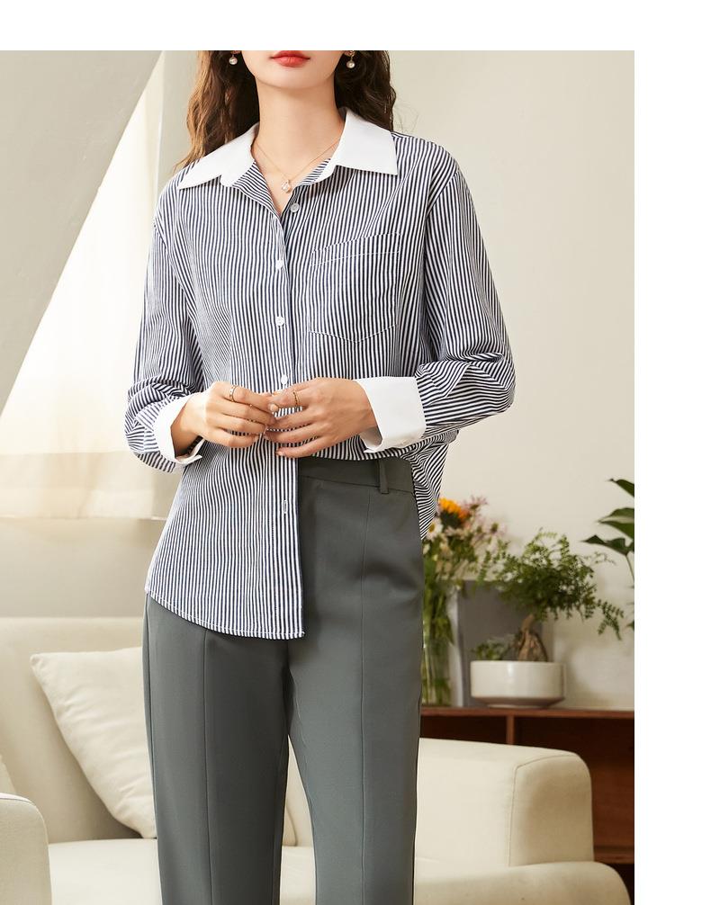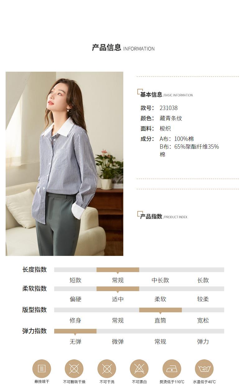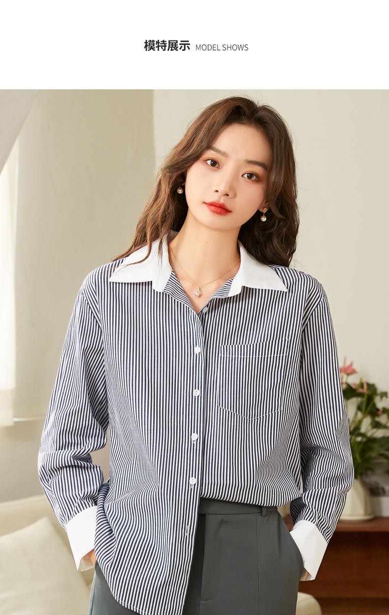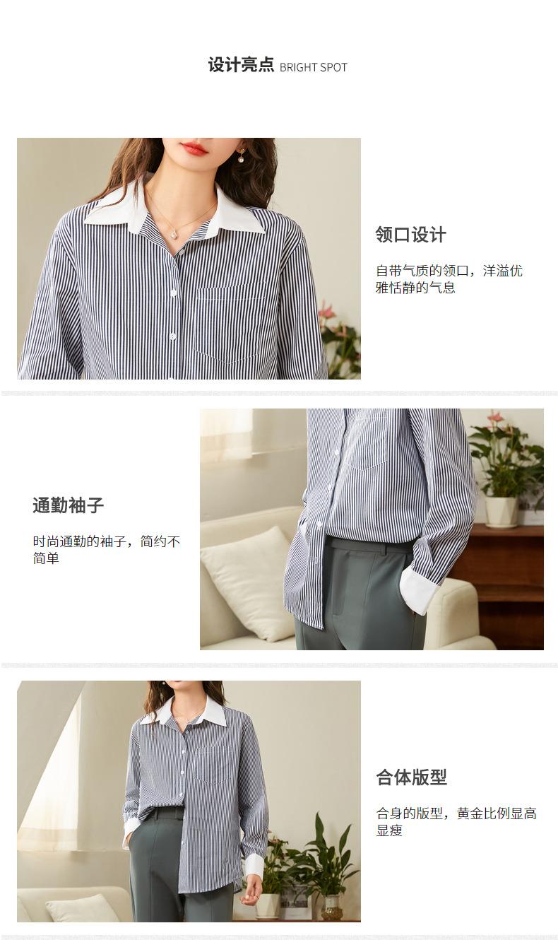 百姿 竖纹长袖衬衫2023秋季新款都市翻领单排扣纯棉直筒衬衣女