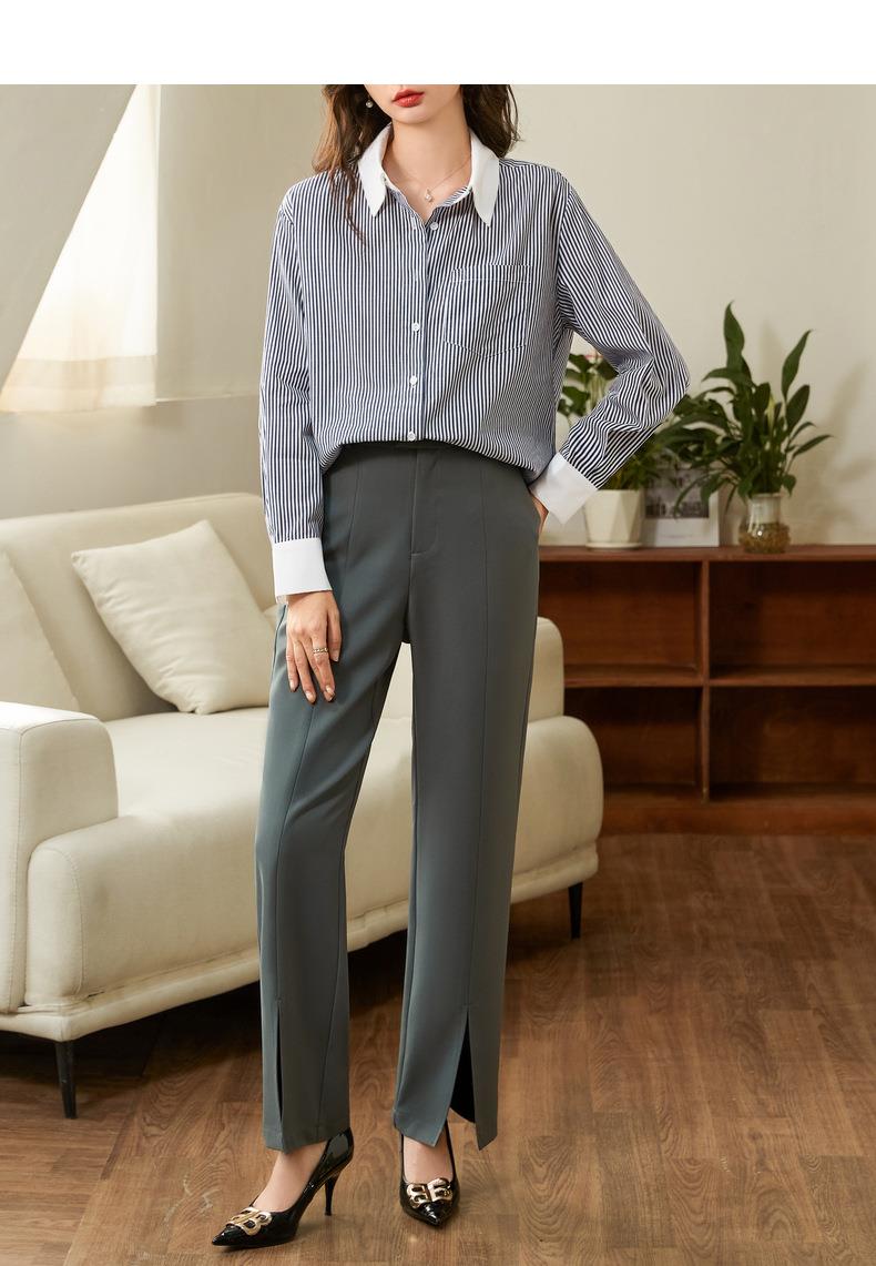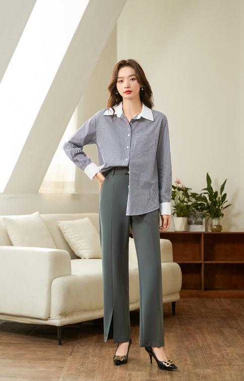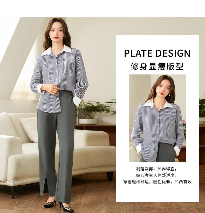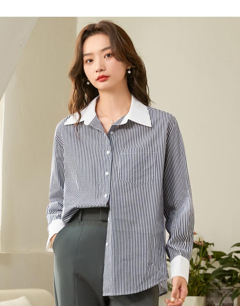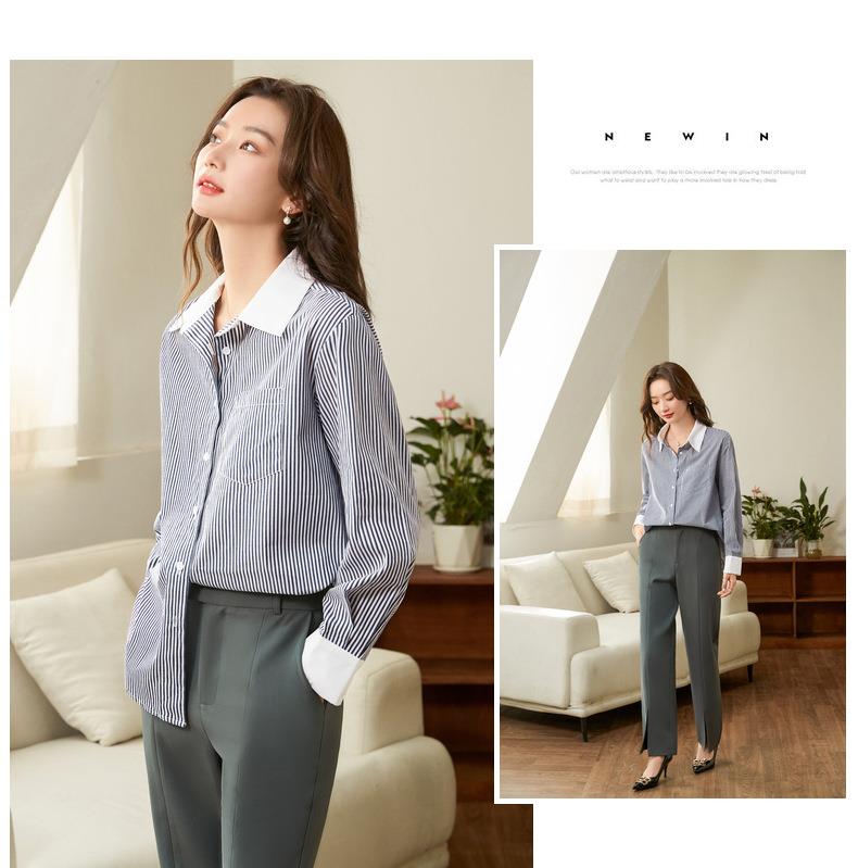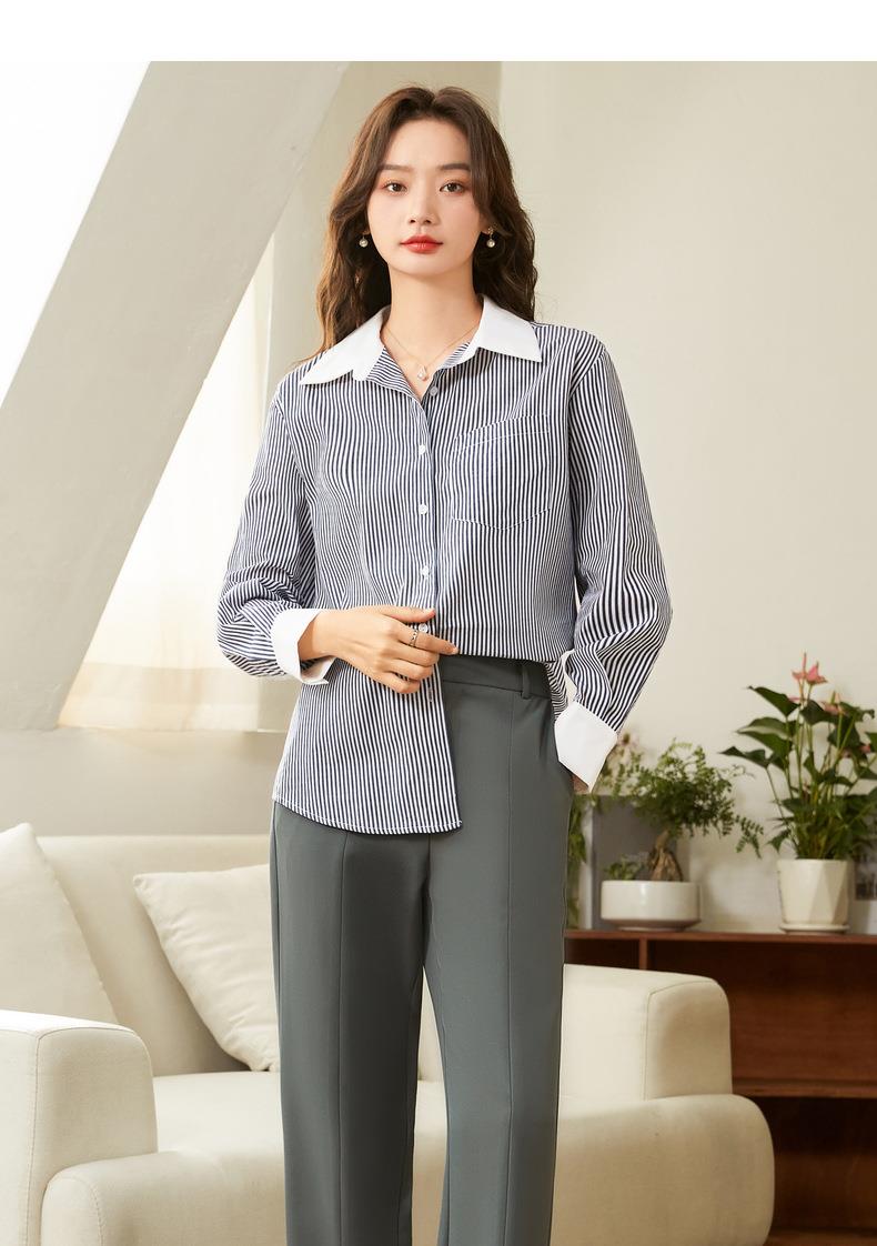 百姿 竖纹长袖衬衫2023秋季新款都市翻领单排扣纯棉直筒衬衣女