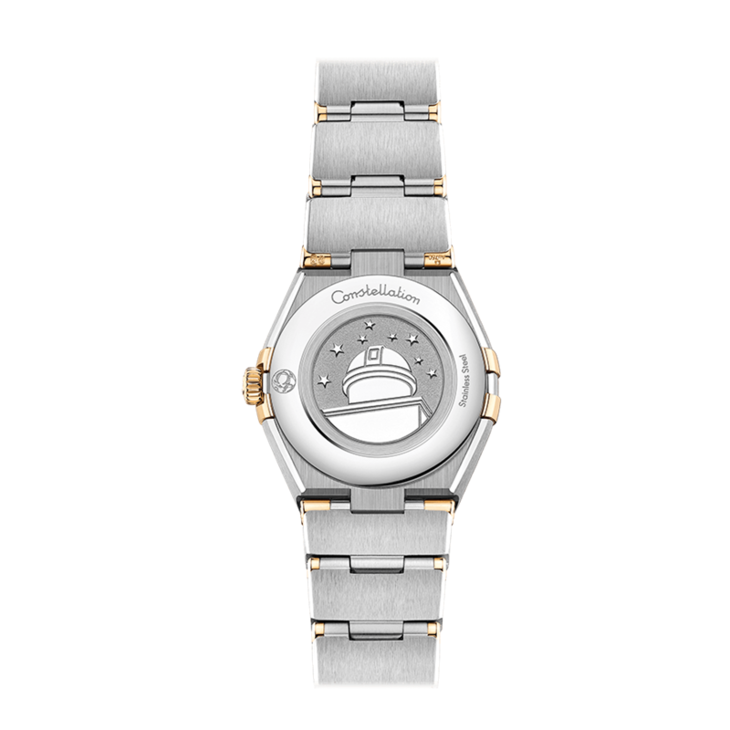 镜面材质 | 蓝宝石水晶玻璃 | 表盘 | 经典的半月形切面、“托爪”以及mono-rang表链。 黄色18K金与精钢打造,表圈镌刻罗马数字刻度,香槟色太阳纹饰表盘饰有钻石小时刻度,覆以耐磨损蓝宝石玻璃表镜。指针、欧米茄品牌标识、星座徽标以及钻石托槽亦以黄色18K金打造而成。 密底,表背印有星座天文台徽章。 |