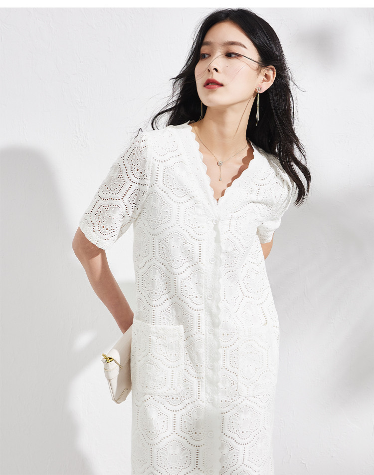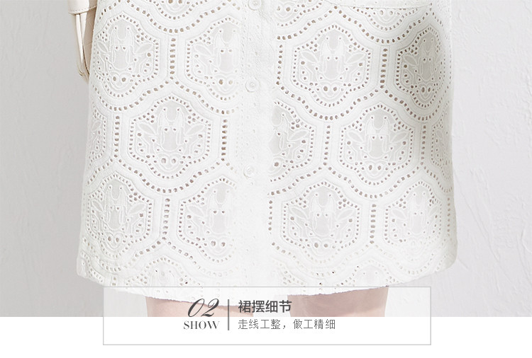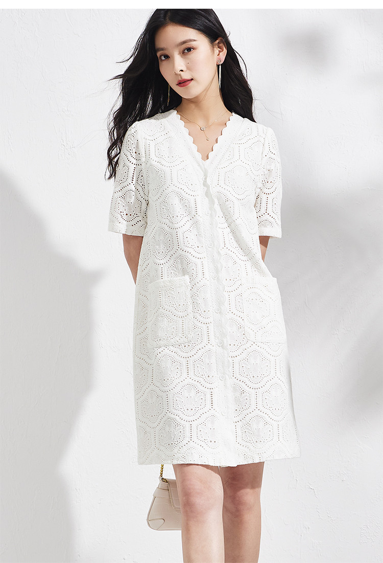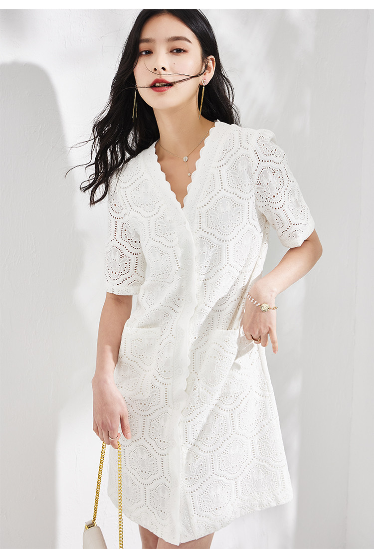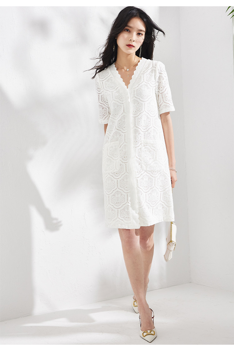 芳外镂空蕾丝开衫裙2夏季新款镂空蕾丝淑女V领开衫连衣裙