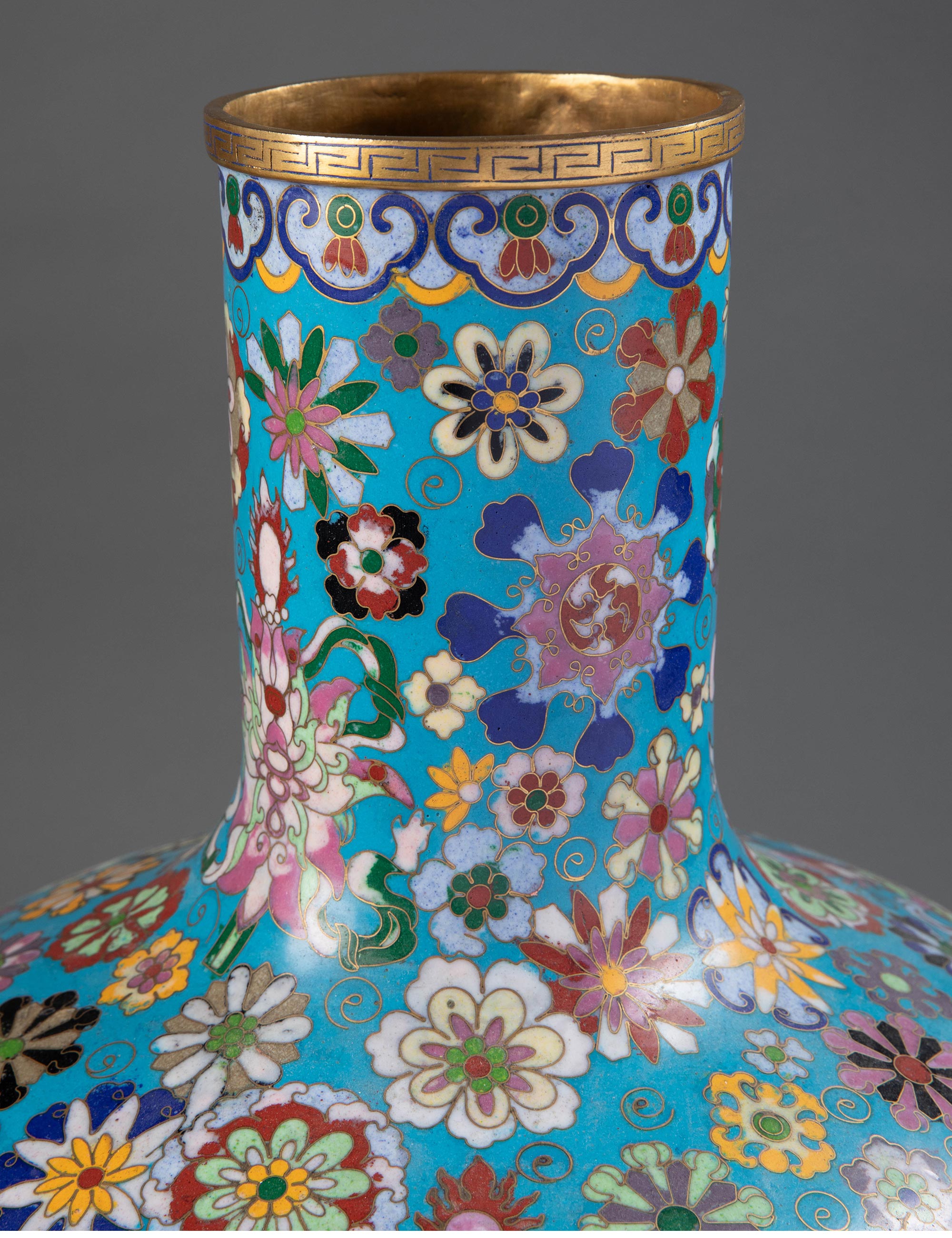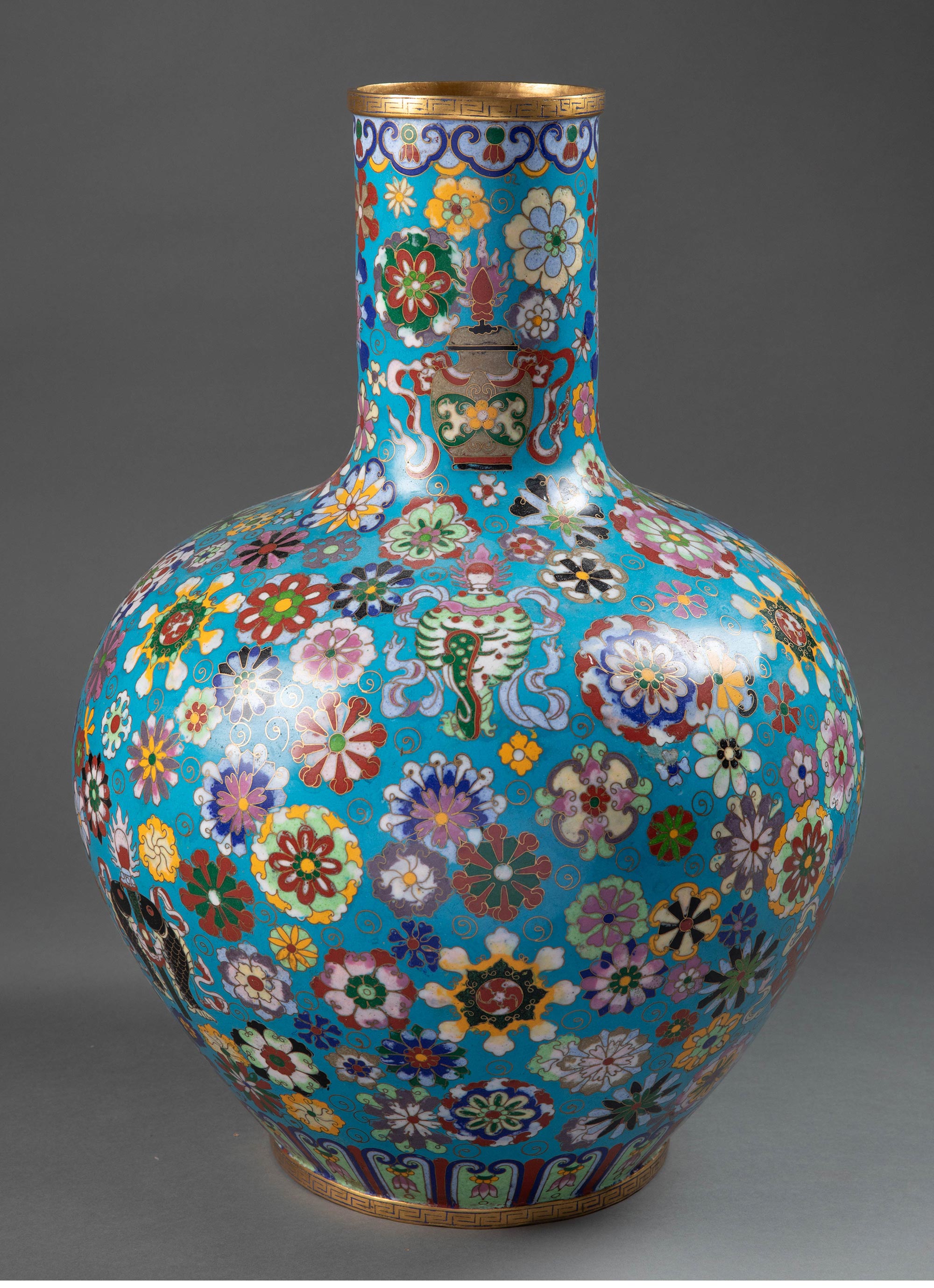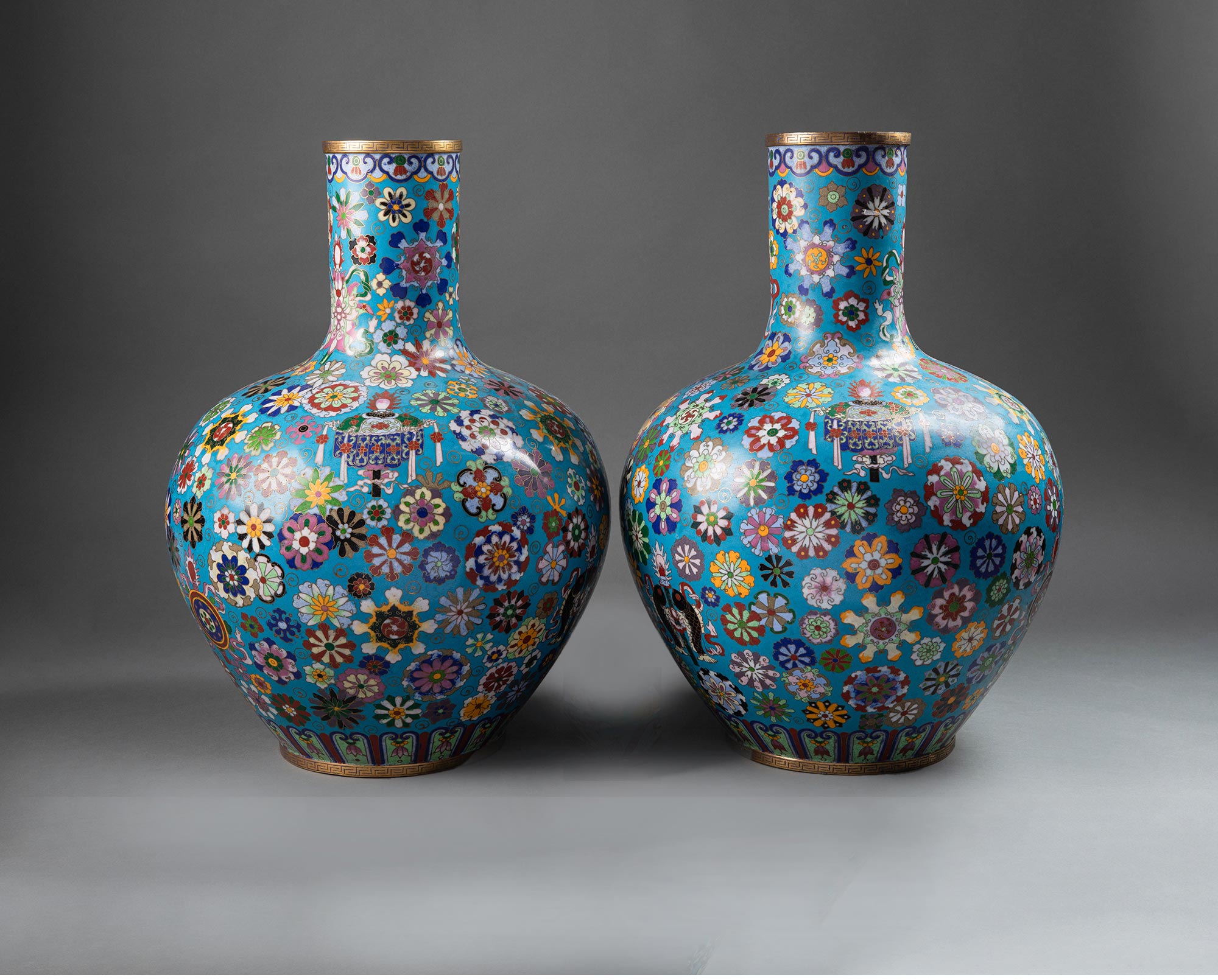 19世纪末20世纪初中国出品鱼跃繁花纹景泰蓝天球瓶一对