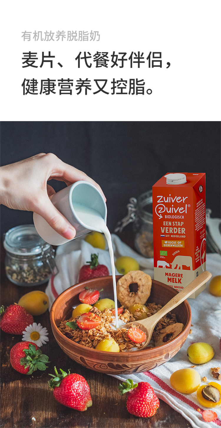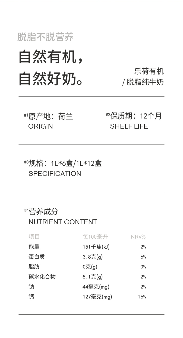 【乐荷】荷兰进口有机纯牛奶 欧盟有机认证 脱脂牛奶1L*6礼盒/1L*12盒