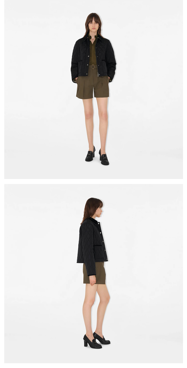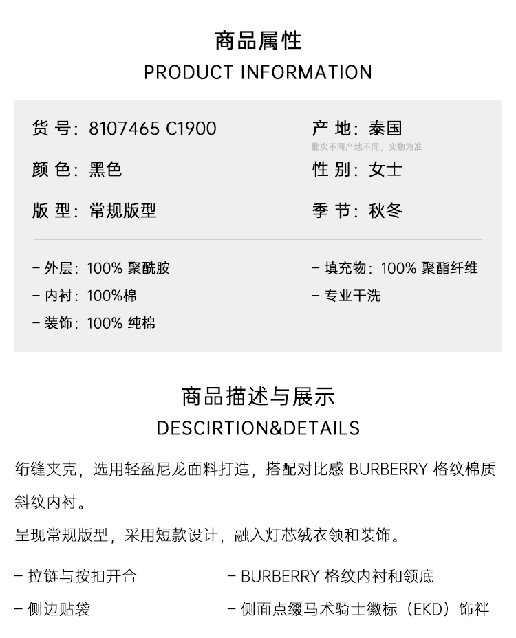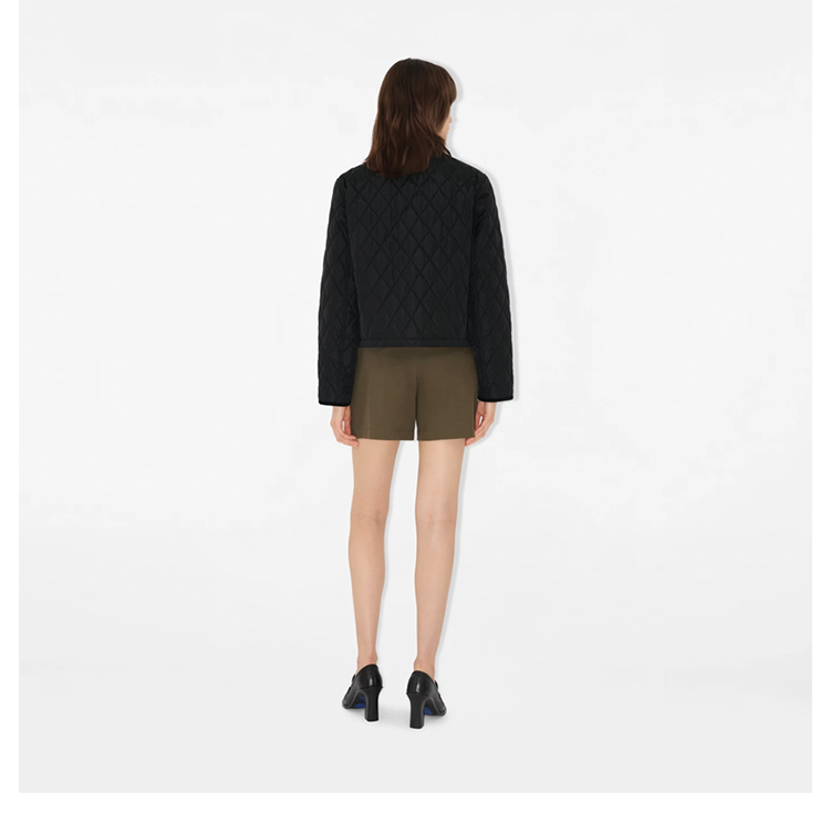 BURBERRY 巴宝莉 女士马术骑士徽标及腰短款绗缝尼龙夹克棉服 黑色 8107465 C1900
