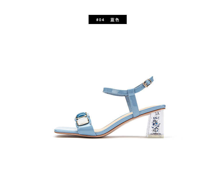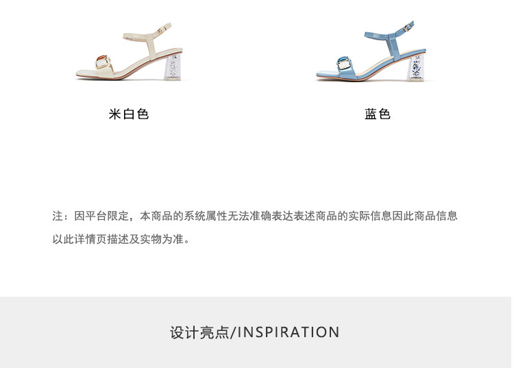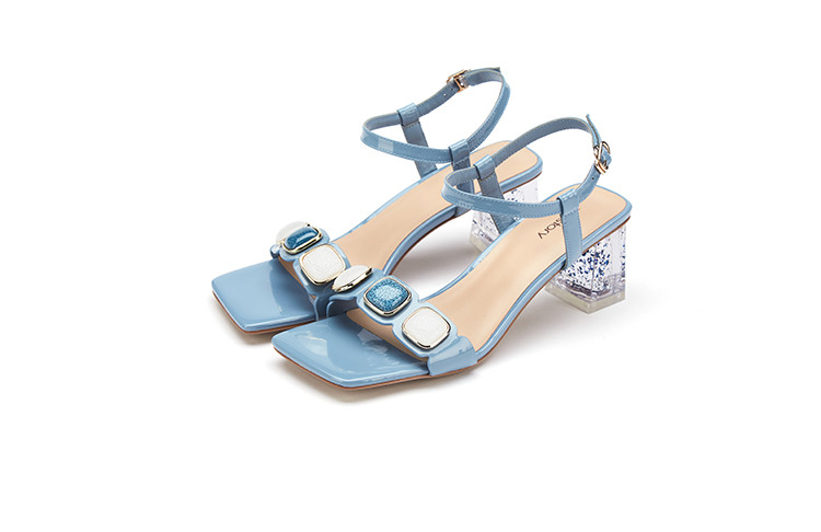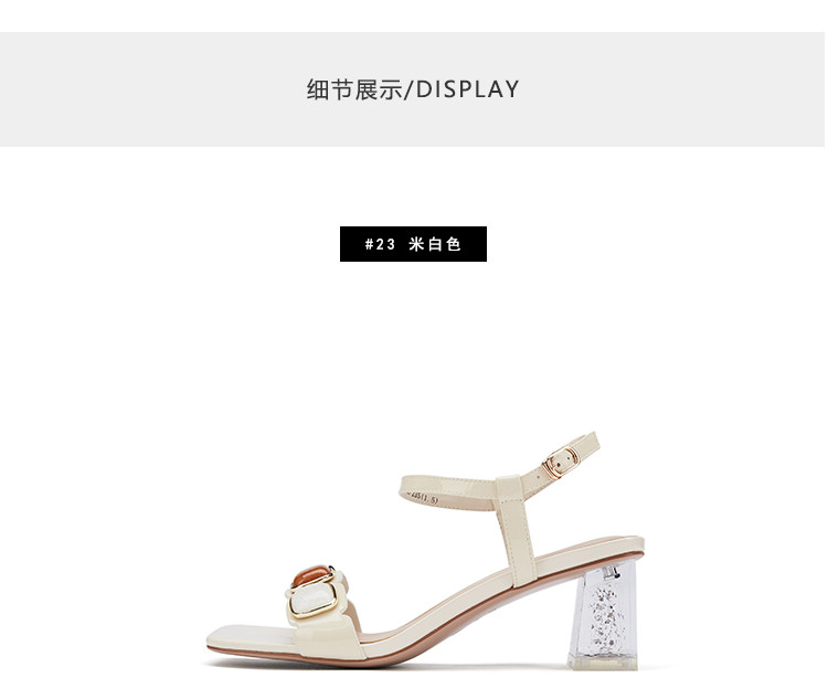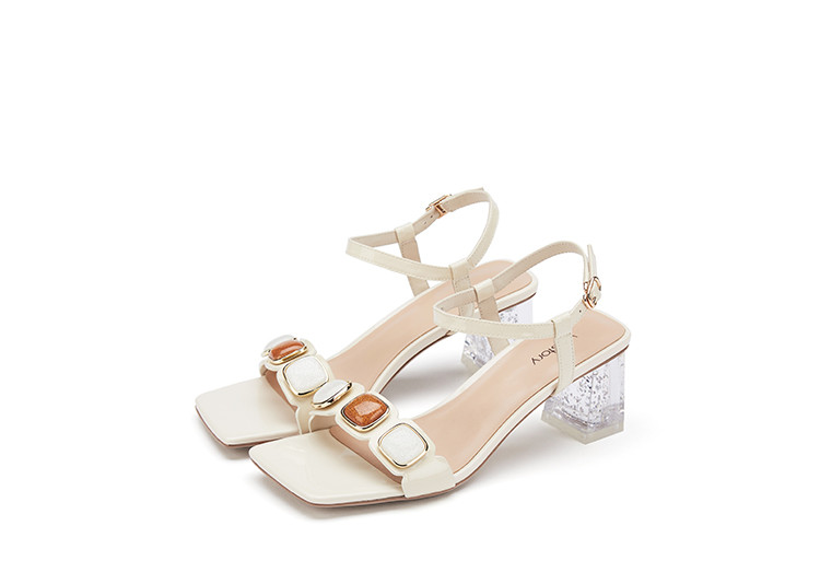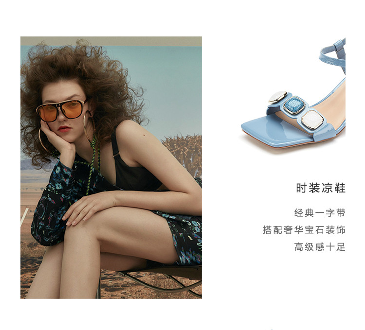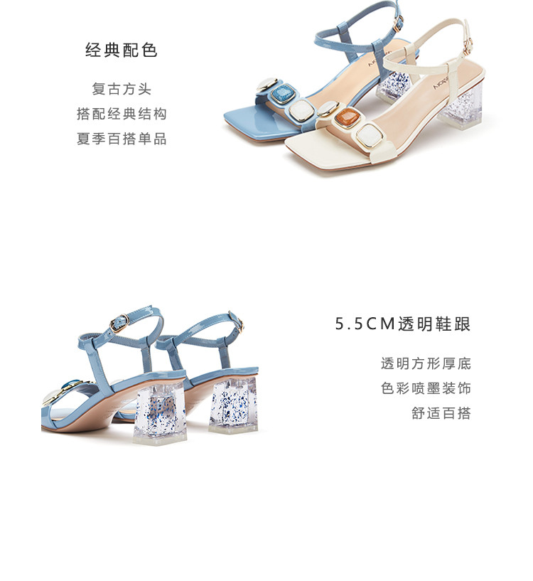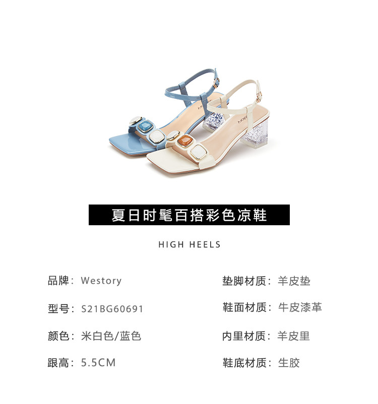 westory女鞋2021夏季新款一字带简约饰扣舒适水晶粗跟中低跟凉鞋女夏S21BG60691