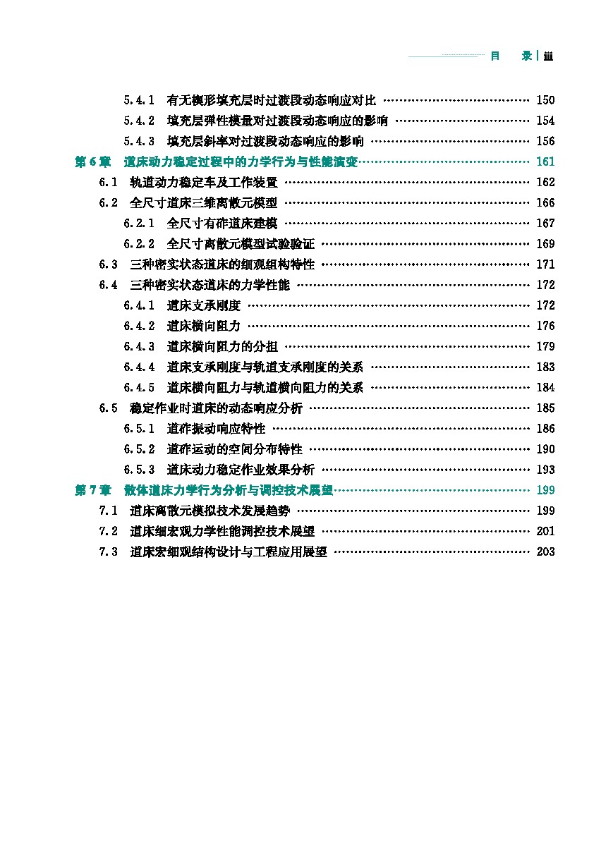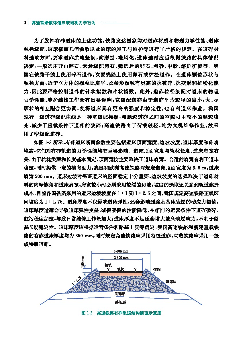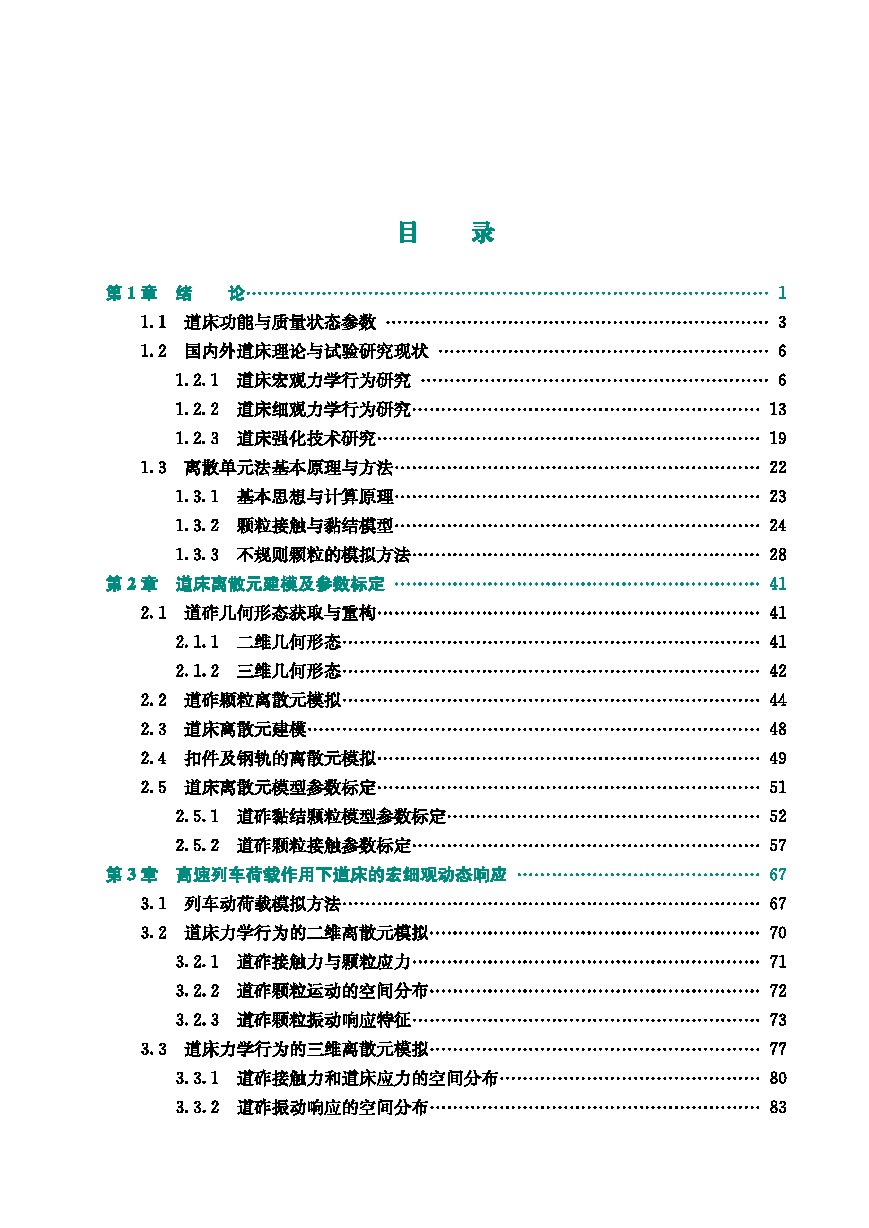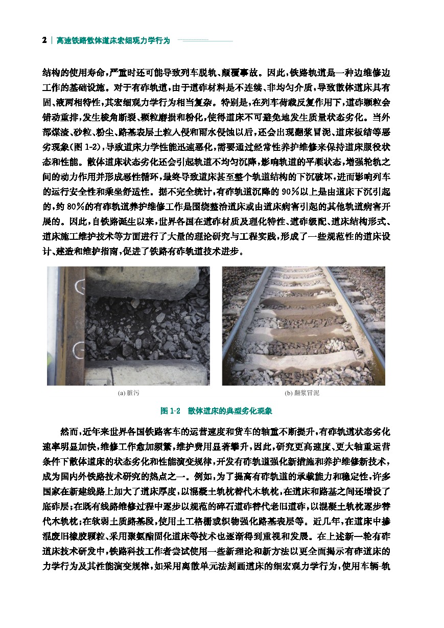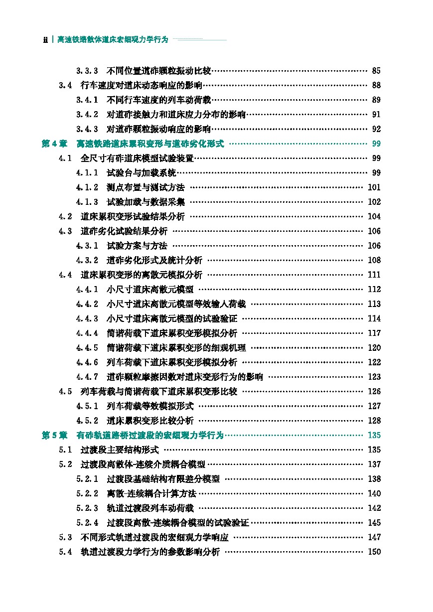 基于上述背景,本书展示了作者所在课题组近年来在国家自然科学基金委-国家铁路局高铁联合基金、国家973计划课题和国家自然科学基金委面上项目的资助下,使用离散单元法、有限差分法、车辆-轨道耦合动力学理论与方法以及道砟集料试验、道床实尺模型试验方法,系统开展高速铁路散体道床宏细观力学行为的研究工作和主要成果。本书主要内容包括铁路道砟材料和集料属性、道床离散元建模与试验验证、高速铁路道床动态响应特性及其宏细观机理、高速铁路道砟劣化形式和道床累积变形规律、有砟-无砟轨道过渡段细观力学行为、道床养护维修过程力学行为模拟及其工程应用。