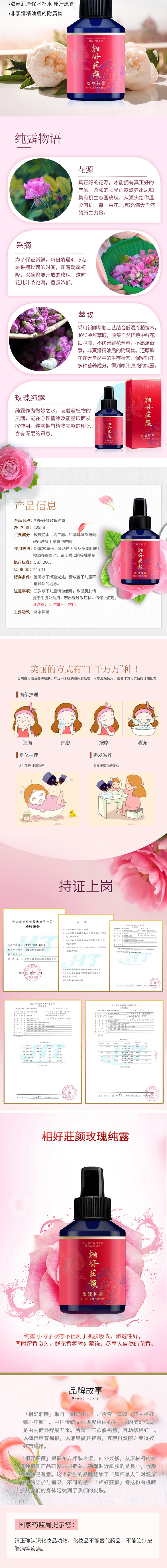 相好莊颜玫瑰纯露原材料选自凤归巢有机种植的食用玫瑰,经过水蒸气蒸馏出油水混合液,经冷凝变成水,分离出精油后的玫瑰活性水。为纯玫瑰提取物,不掺杂香精及保湿剂。