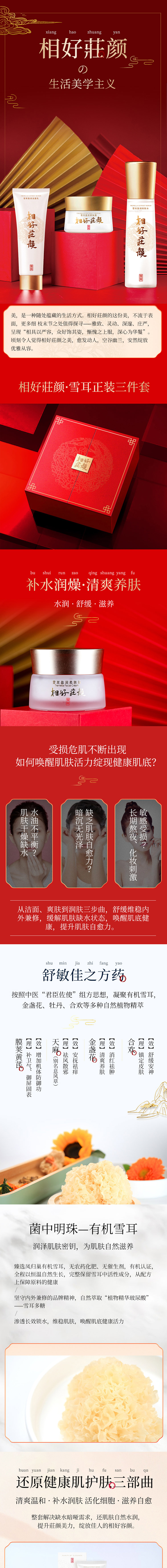 相好莊颜雪耳系列护肤品采用凤归巢有机雪耳作为主原材料,雪耳是“菌中明珠”,无农药化肥、无催生剂全程以恒温自然生长,完整保留雪耳中活性成分,从配方上保障肌肤的健康。萃取的雪耳多糖,拥有“植物透明质酸”美称,除锁水补水外,还能使肌肤柔软嫩滑,同时为肌肤补给充足的营养。