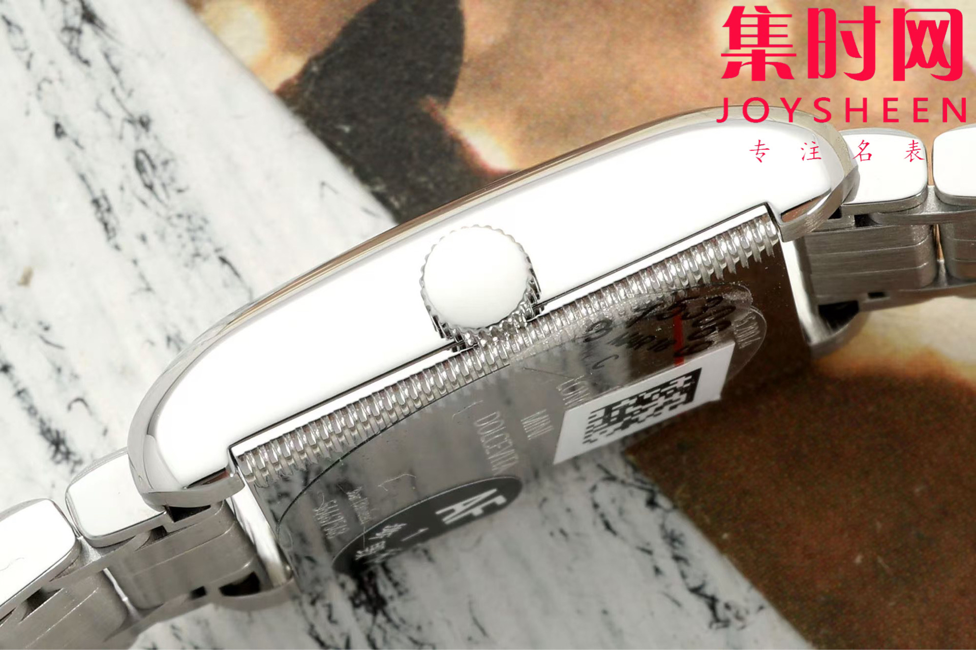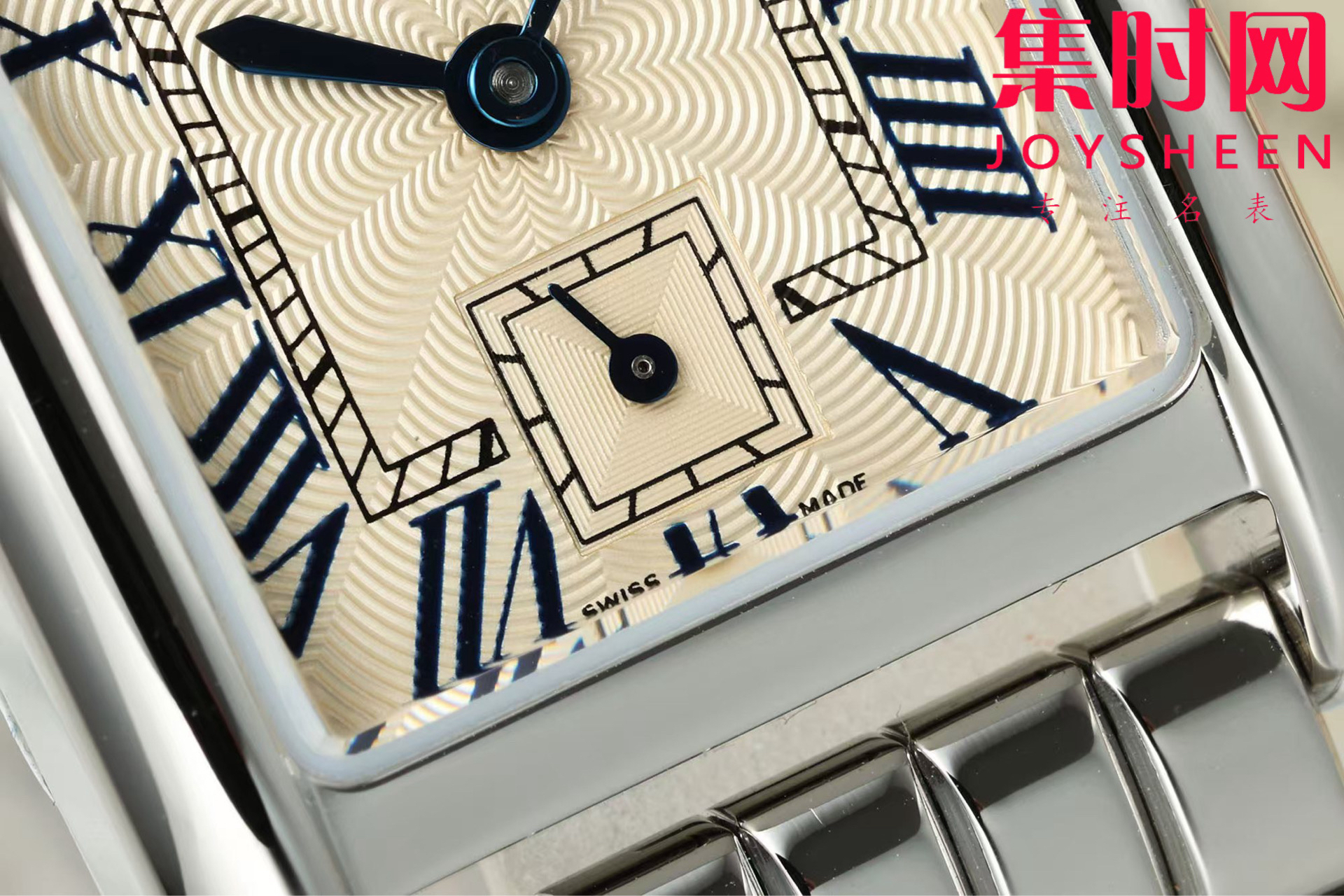 表盘尺寸:21.50毫米x 29.00毫米的矩形精钢表壳,银色矩形罗马表盘,饰以复古放射波纹,表盘以3D 雕刻工艺镌刻简约的几何图形,漆绘罗马数字,搭配蓝钢指针。6点钟位置设方形小秒盘。
