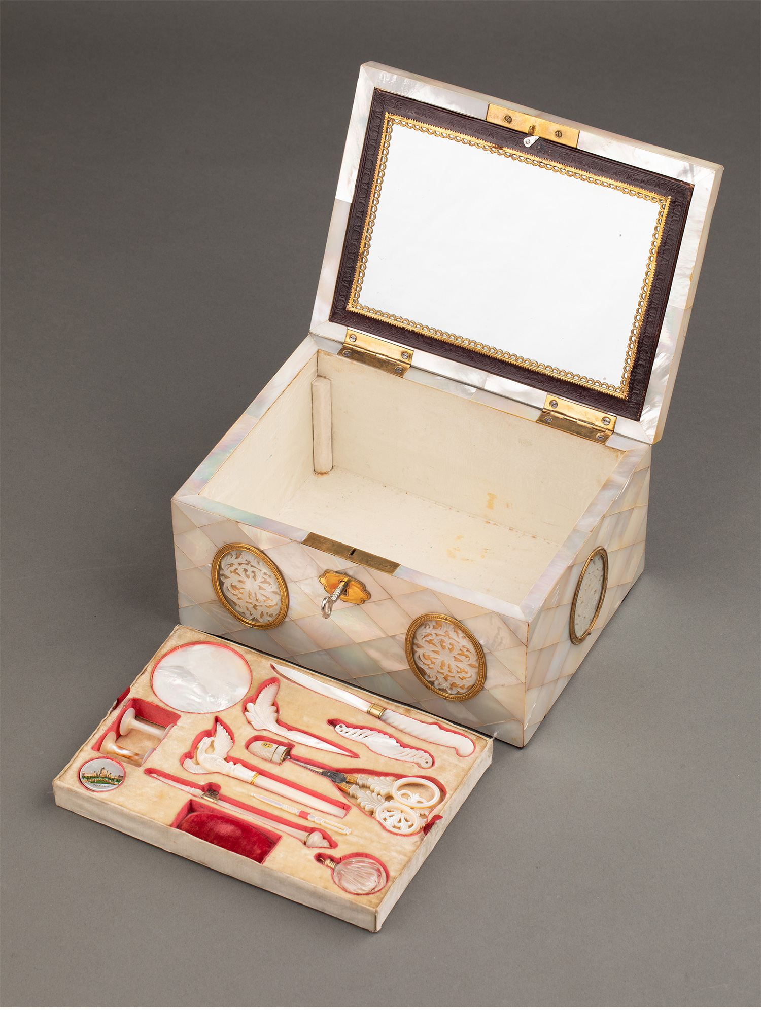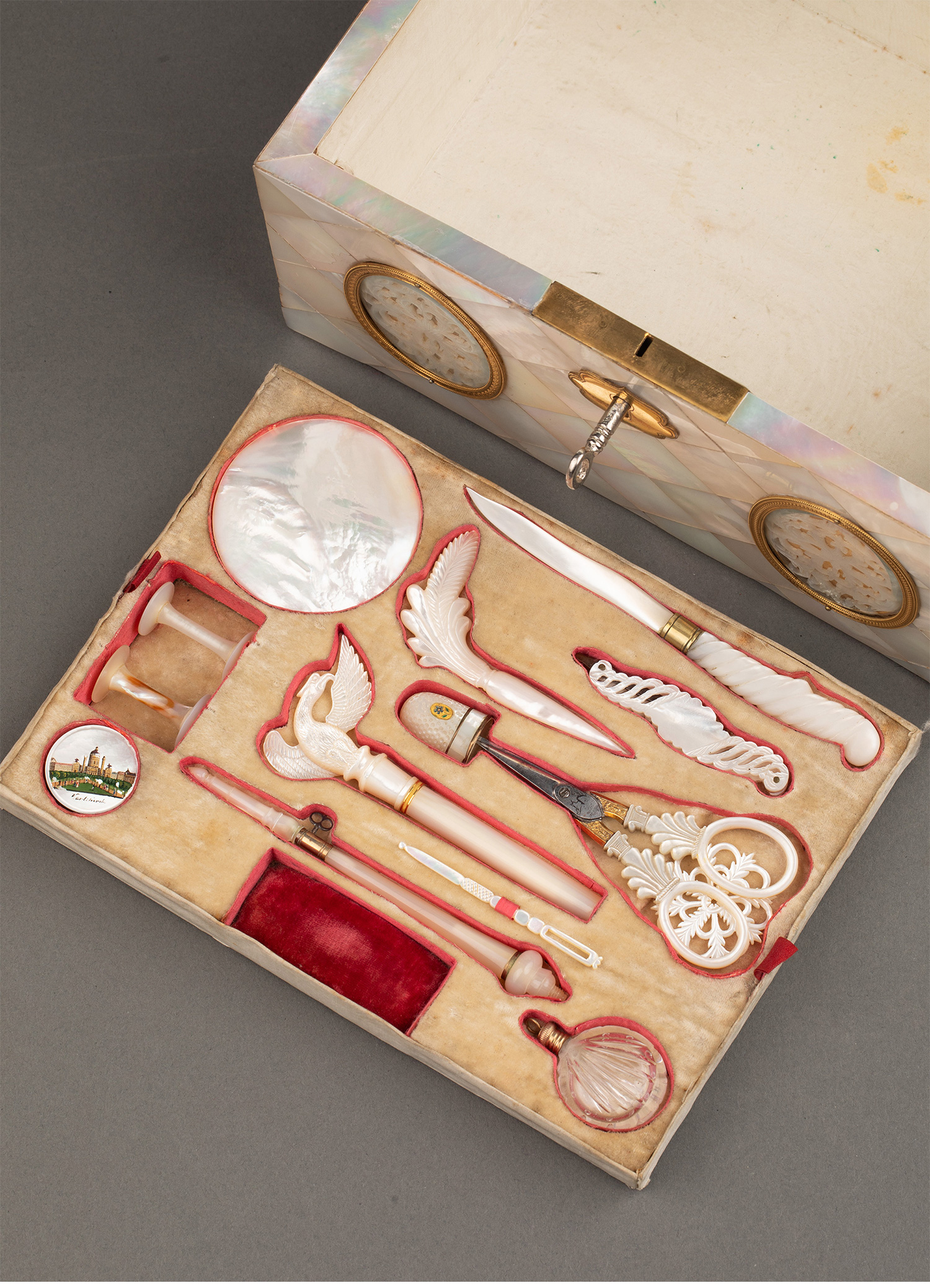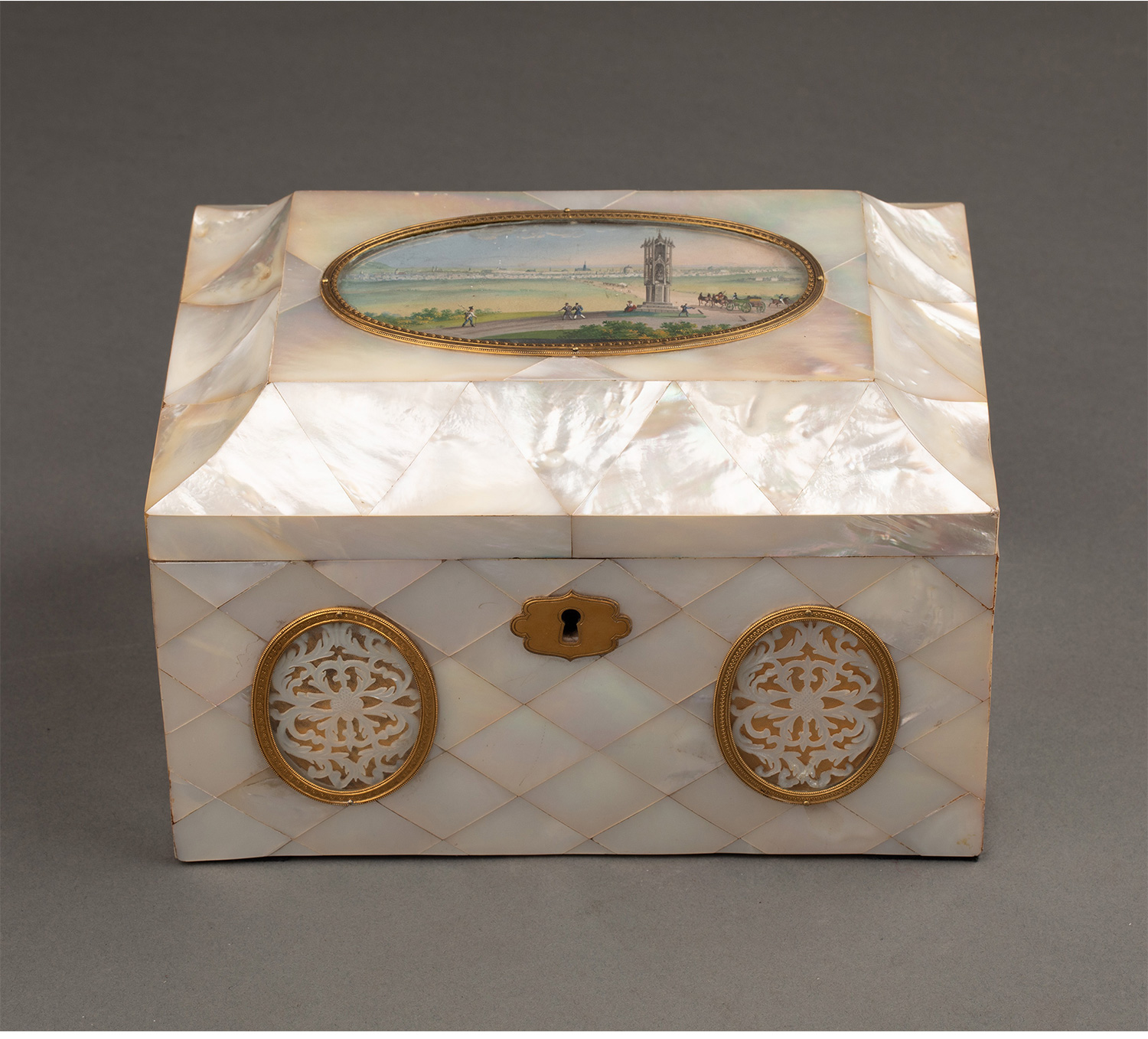 19世纪法国卢浮宫回廊商店出品奥地利艺术家Balthasar Wigand绘《维也纳“十字架上的纺纱者”石塔》细密画外盒装饰铜鎏金嵌母贝缝纫套件