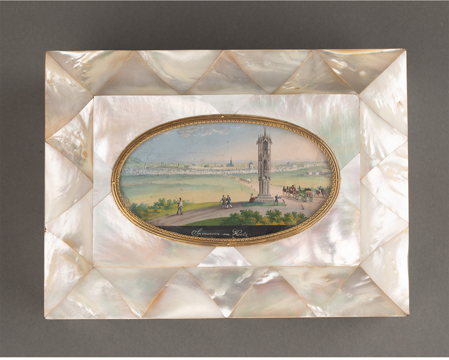 独角鹿西洋古董 19世纪法国卢浮宫回廊商店出品奥地利艺术家Balthasar Wigand绘《维也纳“十字架上的纺纱者”石塔》细密画外盒装饰铜鎏金嵌母贝缝纫套件