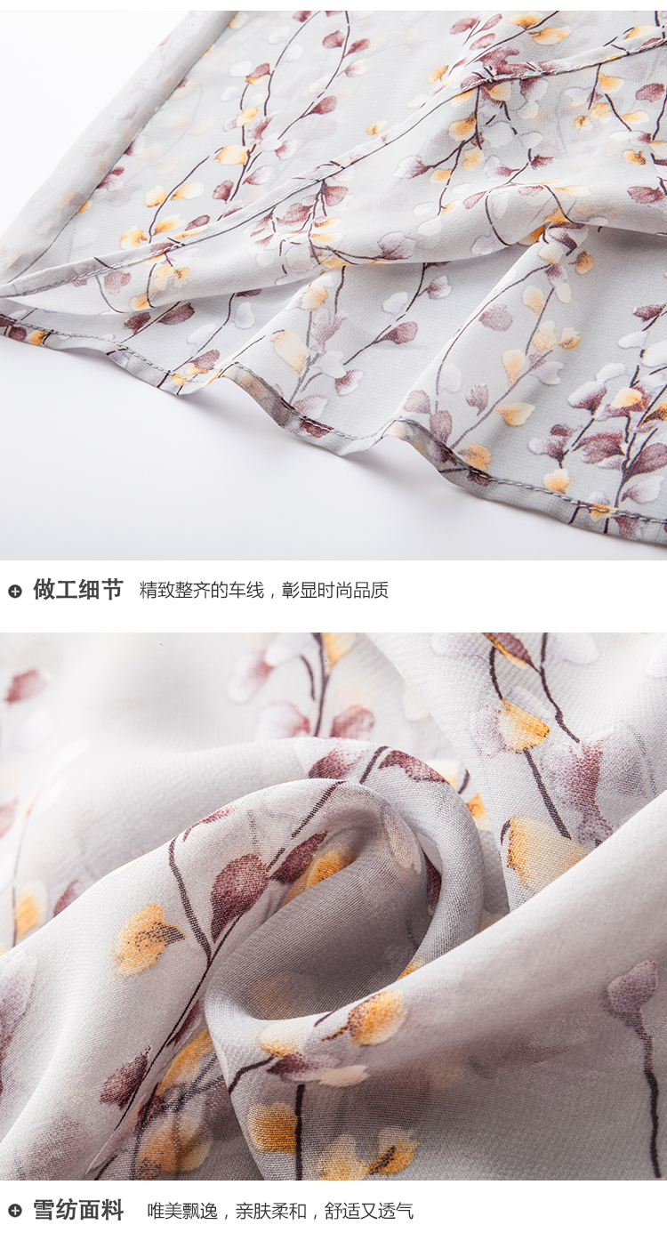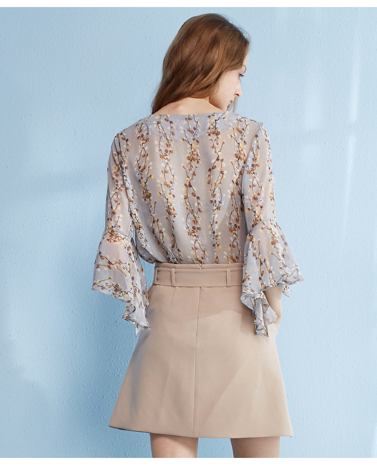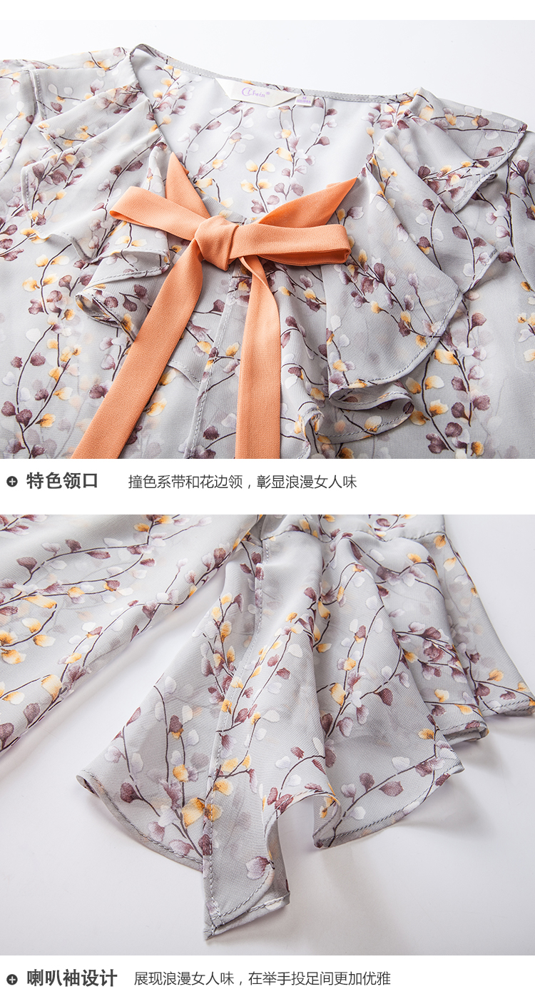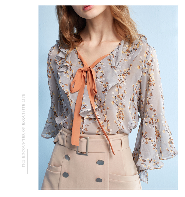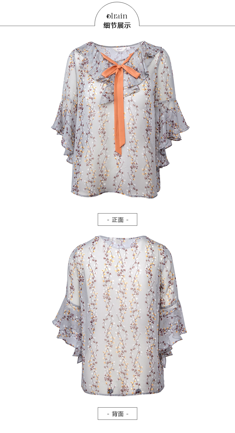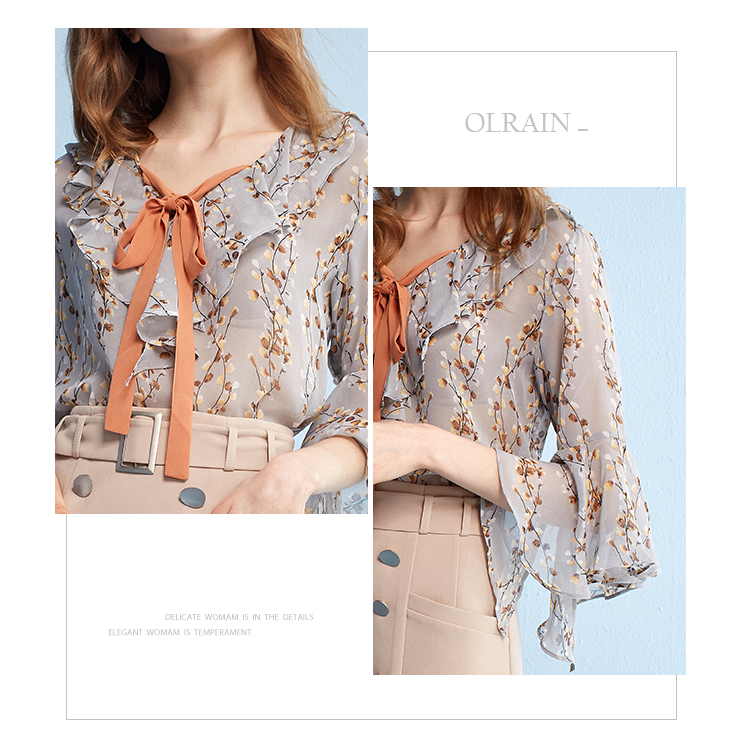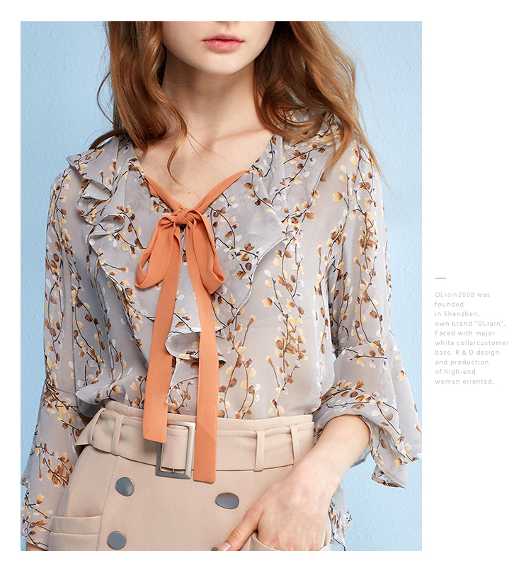 欧芮儿 2018夏装新款女装宽松V领蝴蝶结荷叶边喇叭袖碎花雪纺衫女